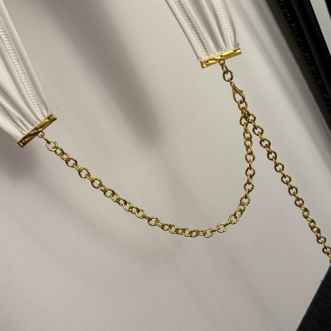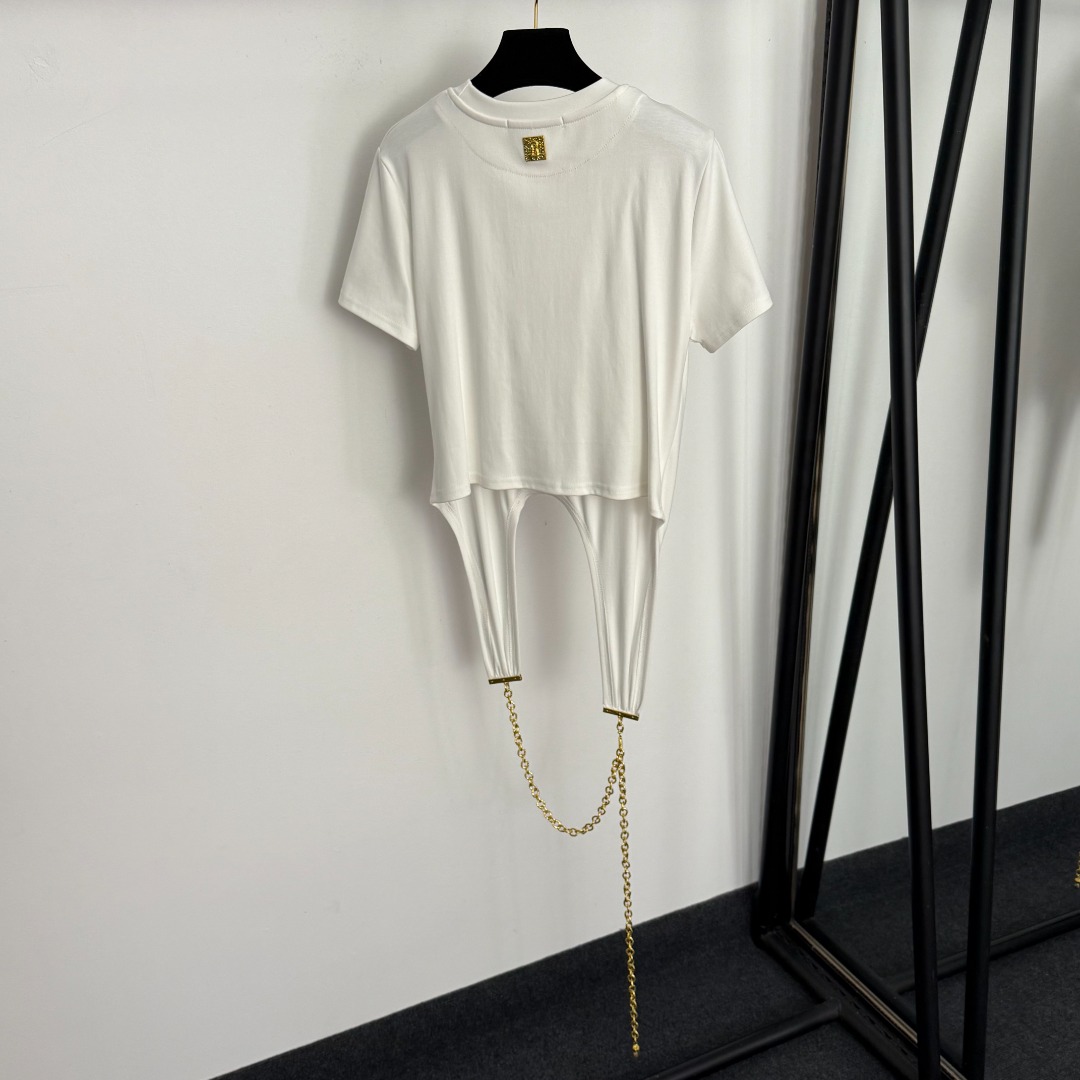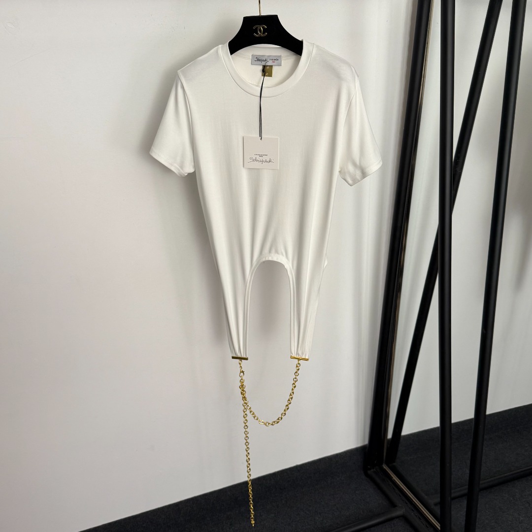 Details: New irregular short-sleeved T-shirt with hardware chain decoration in white, dark brown and black, available in sizes S, M, L