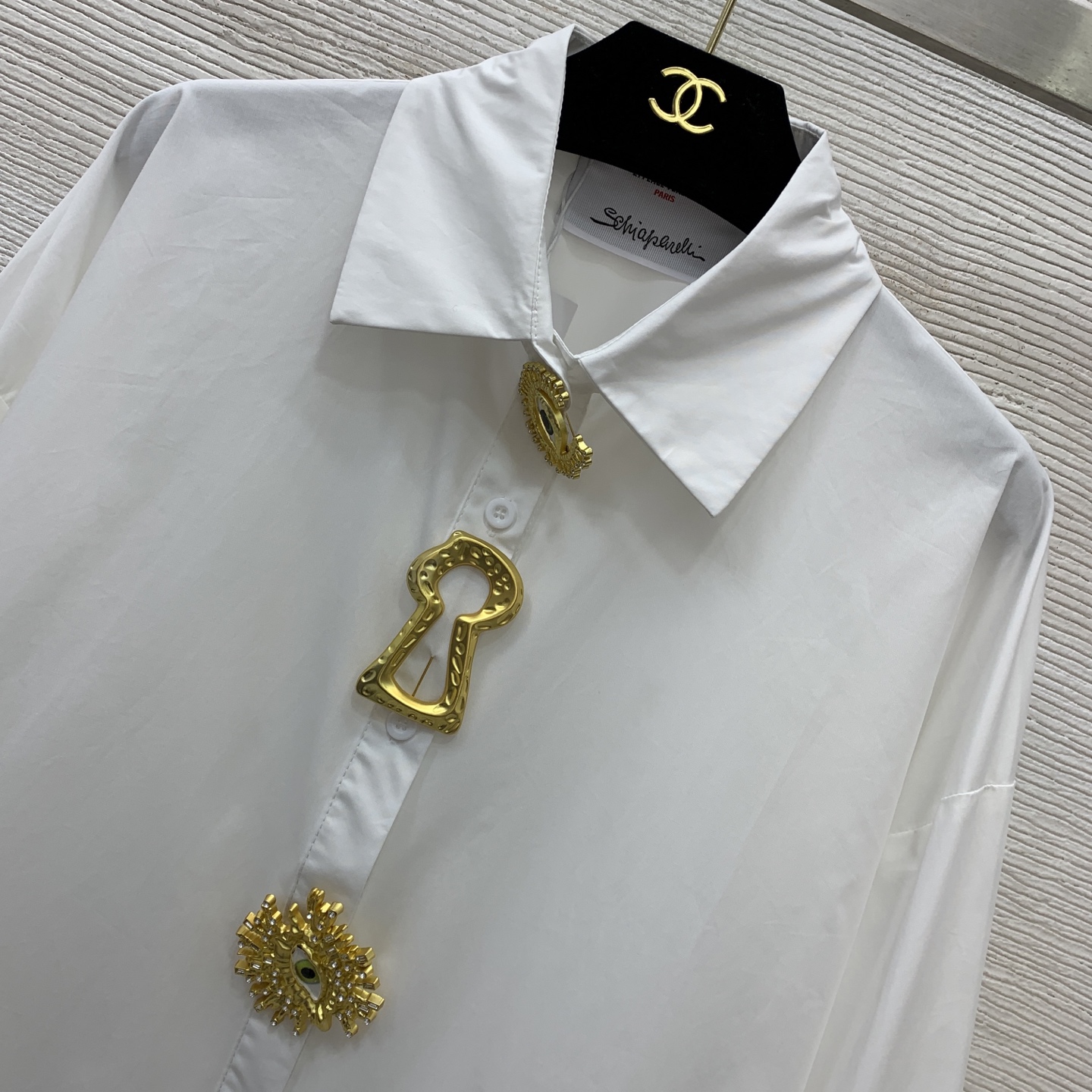 Details: New cotton shirt in black & white, size M. Features detachable gold pins and a loose fit.