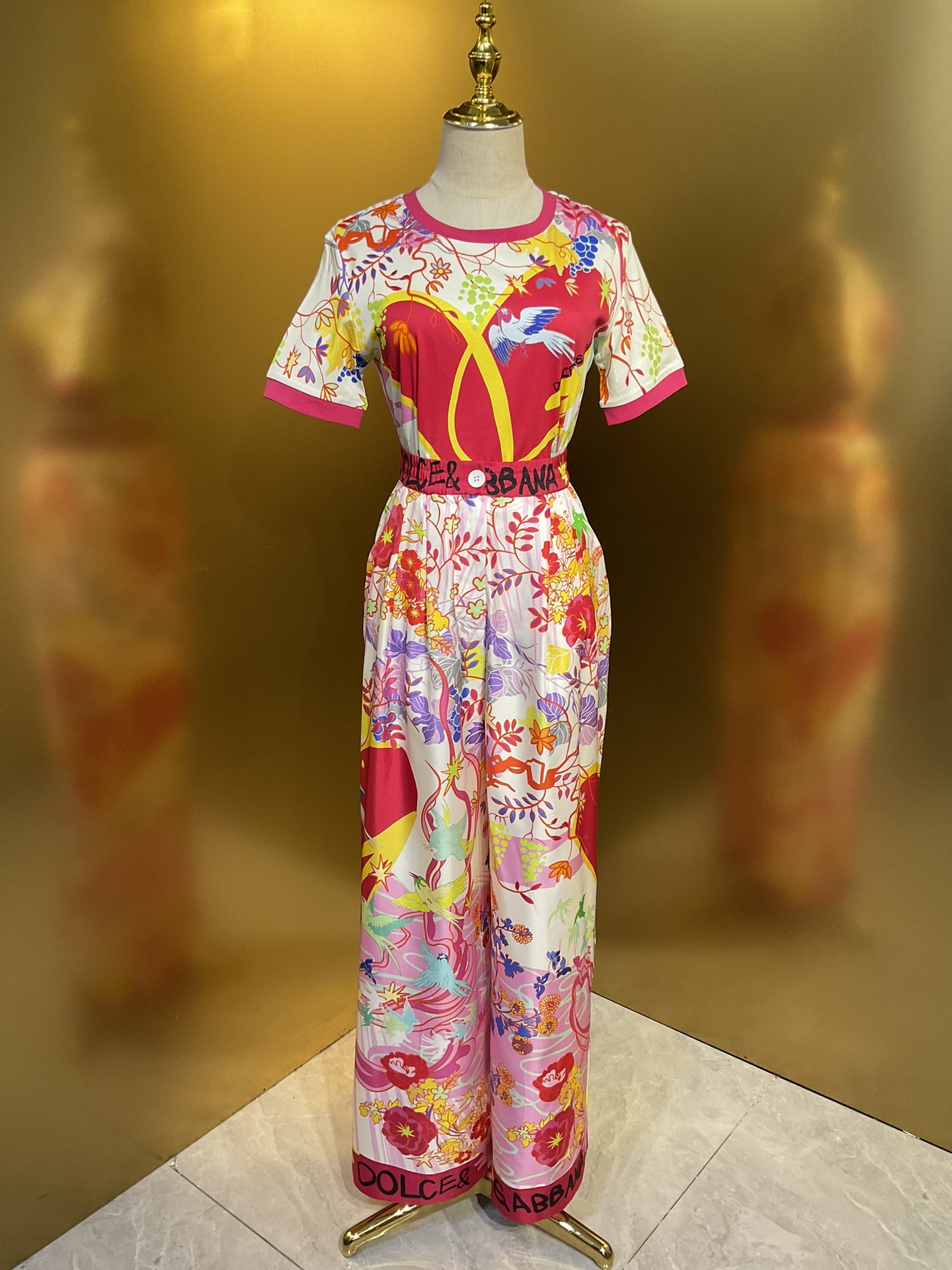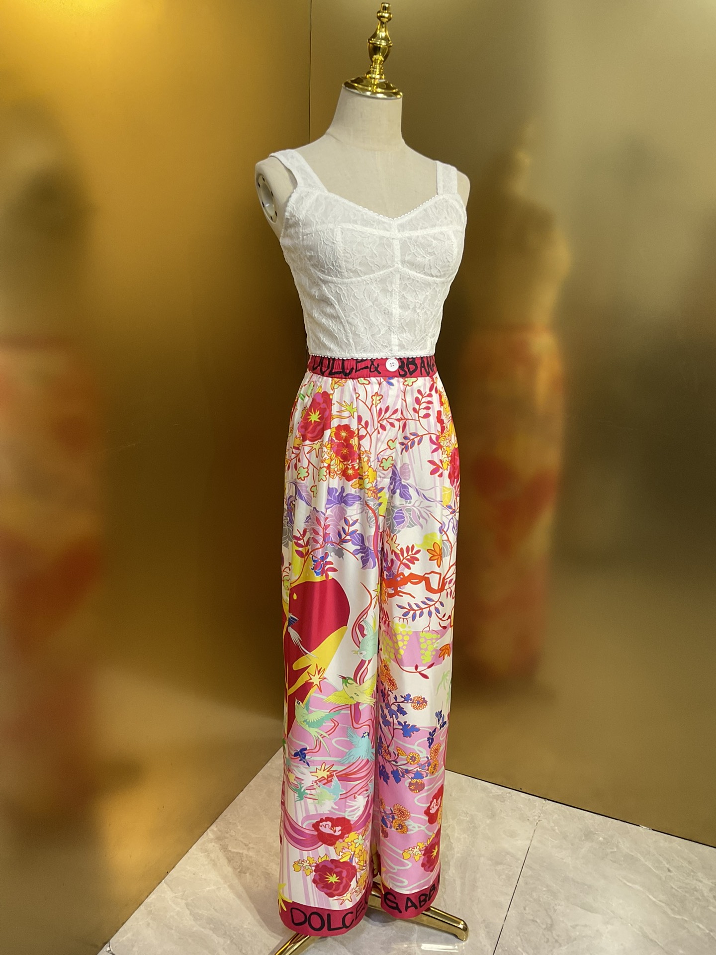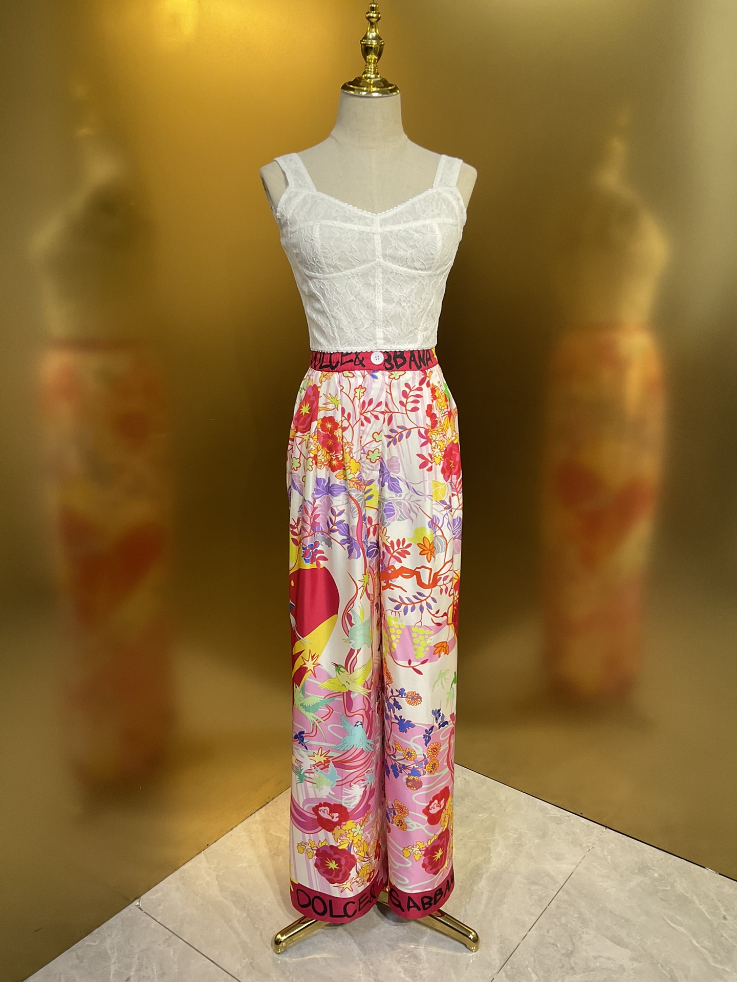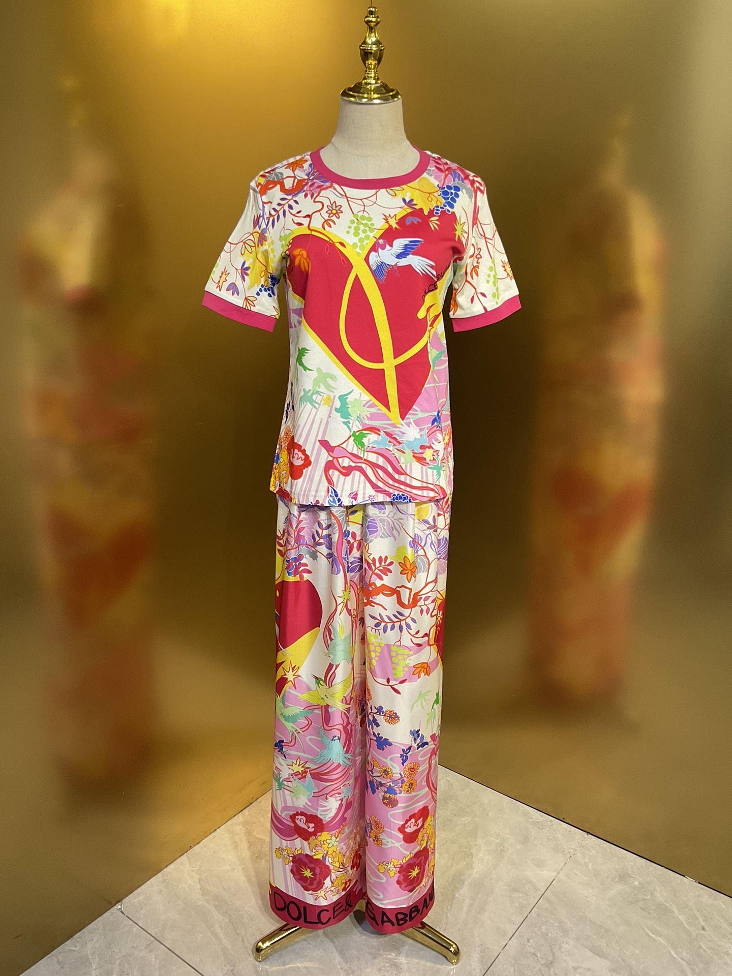 Details: Original flower-heart magpie-bridge series: wide-leg pants and skirt in real silk, paired with a cotton T-shirt and lace bustier, all crafted with high-end customization and fine workmanship for original quality.
