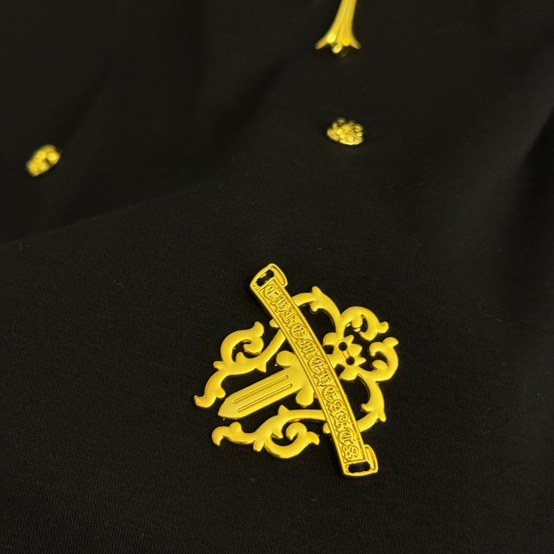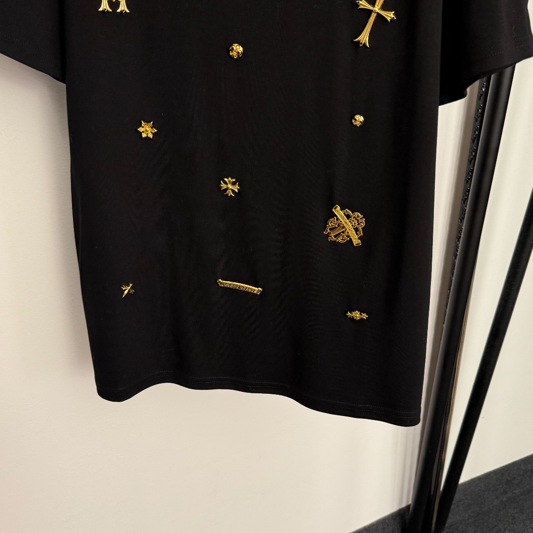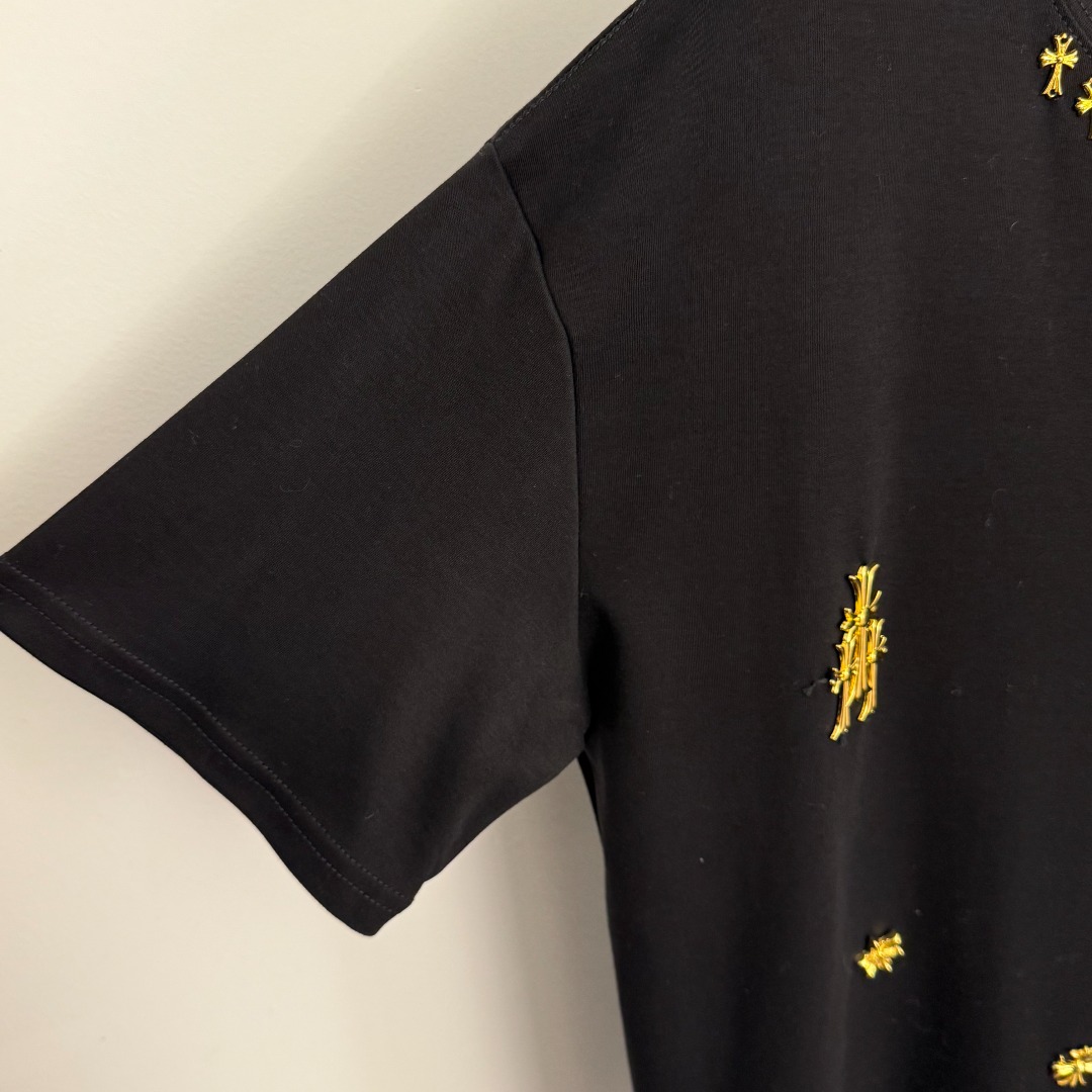 Details: Short-sleeved T-shirt with gold hardware cross logo, available in multiple colors. High-end custom, fine workmanship