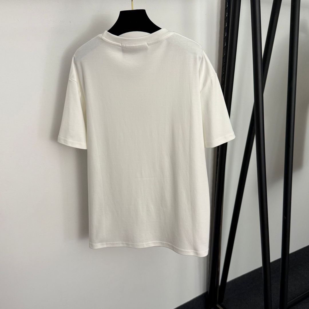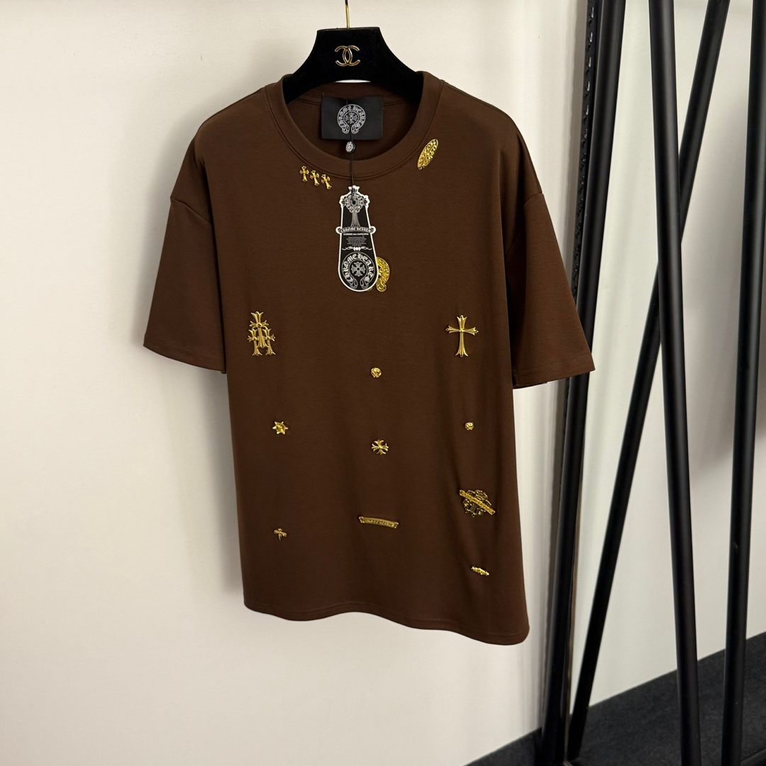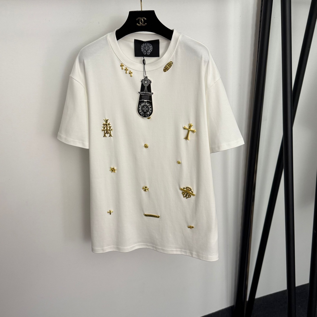 Details: Short-sleeved T-shirt with gold hardware cross logo, available in multiple colors. High-end custom, fine workmanship