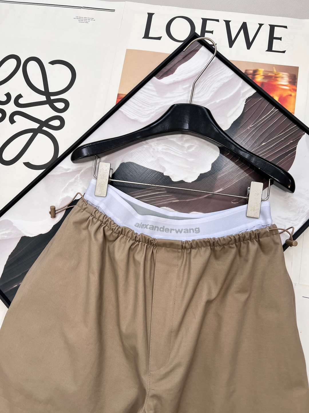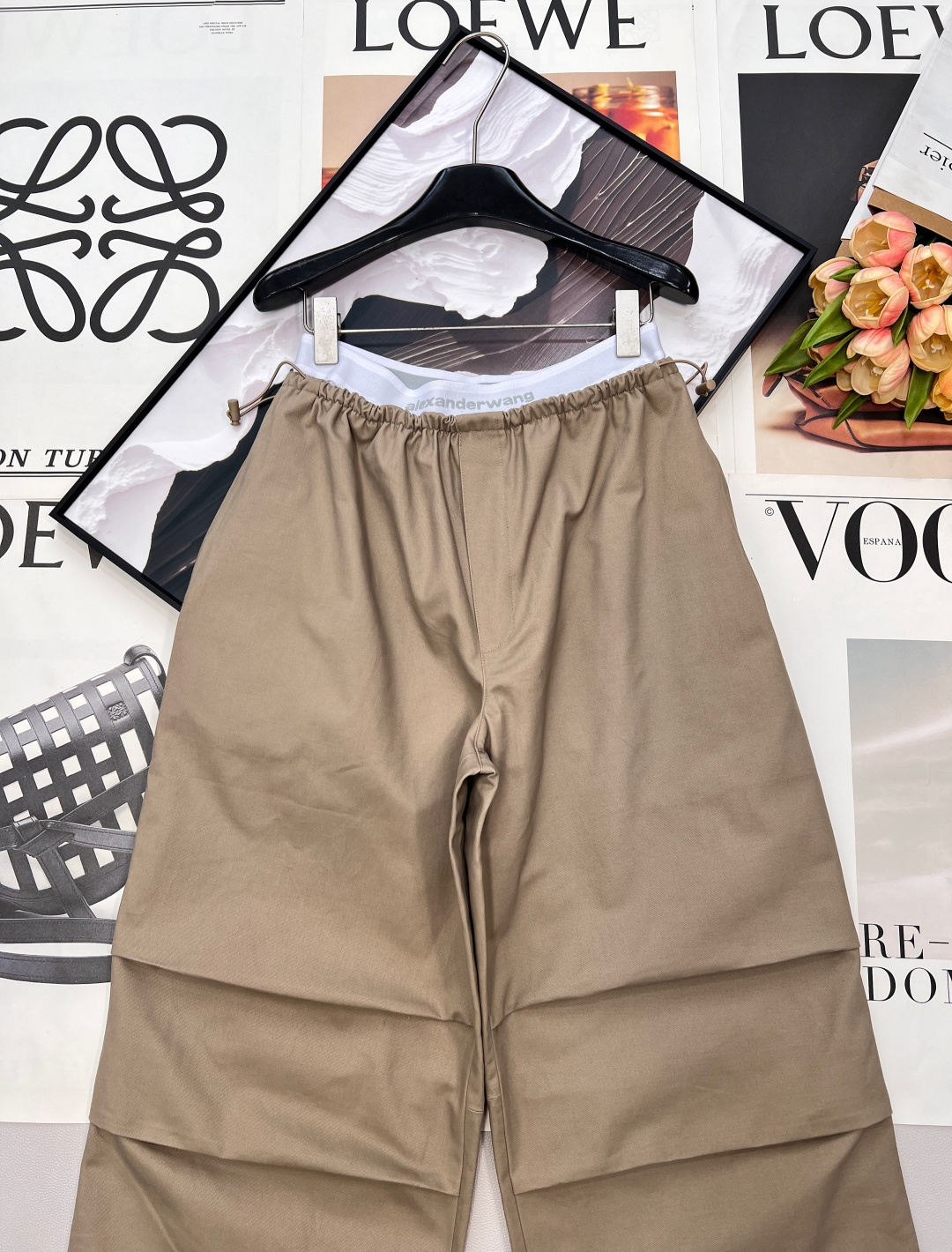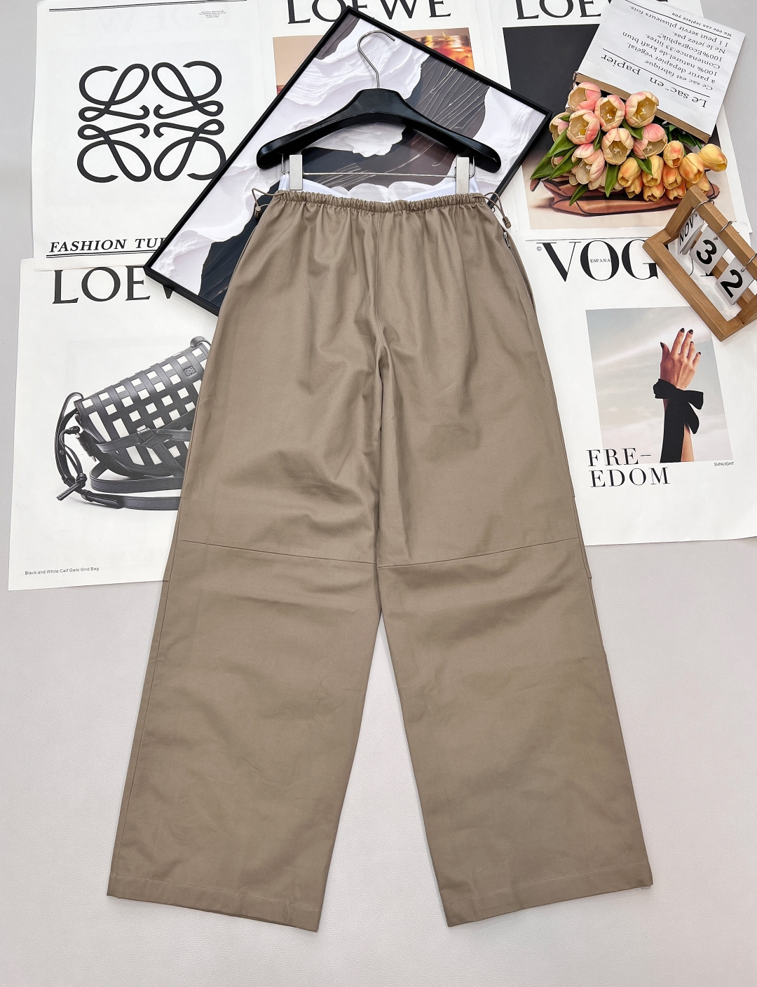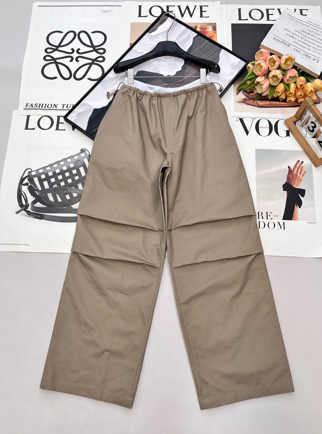 Details: Spring work pants with white-edge waist, two-tone, wide-leg, pleated, drawstring waist, high-end custom, fine workmanship