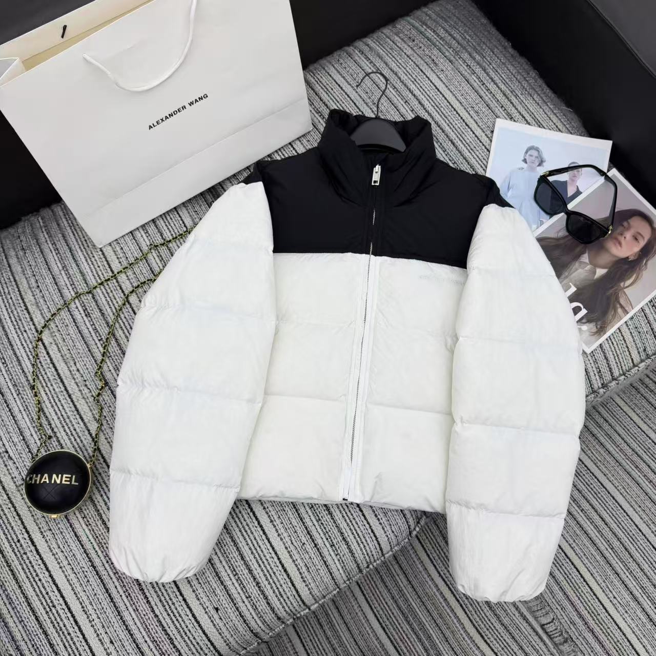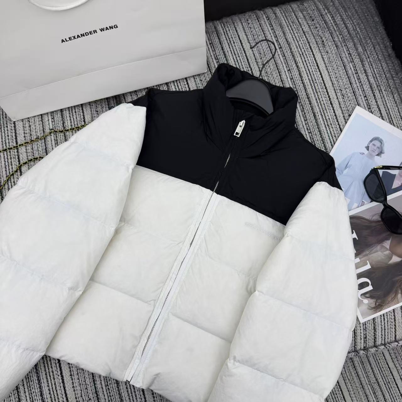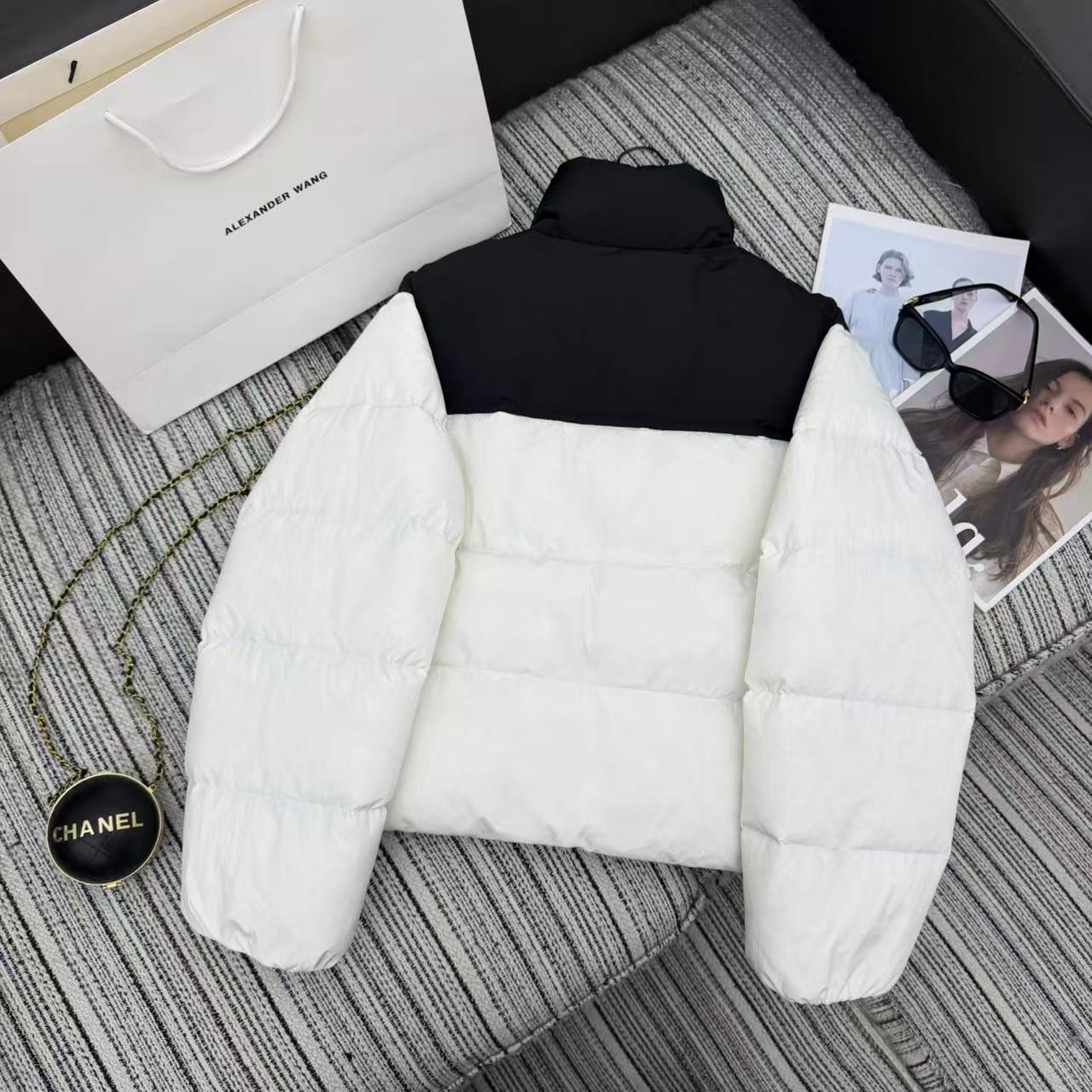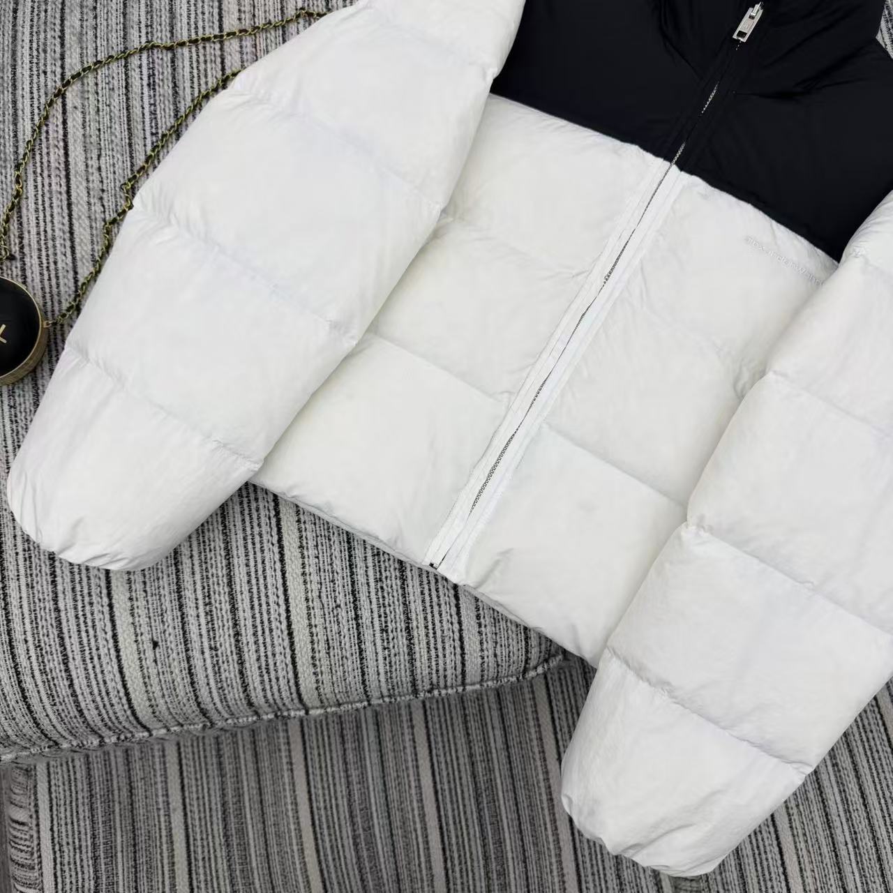 Details: Patchwork long square embossed stand-up collar down jacket, warm & lightweight. High-end custom, fine workmanship