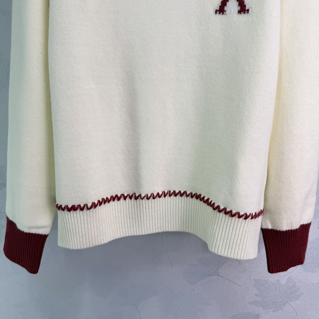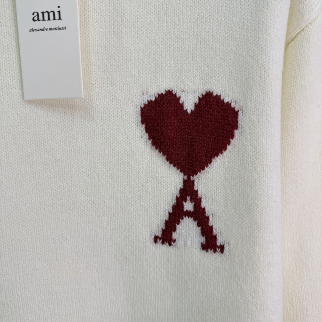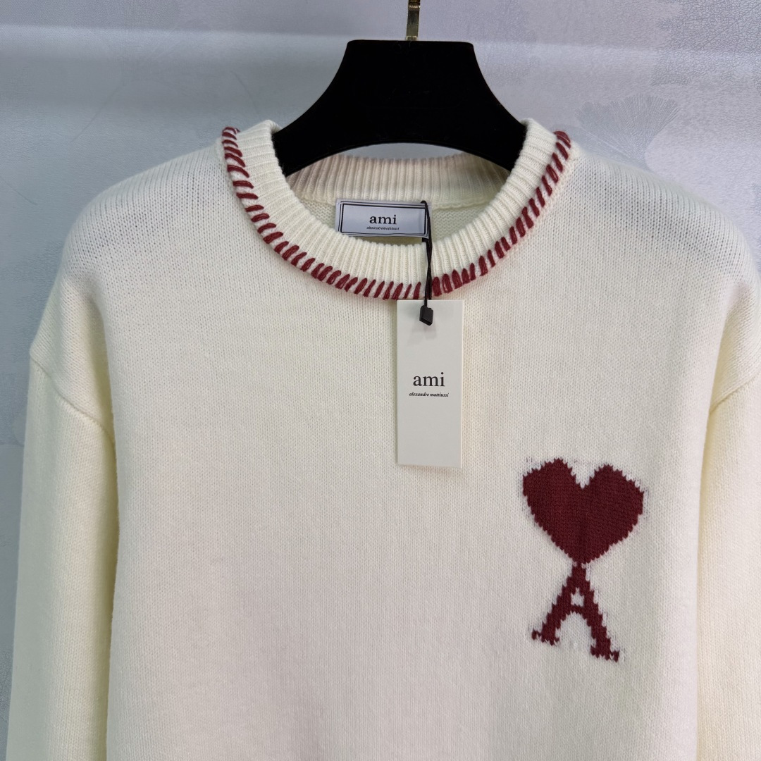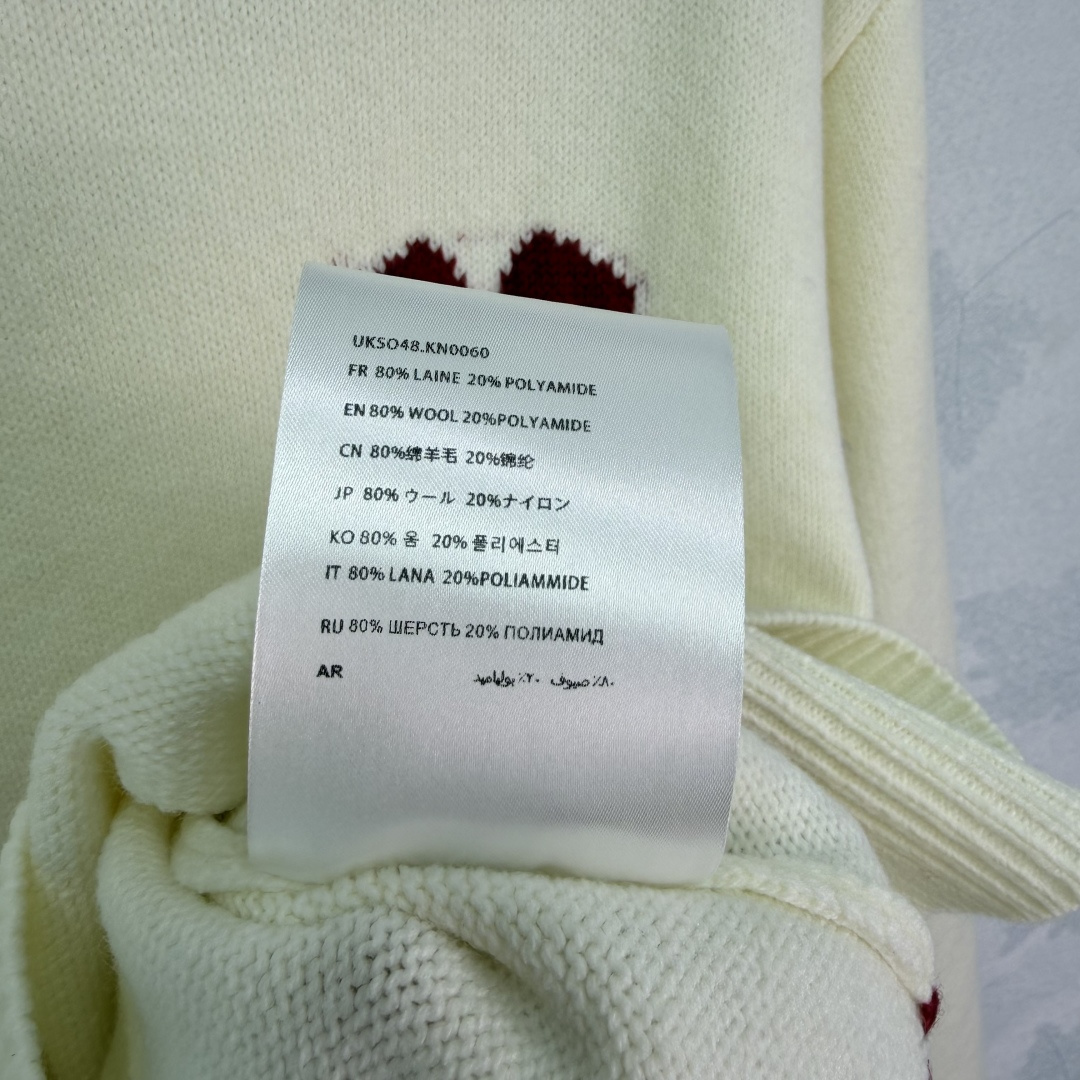 Details: Horse-year limited edition heart-shaped sweater with red and blue stitching, made of a soft wool blend. It has a festive and cozy design.