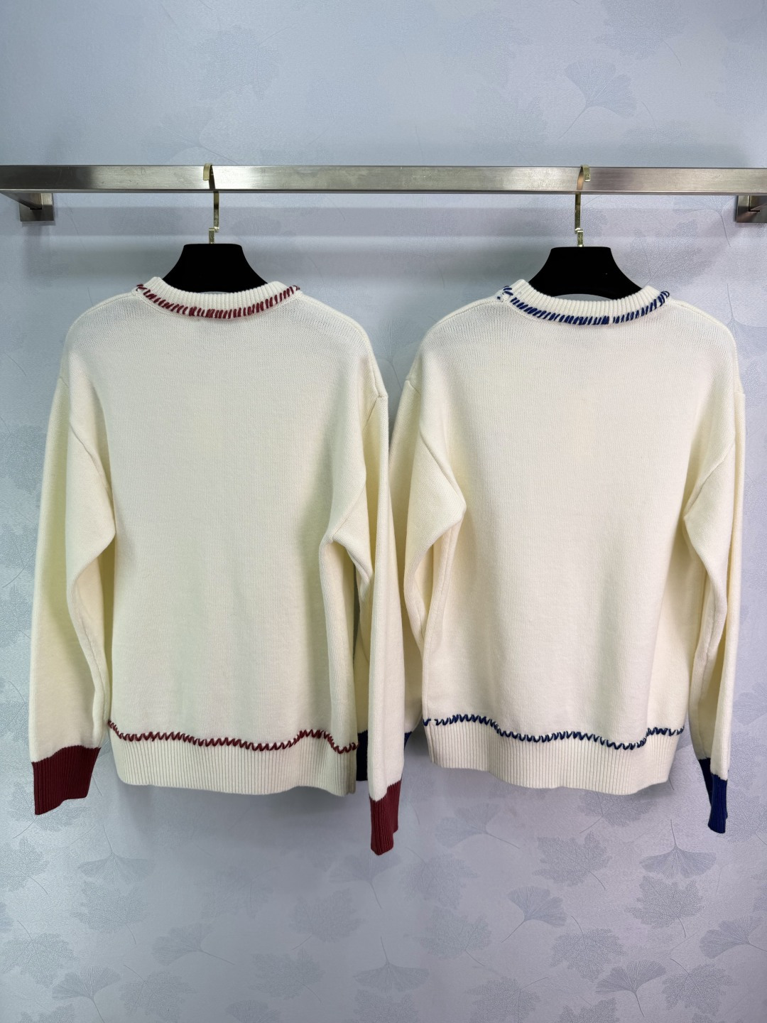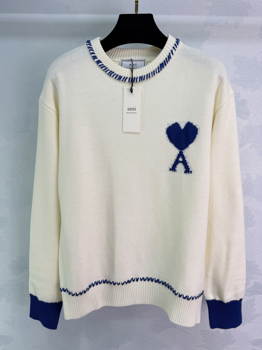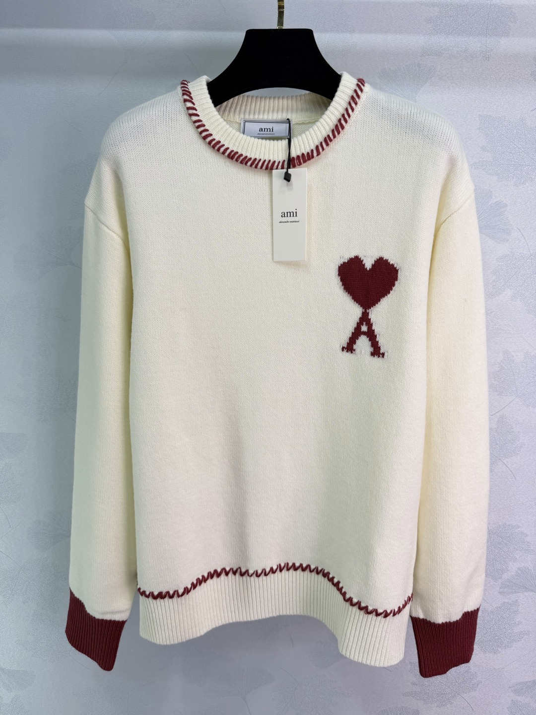 Details: Horse-year limited edition heart-shaped sweater with red and blue stitching, made of a soft wool blend. It has a festive and cozy design.