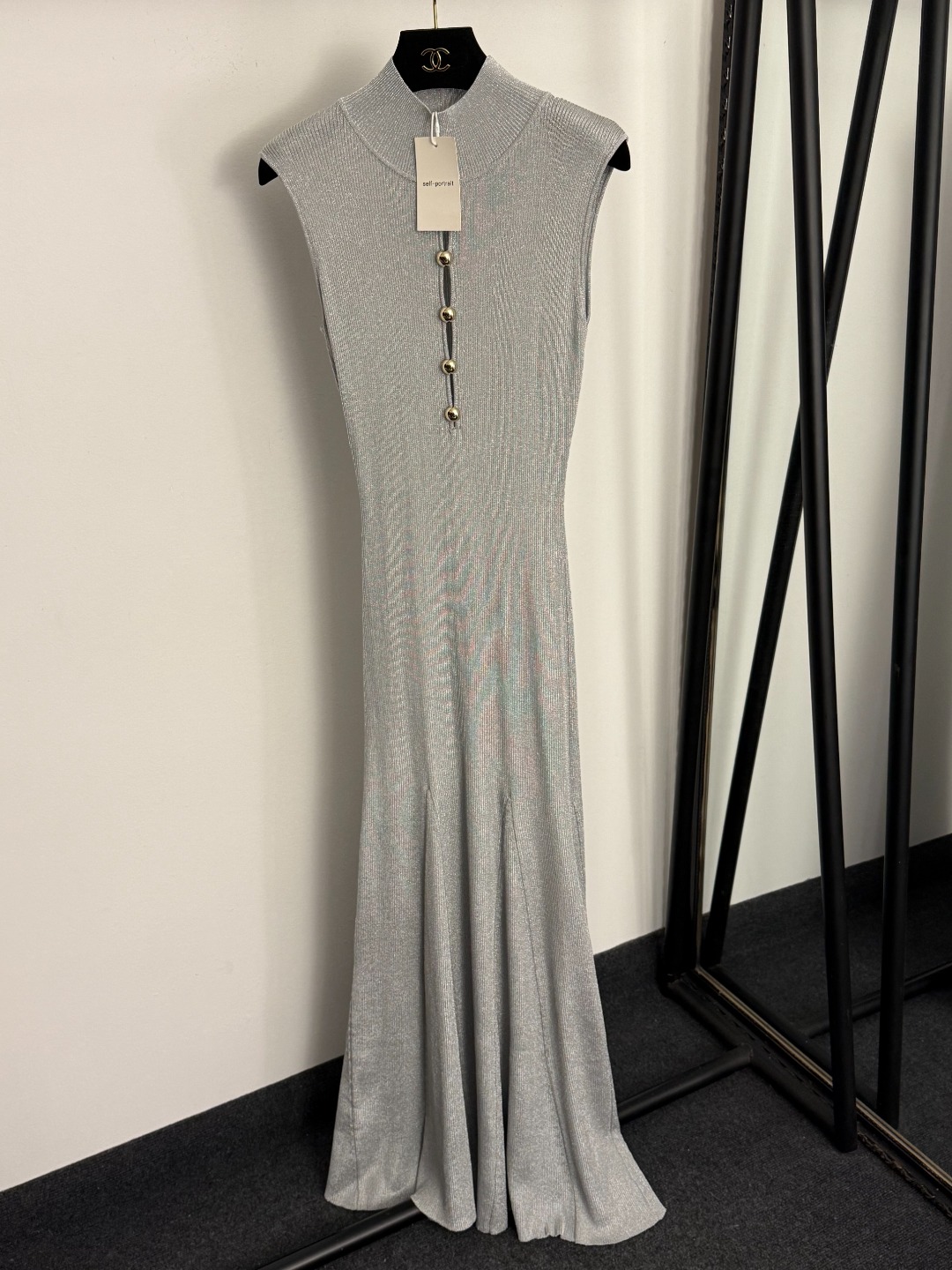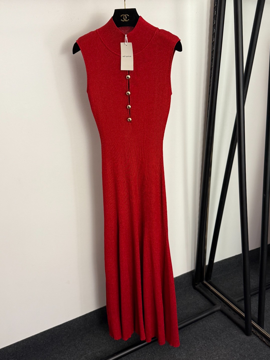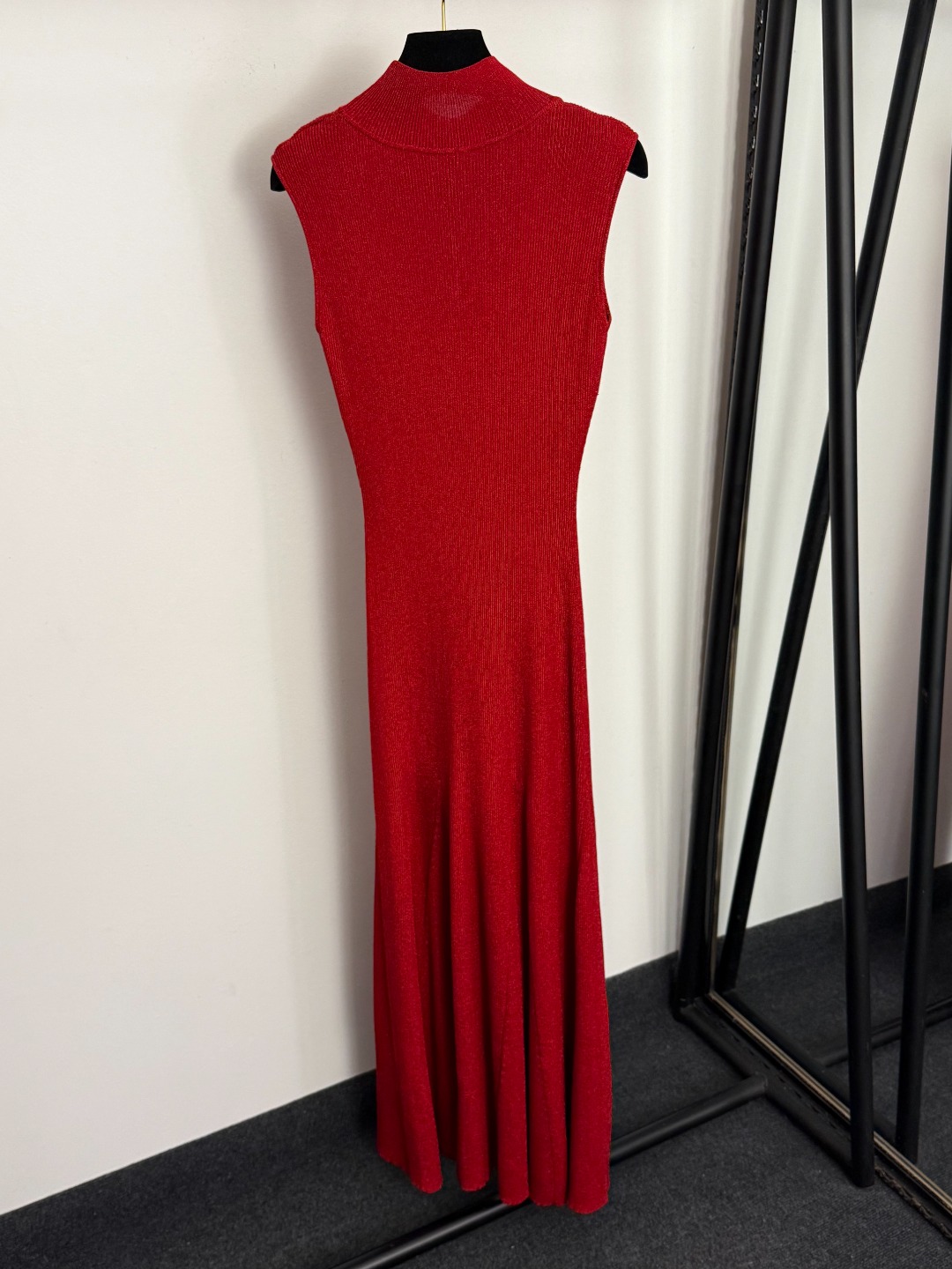 Details: New gold bead button front hollow bright silk blended high-neck knitted vest dress in gray, red or khaki, sizes S, XL, M.