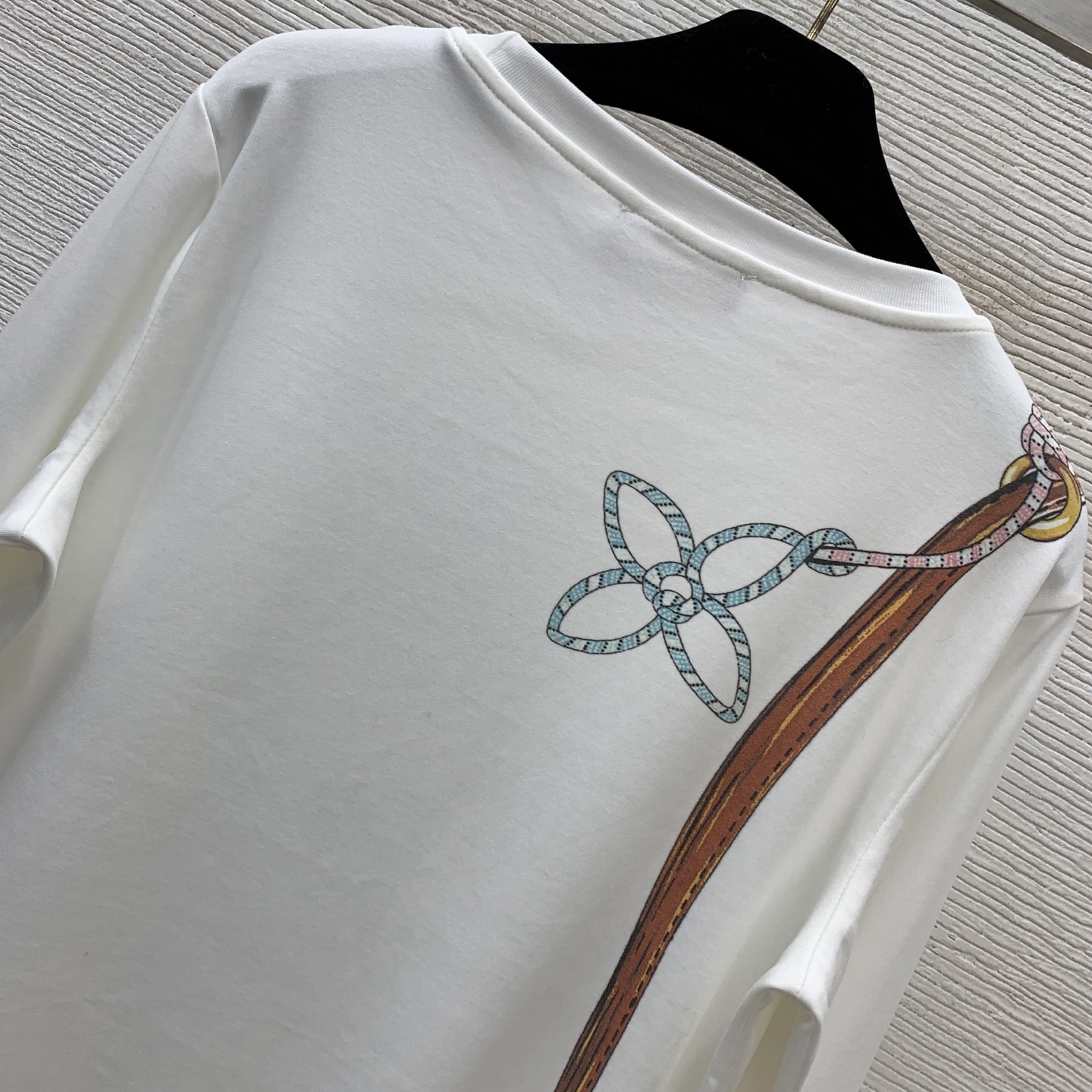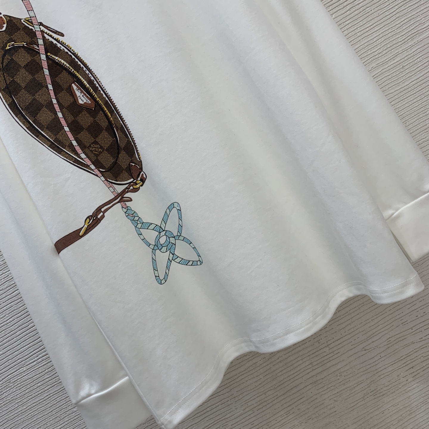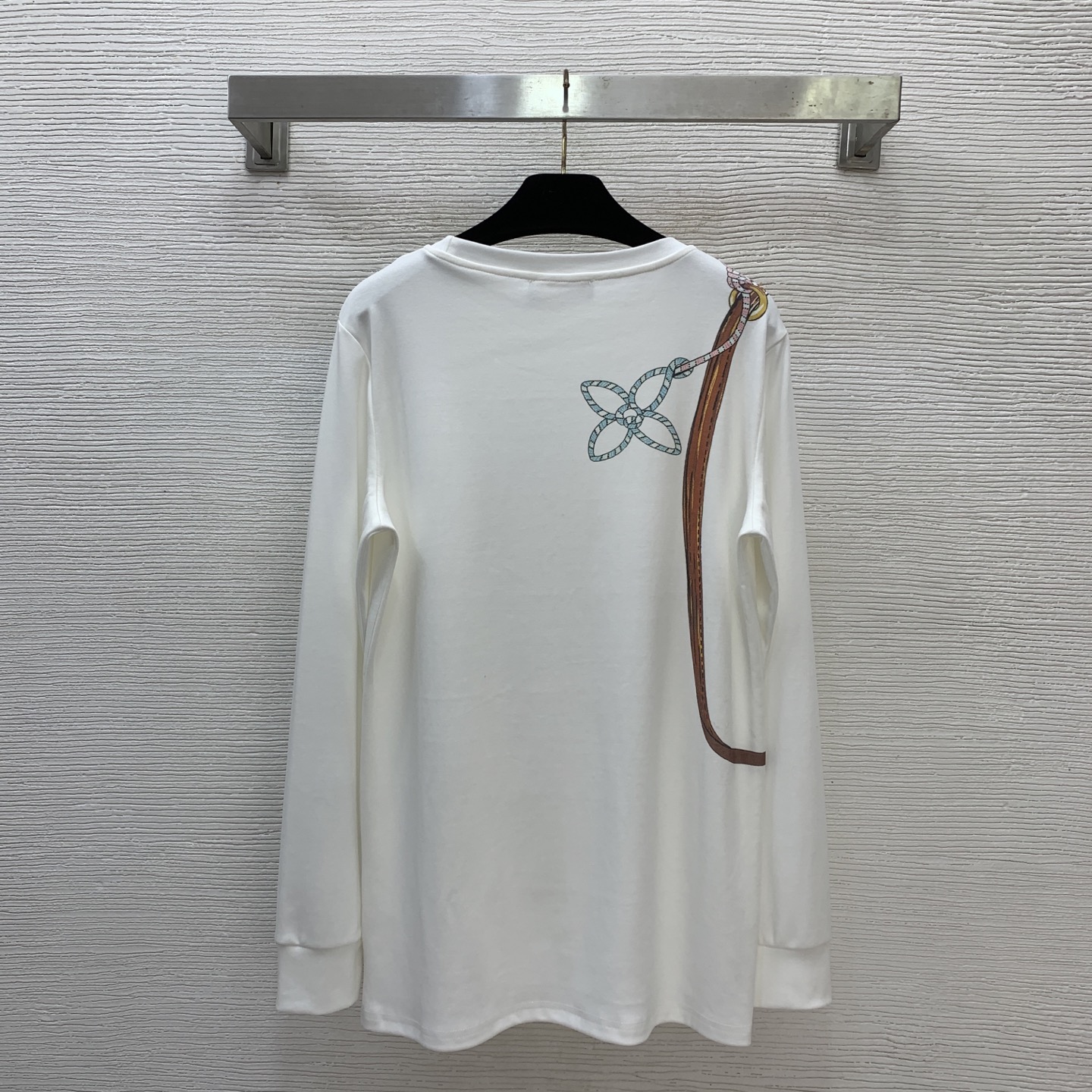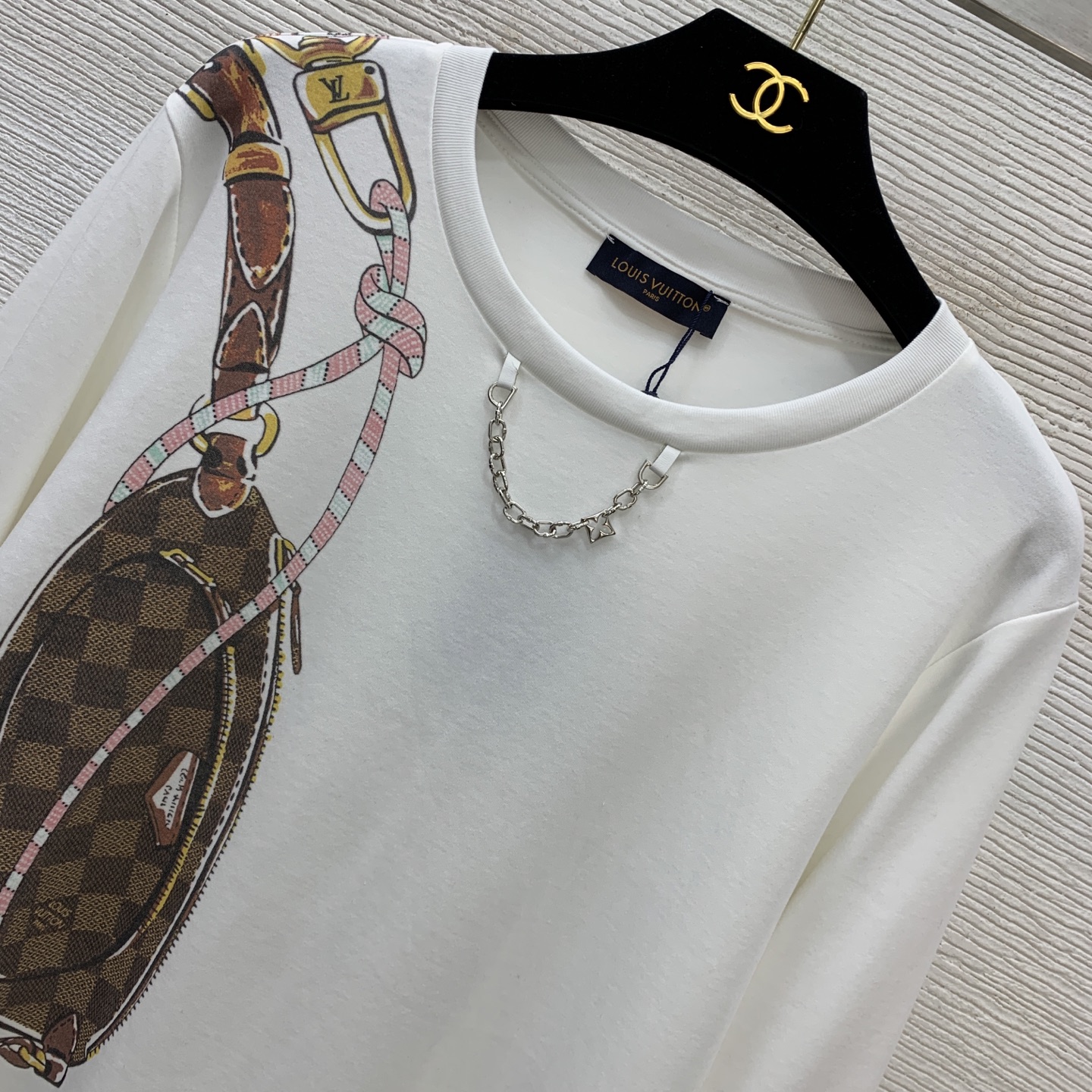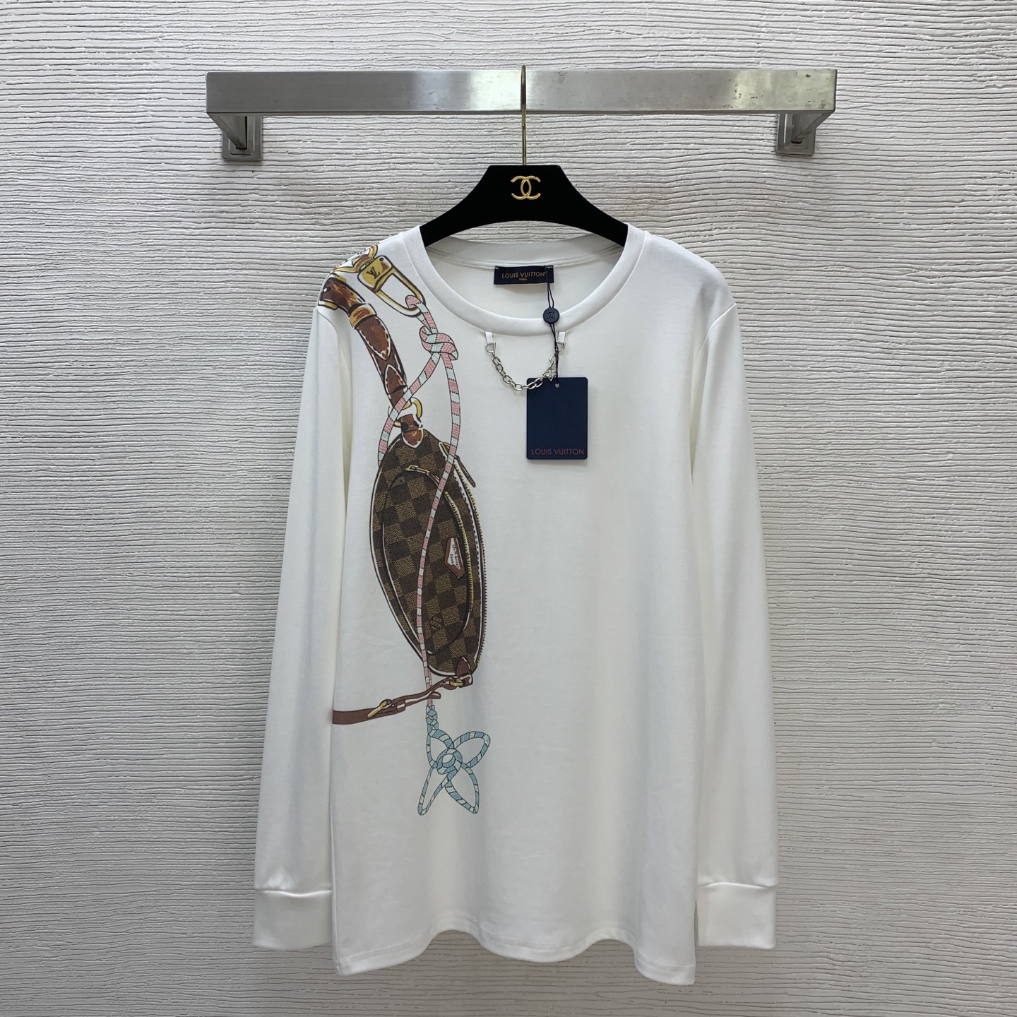 Details: Early Spring New Long - sleeve T - shirt with Lock Bag Pattern and Silver Chain, White, Available in M Size, High - end Customization