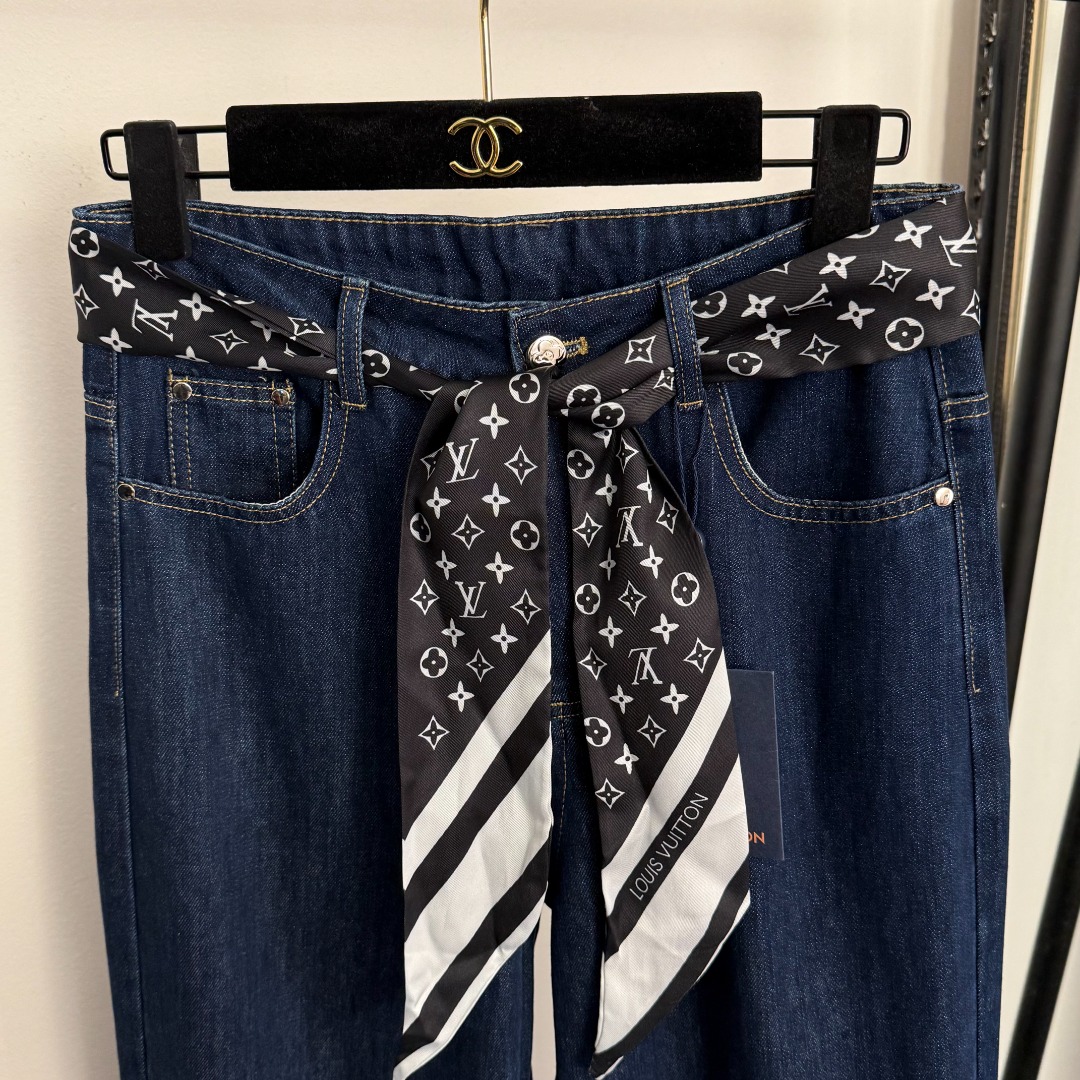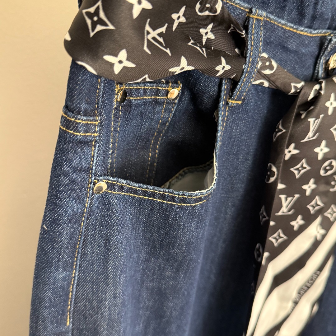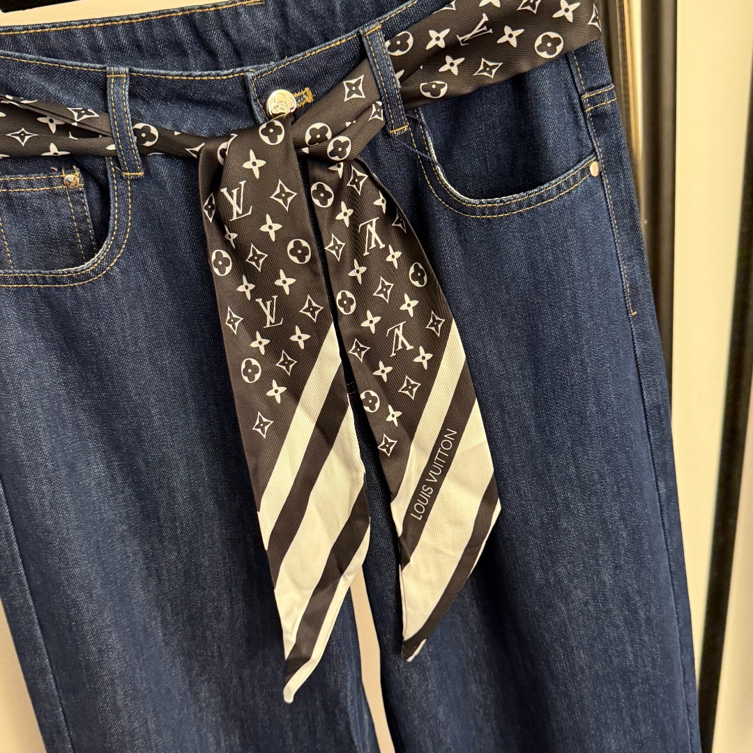 Louis Vuitton New Monogram Logo Scarf Belted High-Waisted Slimming Jeans in Blue