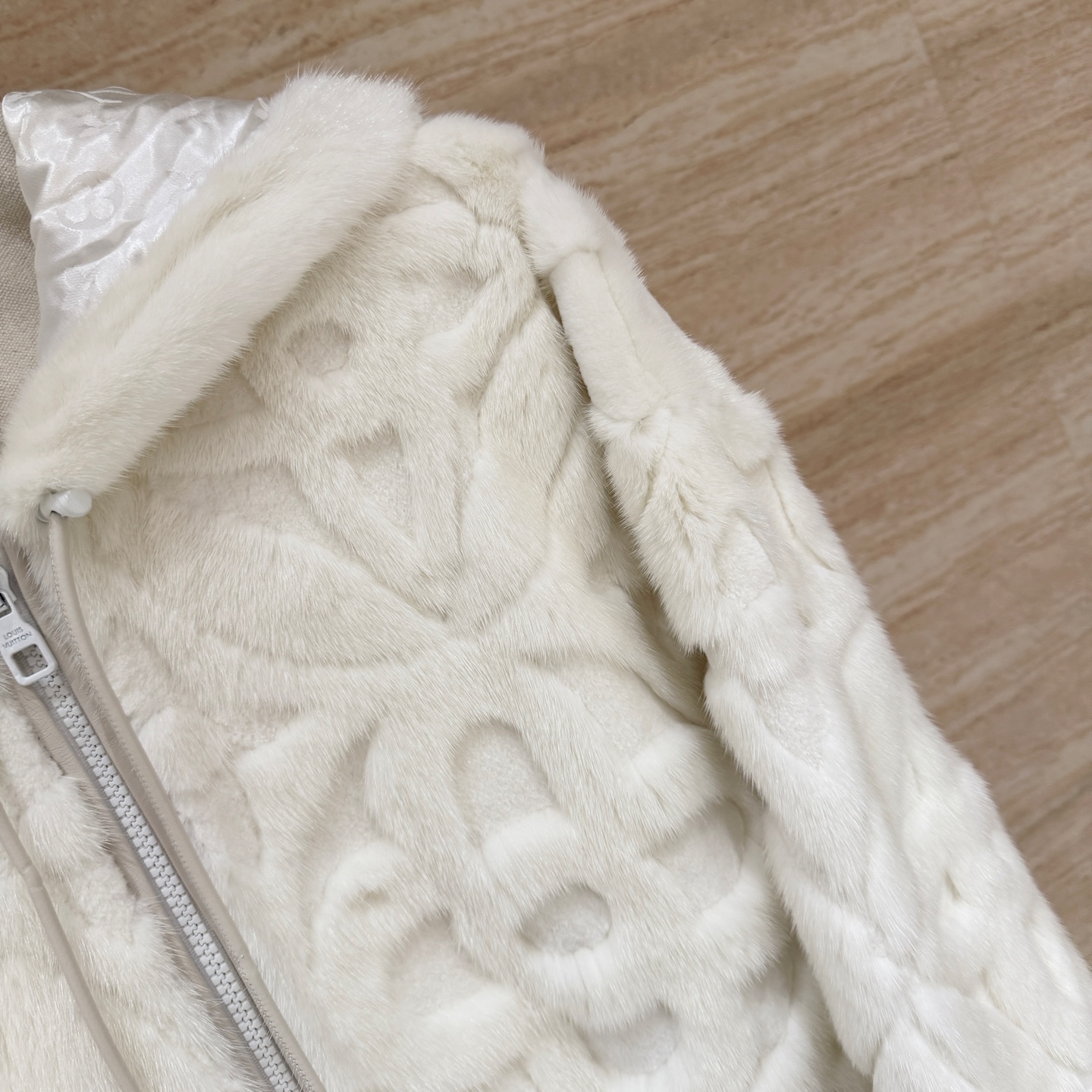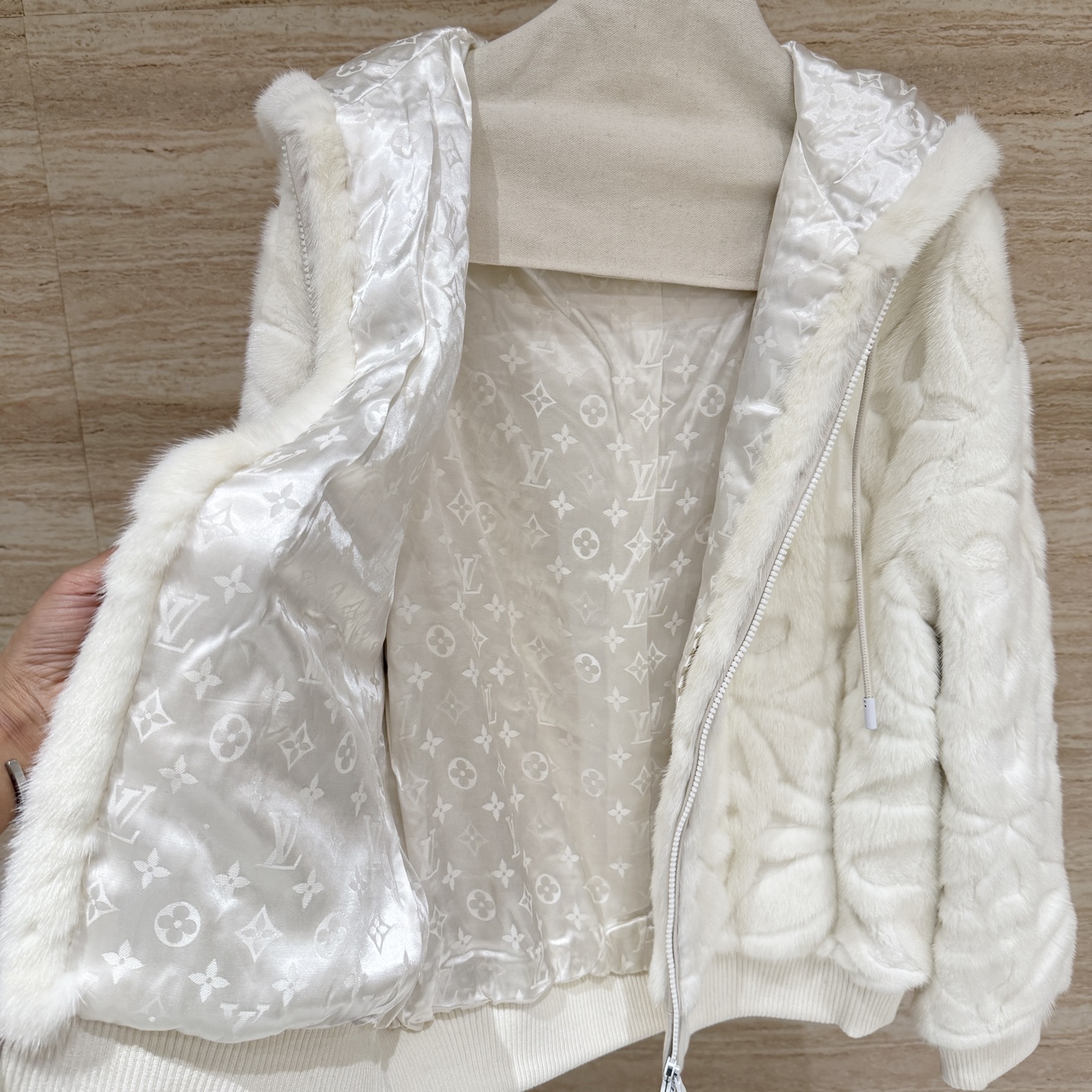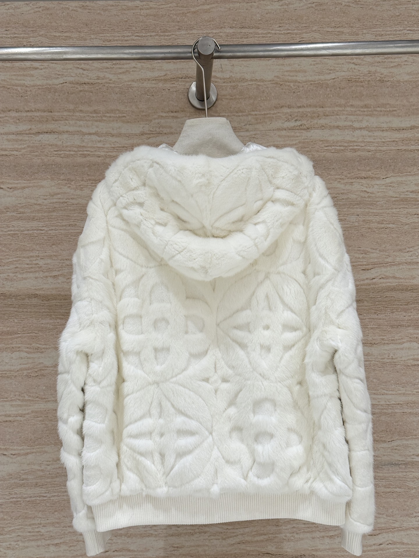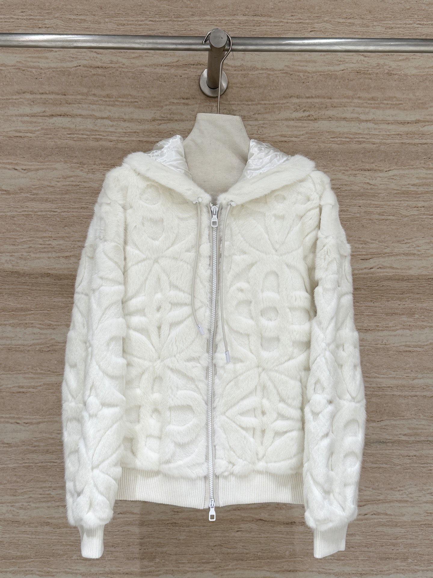 Details: Classic monogrammed heavy embossed hooded mink coat, unisex, imported mink, loose fit, sizes 36-42