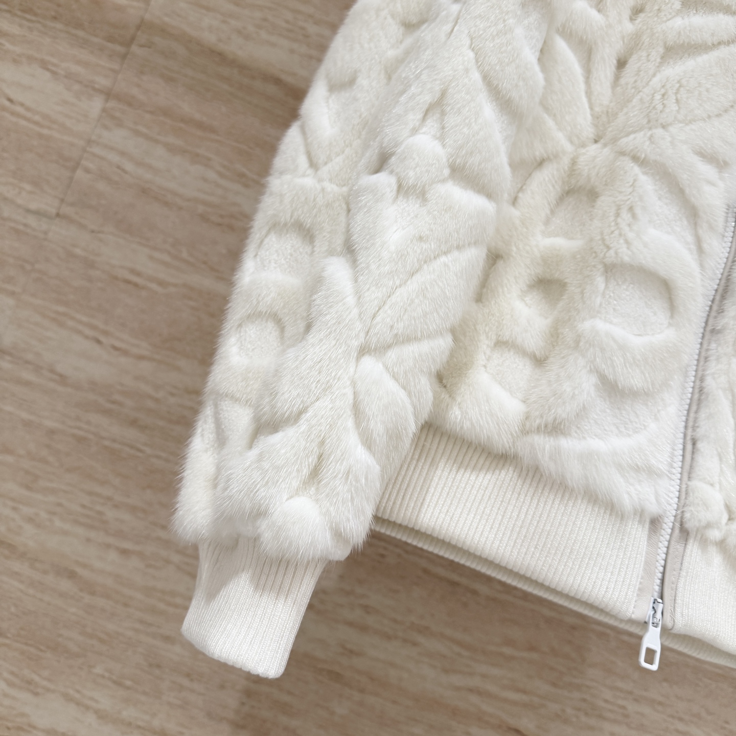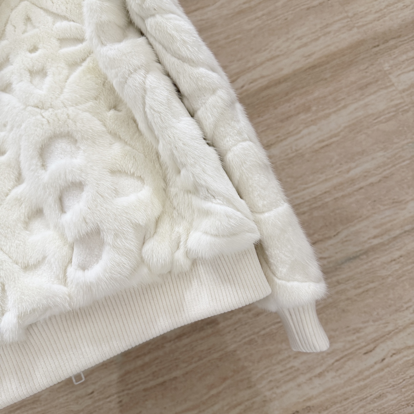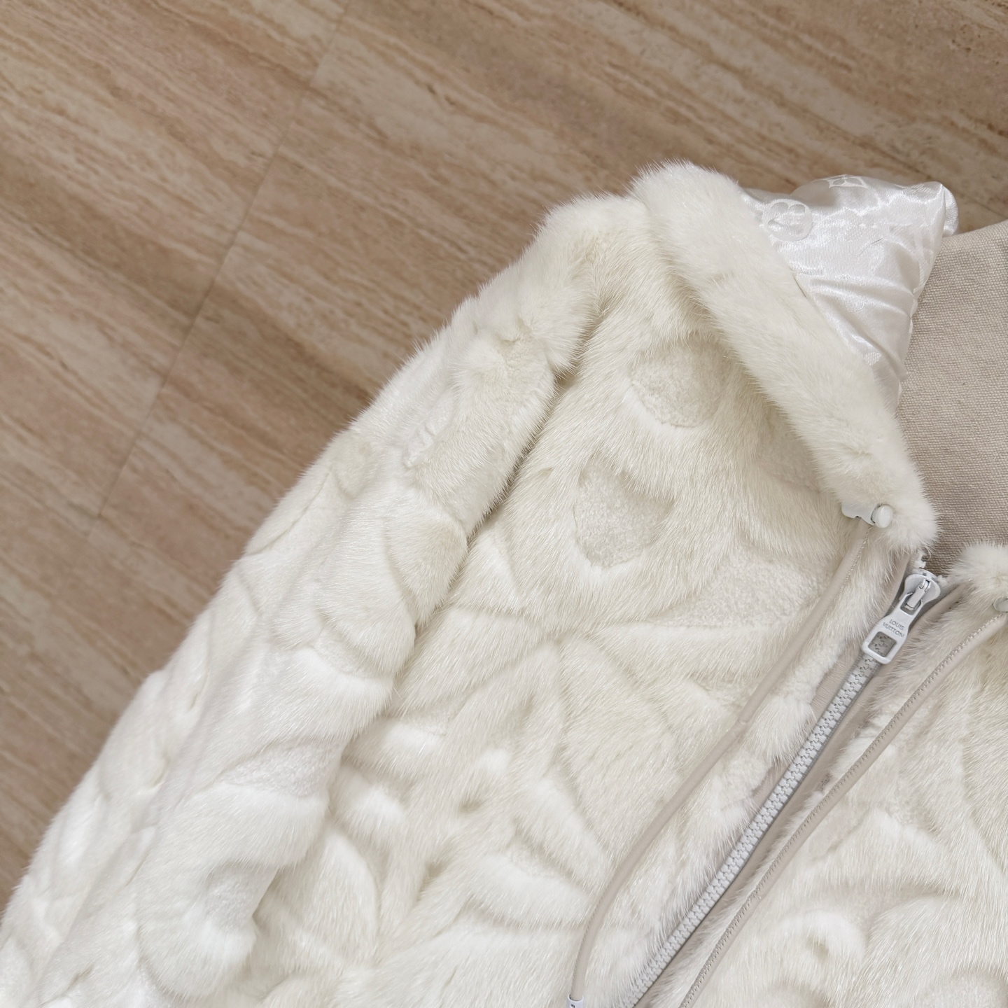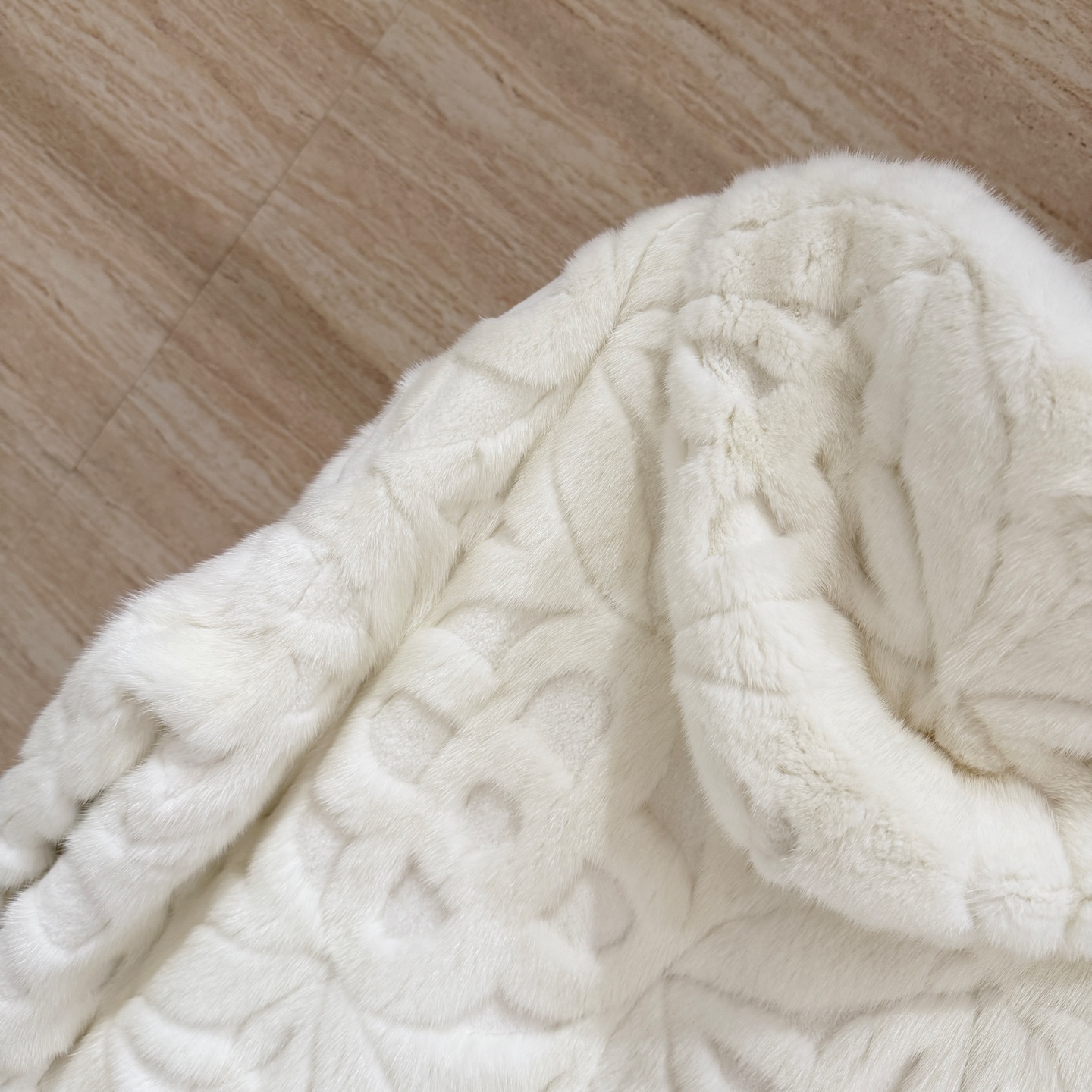 Details: Classic monogrammed heavy embossed hooded mink coat, unisex, imported mink, loose fit, sizes 36-42