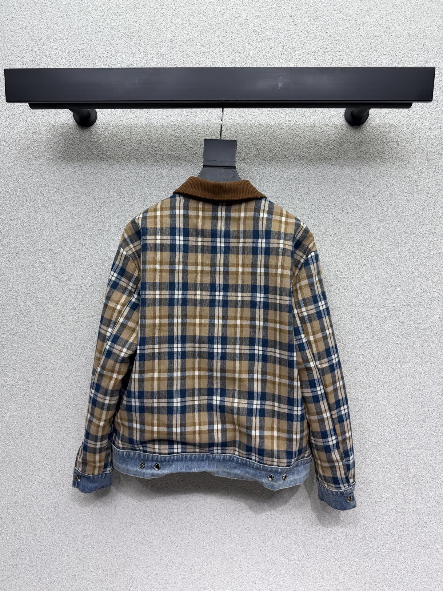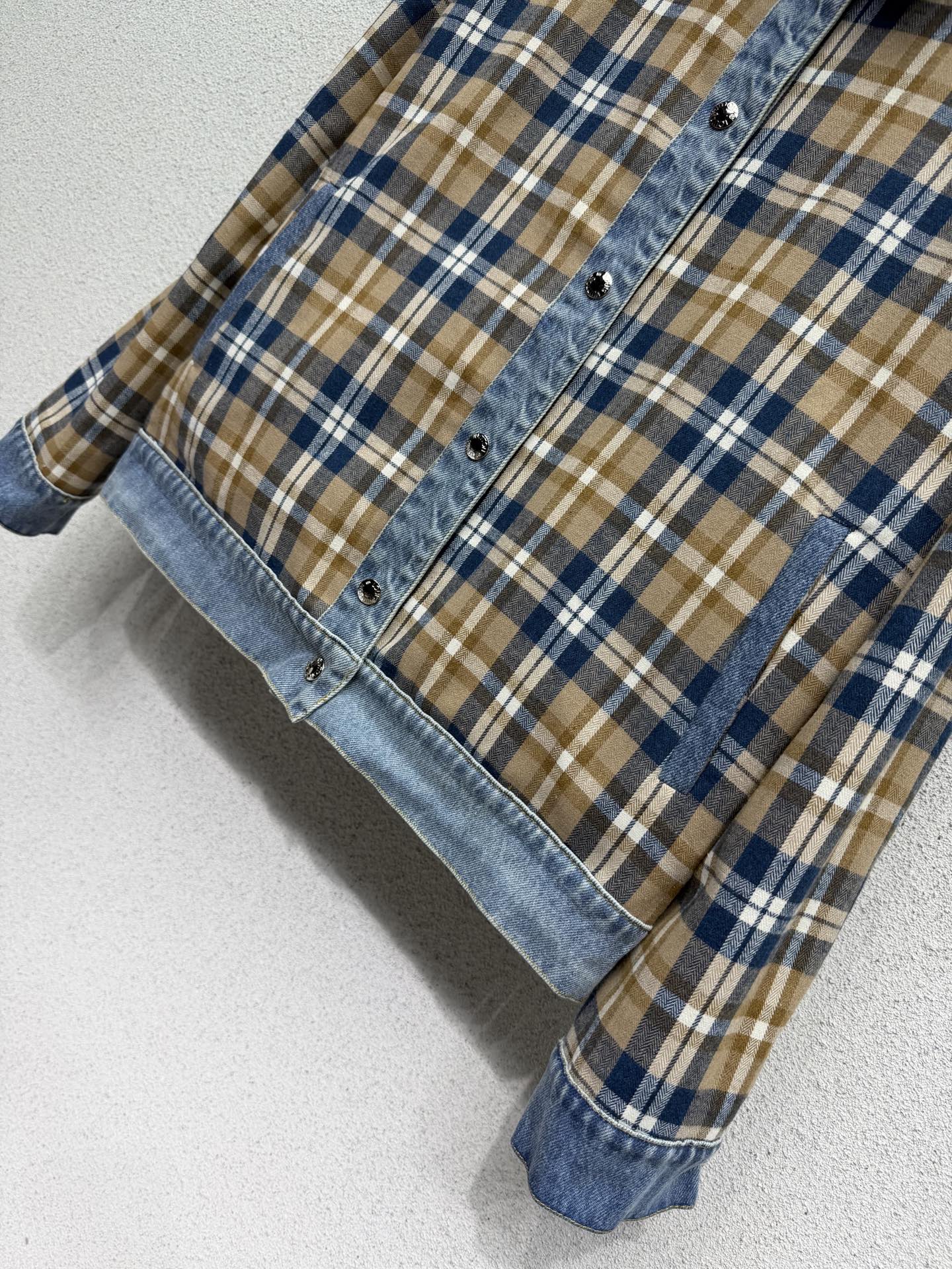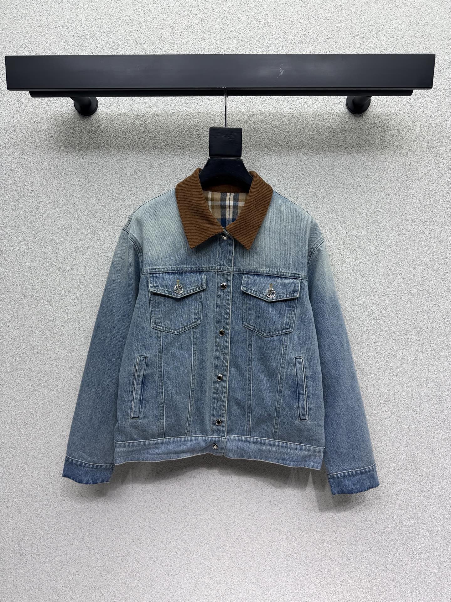 Details: Versatile double-sided checkered denim jacket with vintage wash, custom fabric, and a slim fit, a must-have for any wardrobe.
