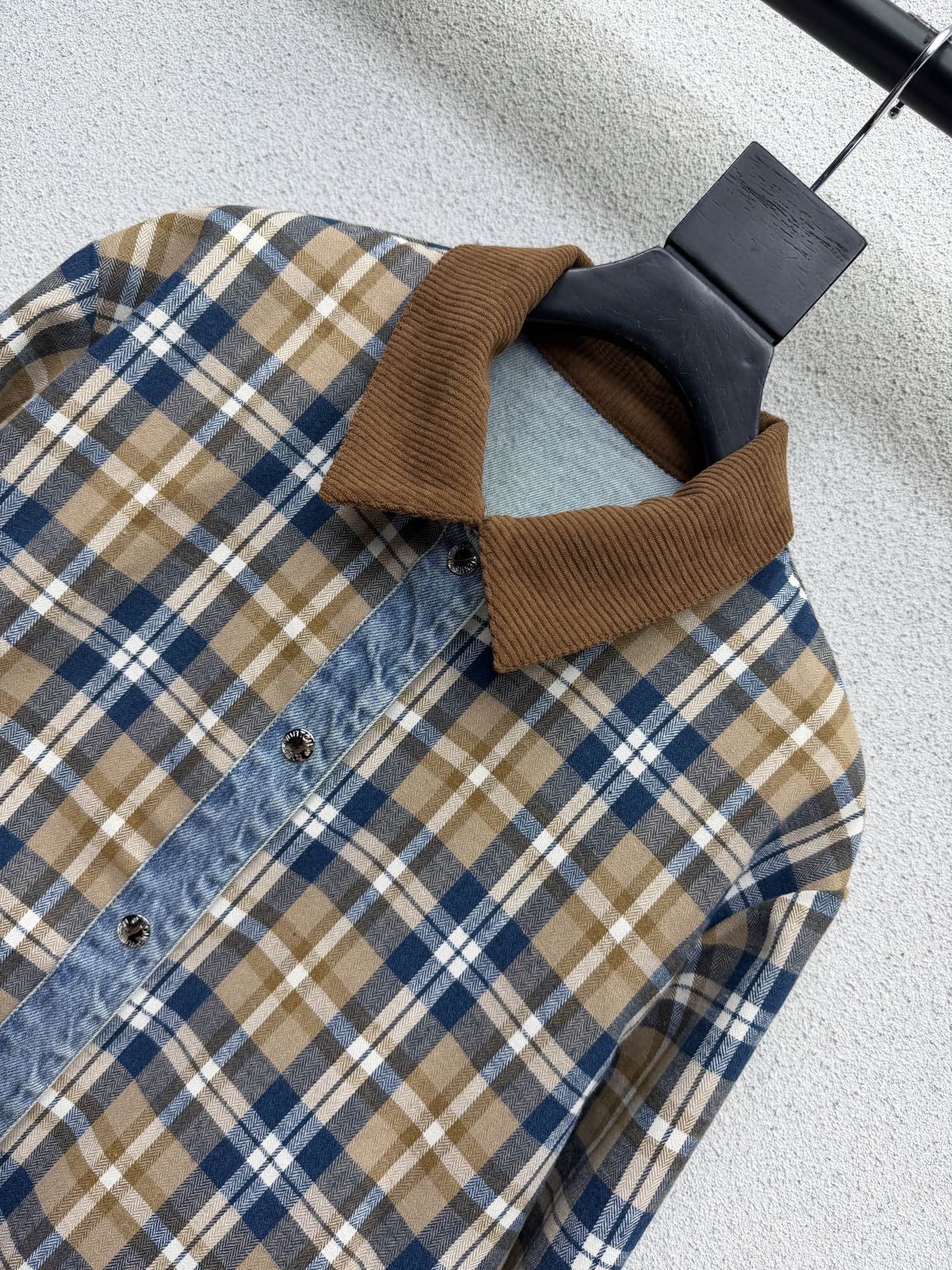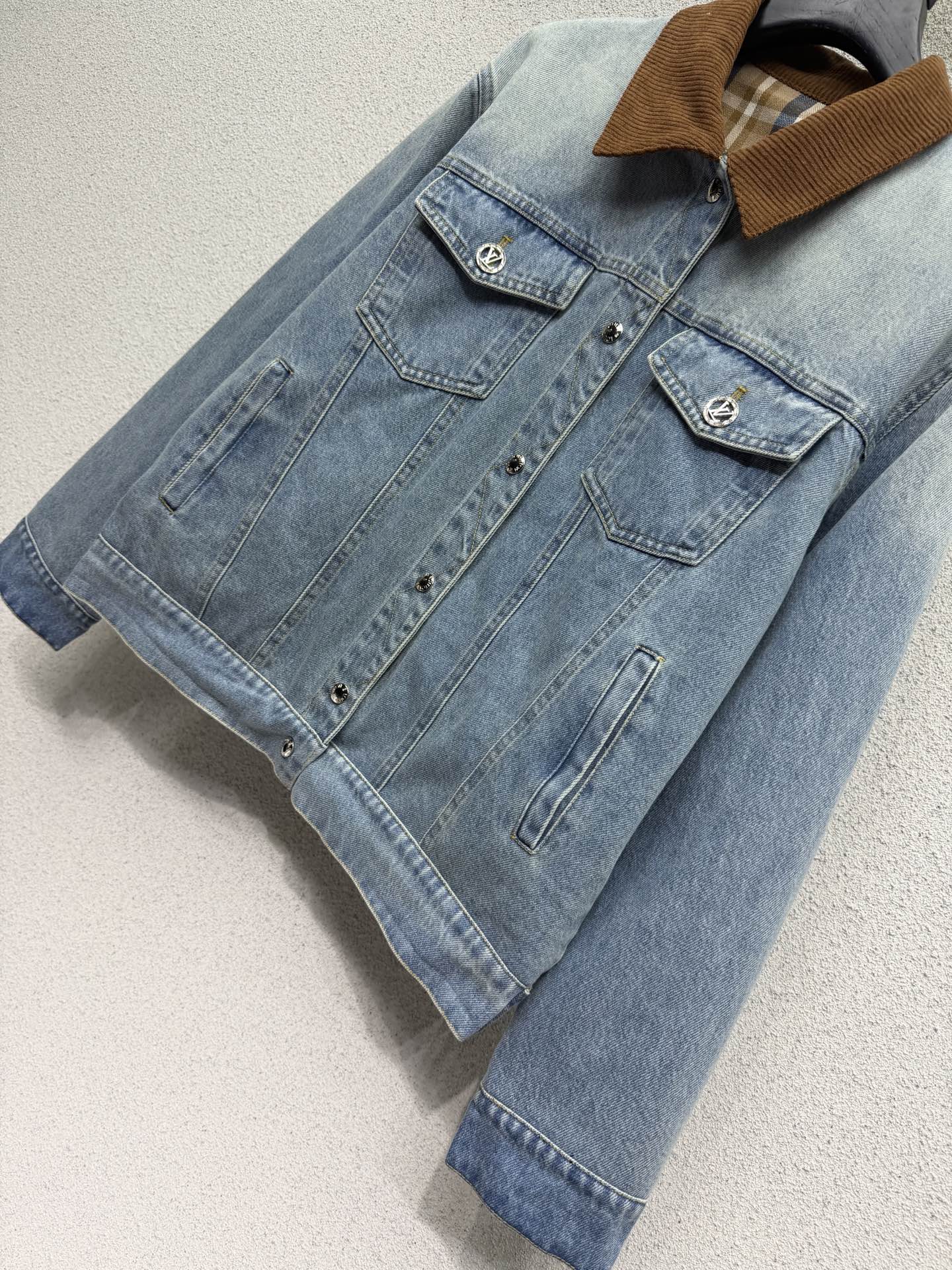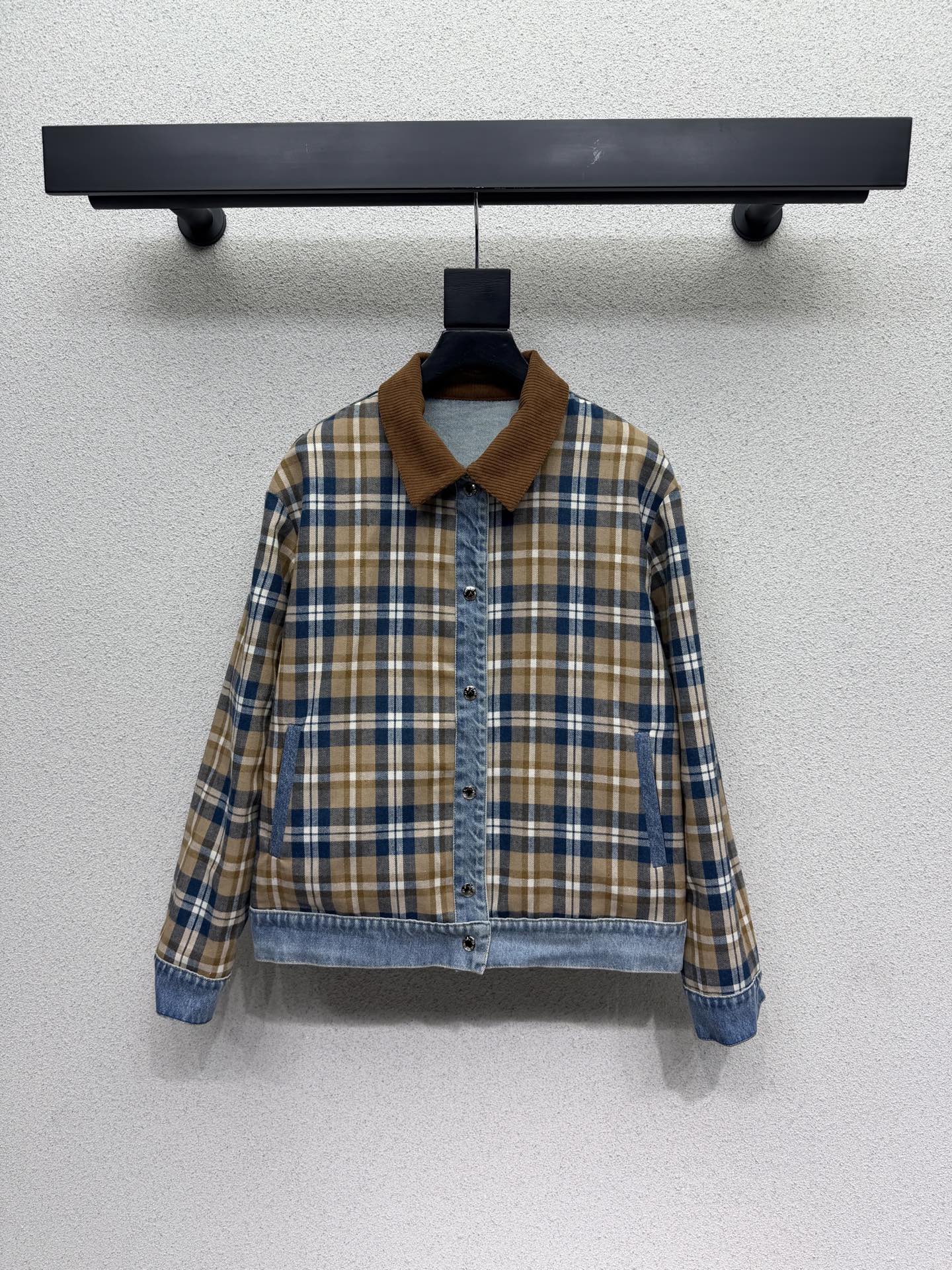 Details: Versatile double-sided checkered denim jacket with vintage wash, custom fabric, and a slim fit, a must-have for any wardrobe.