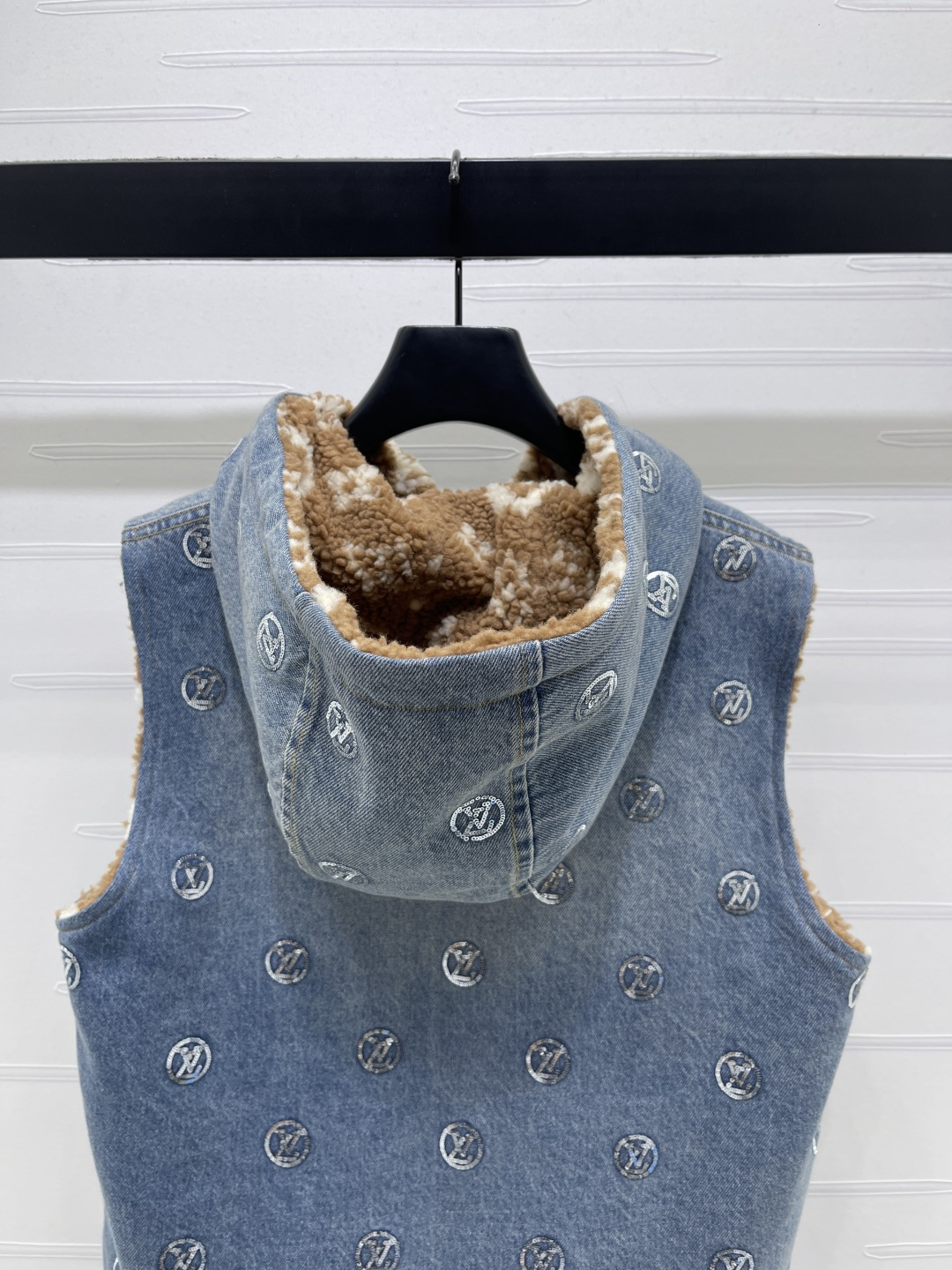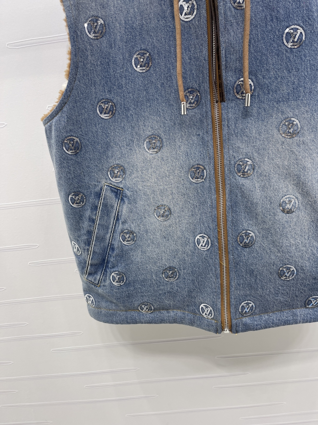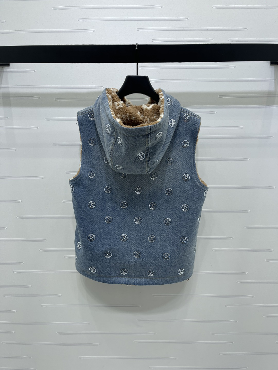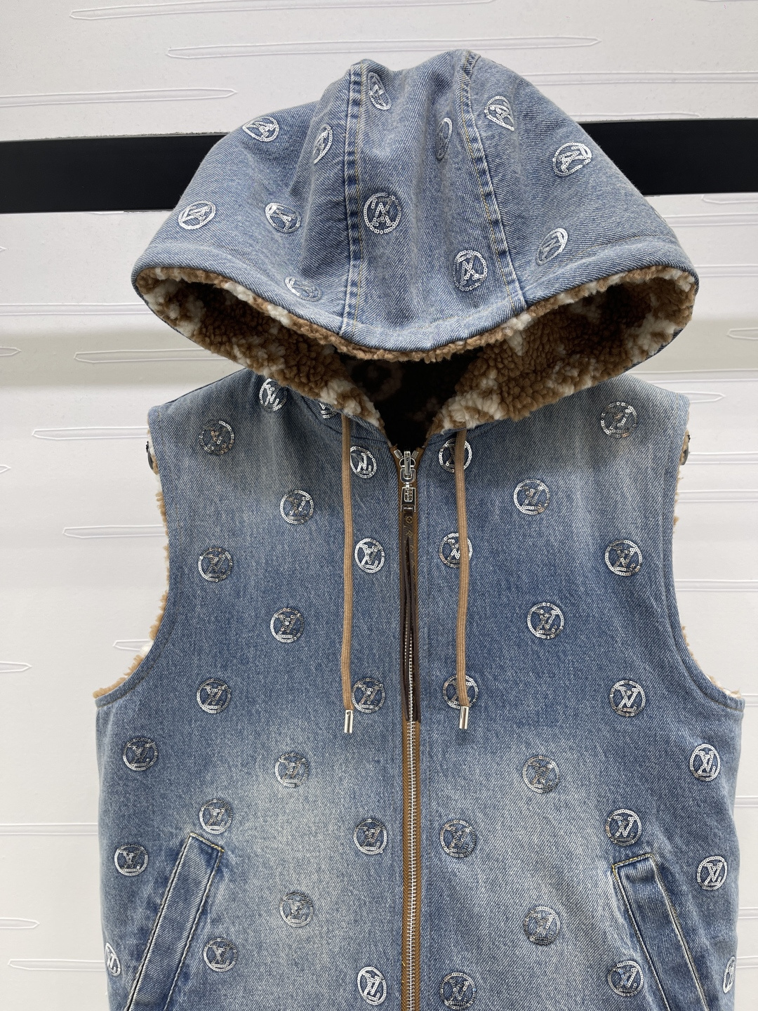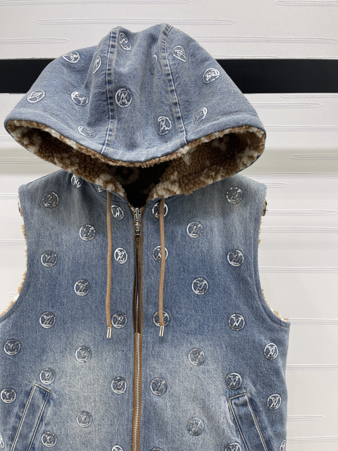 Details: New high - end reversible teddy - fleece denim vest, fashionable for layering. High - end customization, fine workmanship