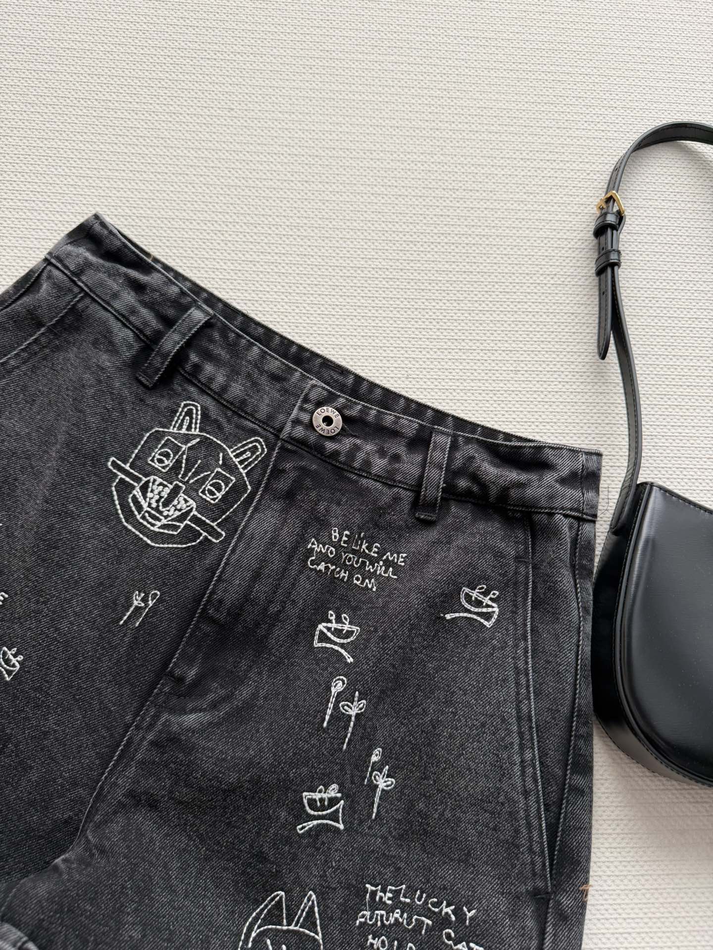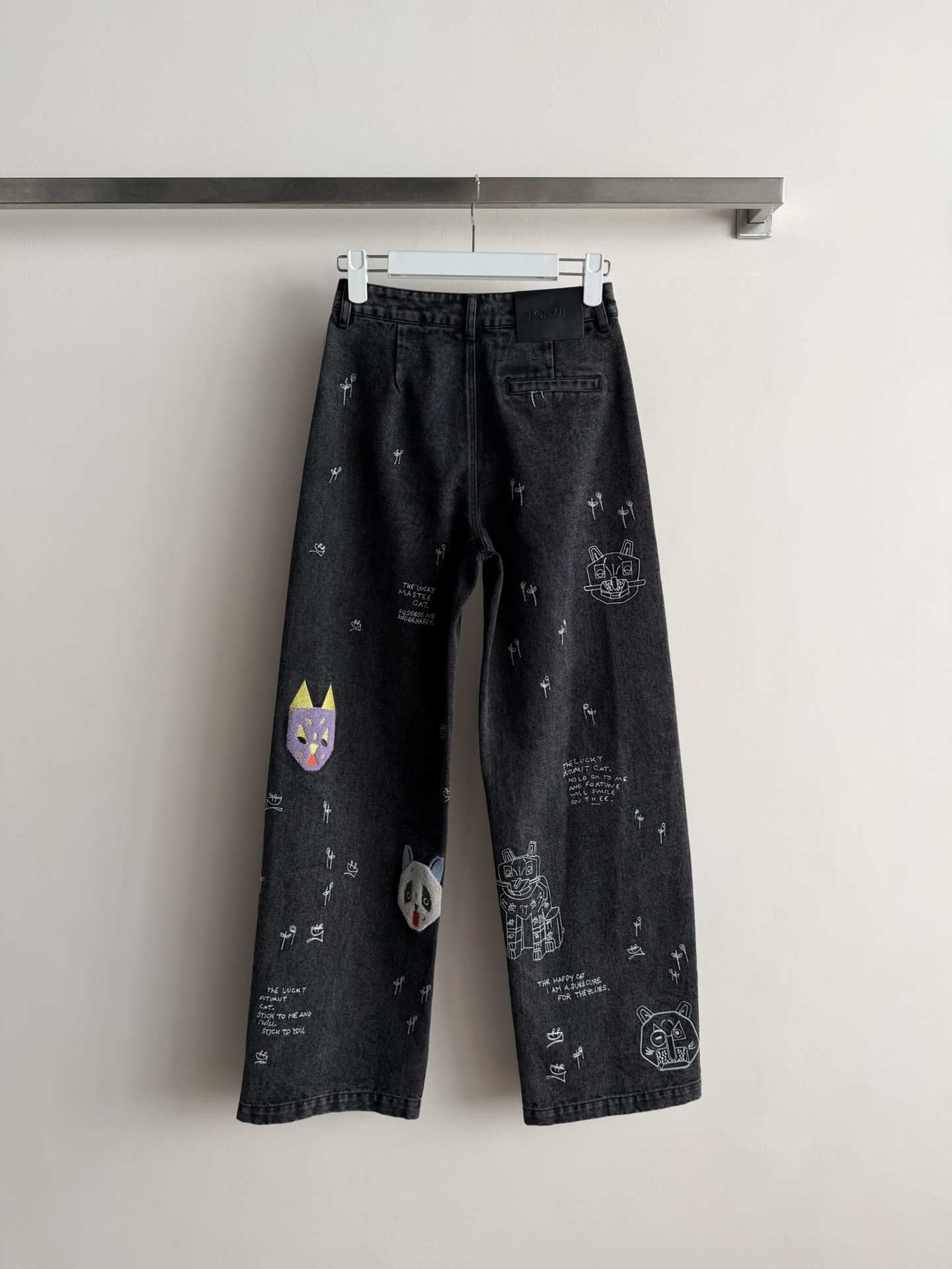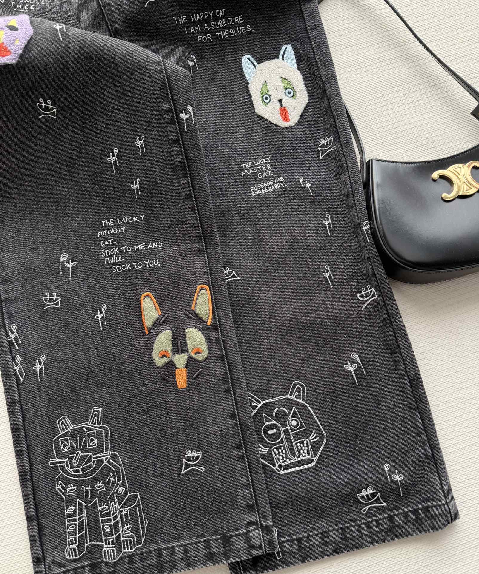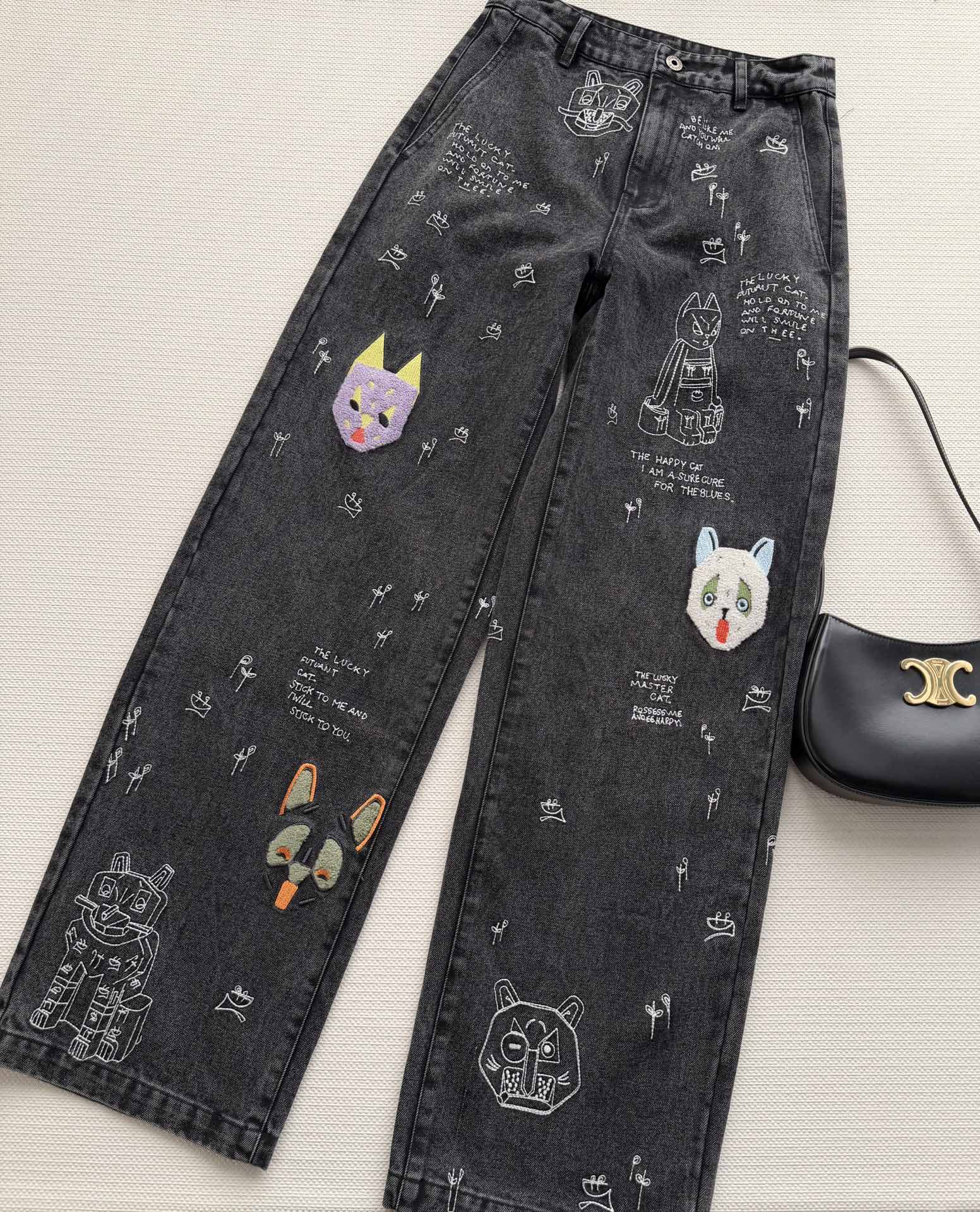 Details: Black - gray washed denim jeans with cat embroidery, loose straight - leg, highly collectible.