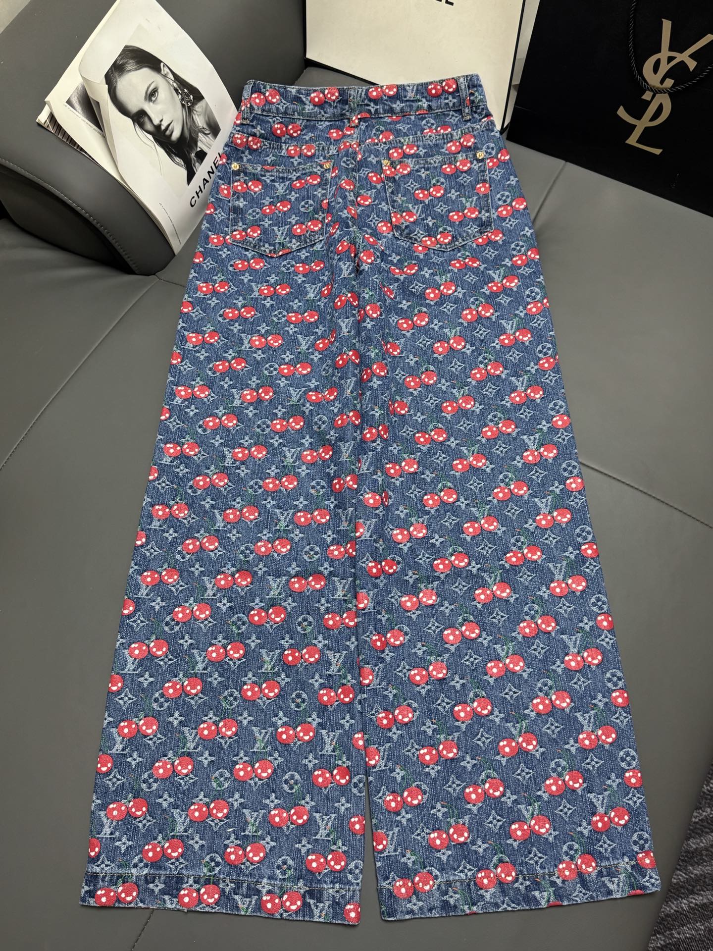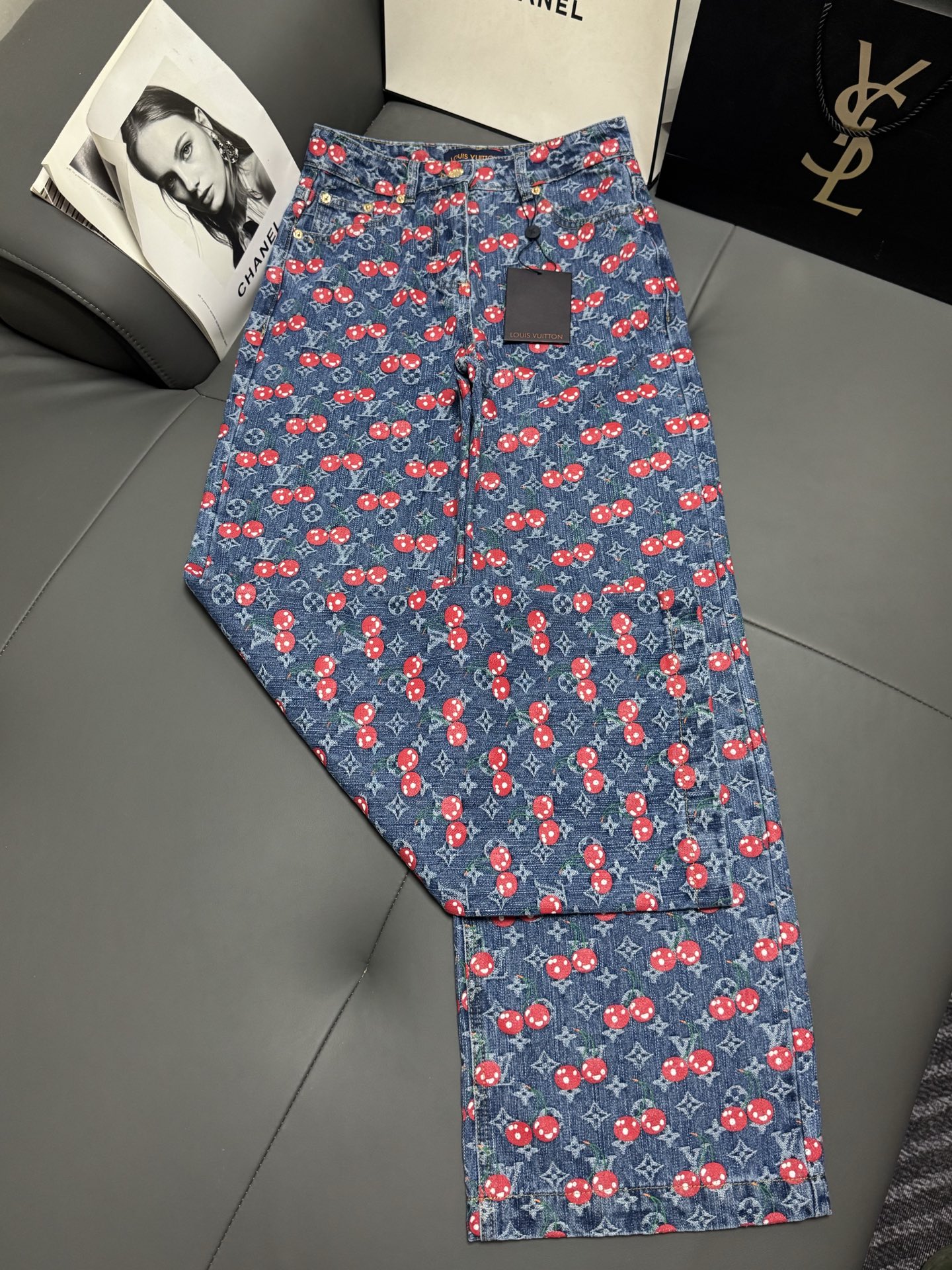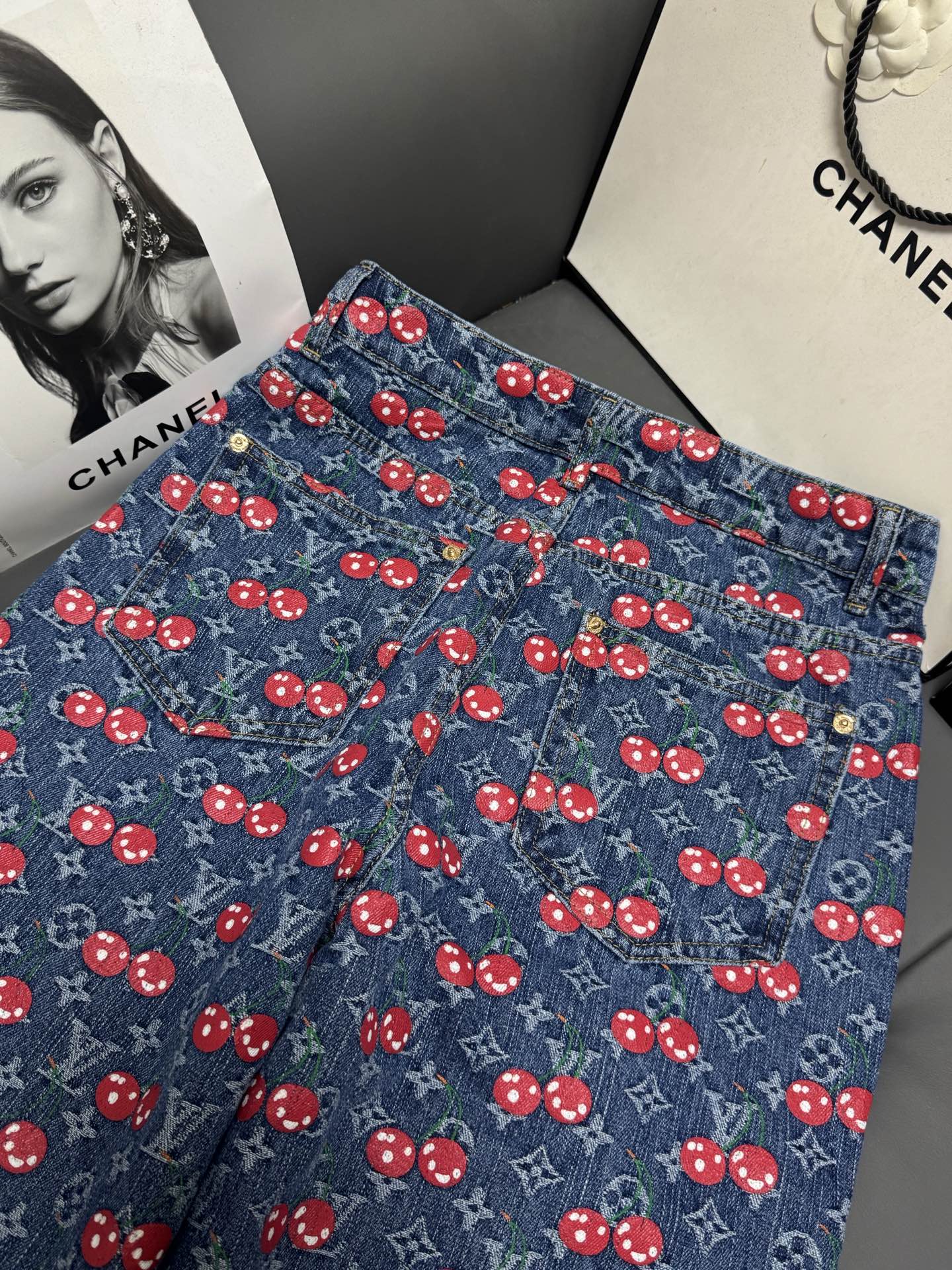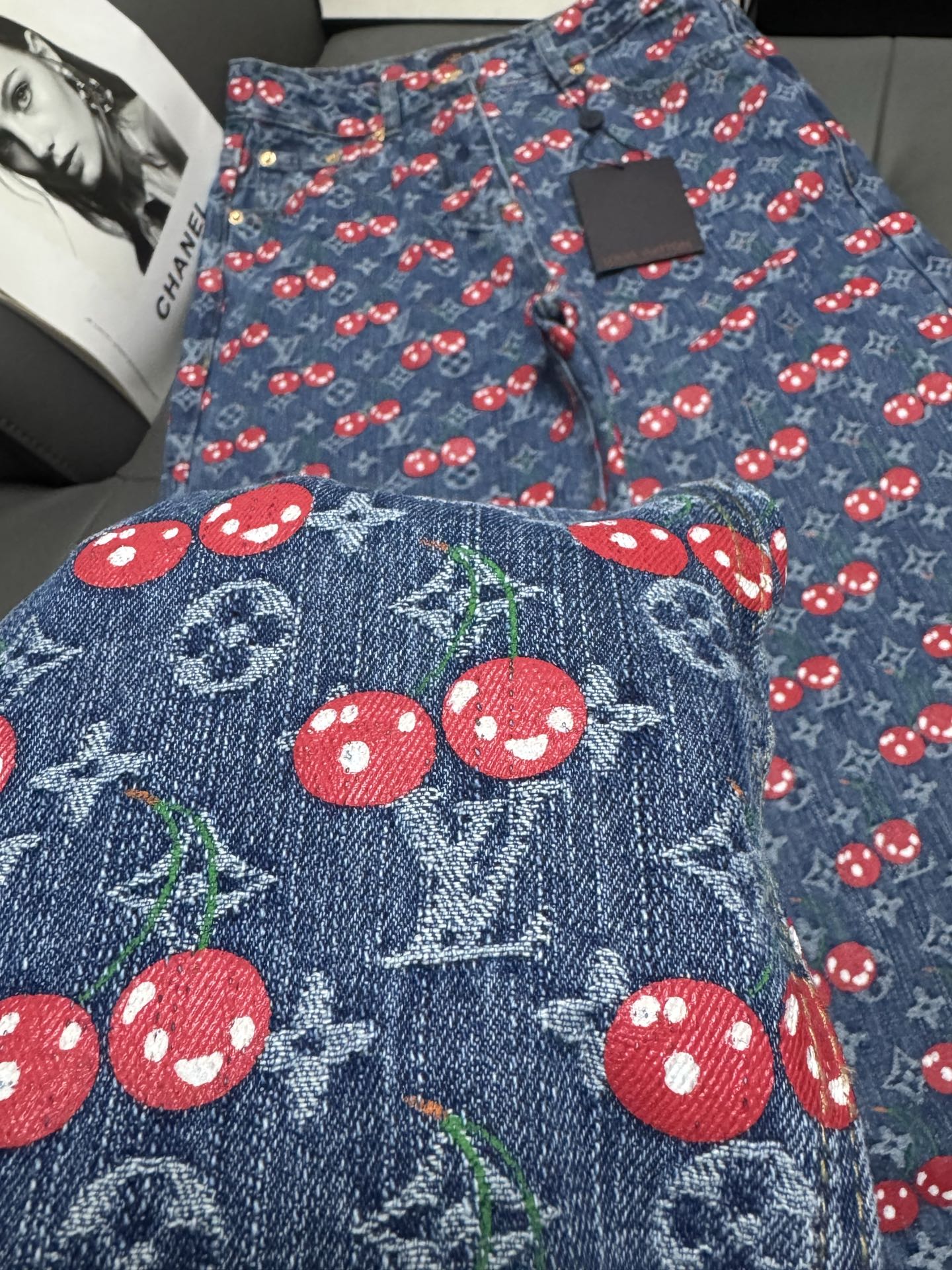Details: Early autumn cherry-printed denim pants, all-cotton, enzyme wash, fashionable and stylish