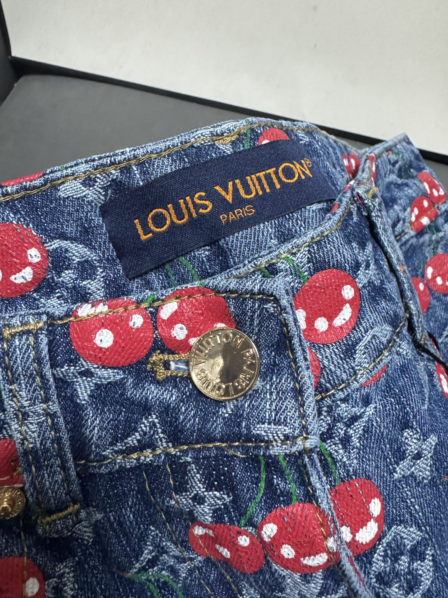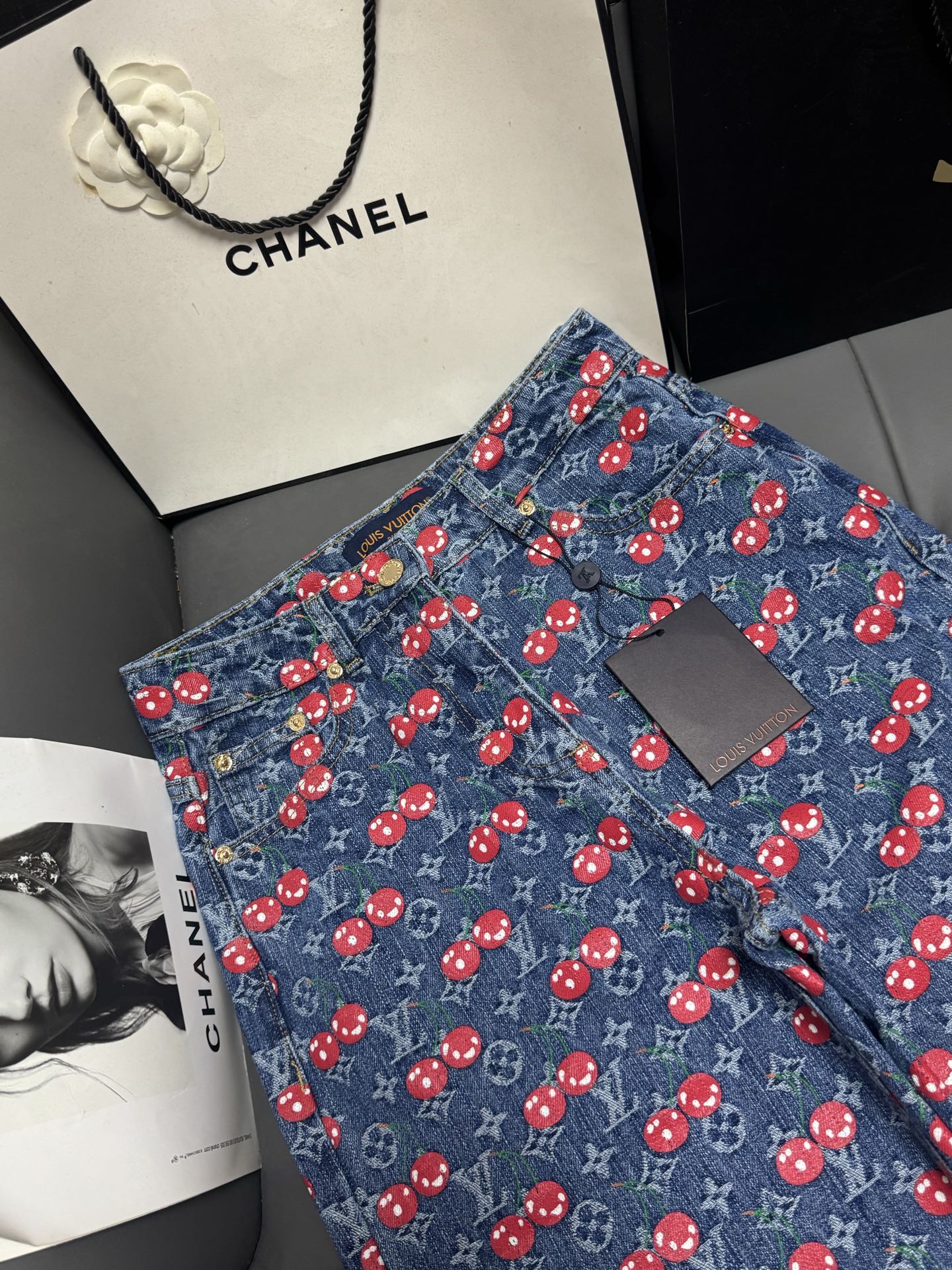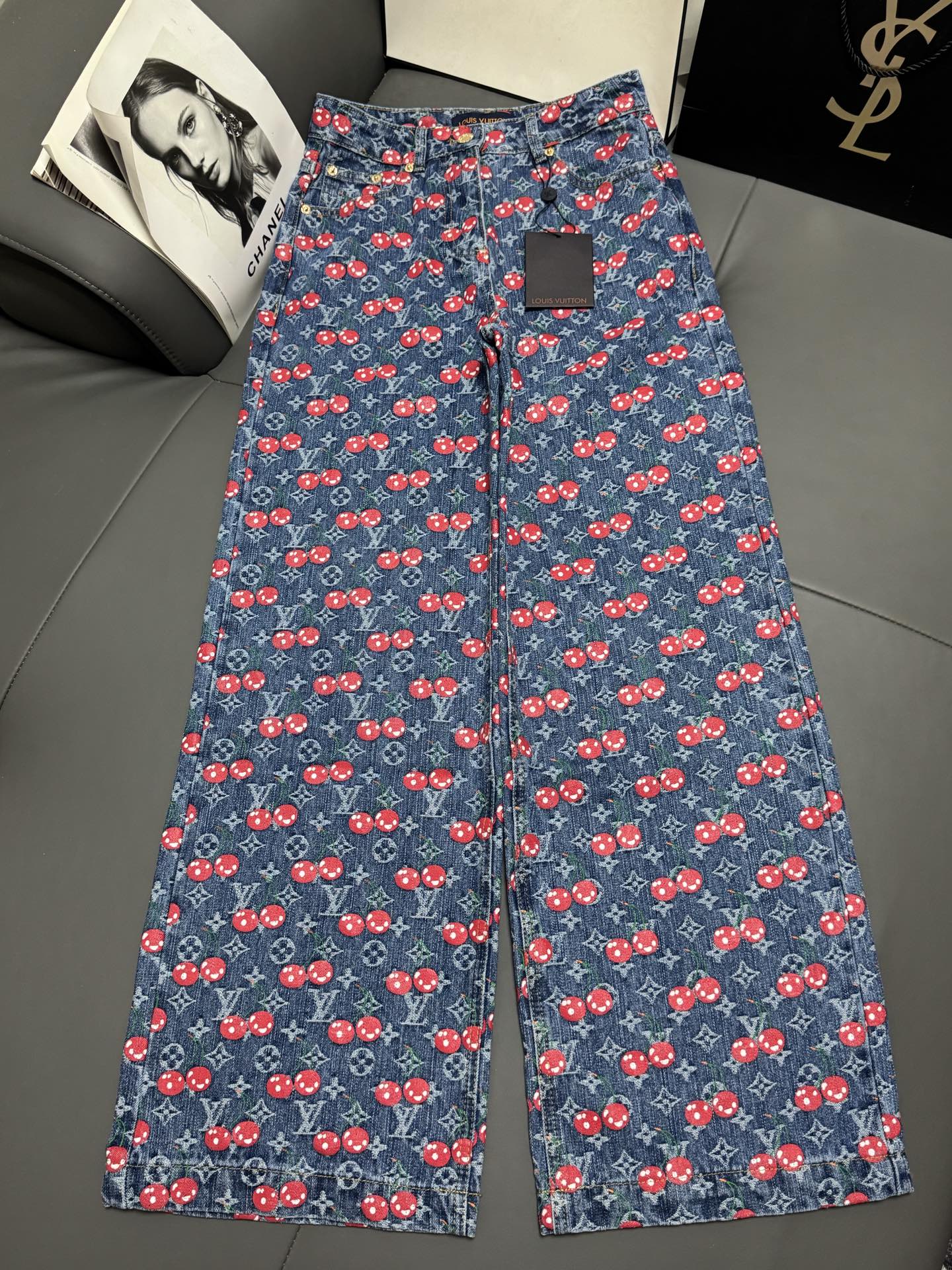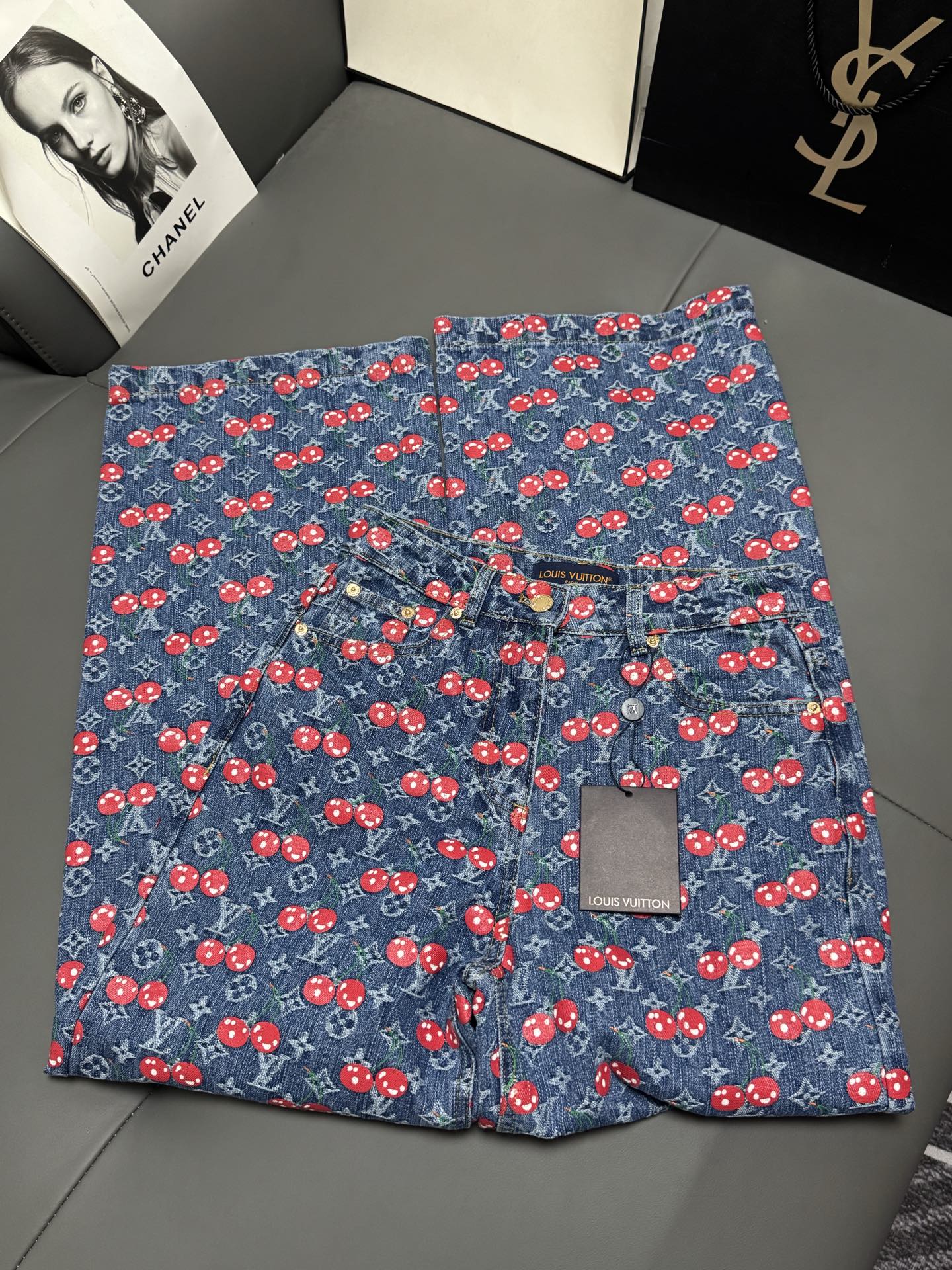 Details: Early autumn cherry-printed denim pants, all-cotton, enzyme wash, fashionable and stylish