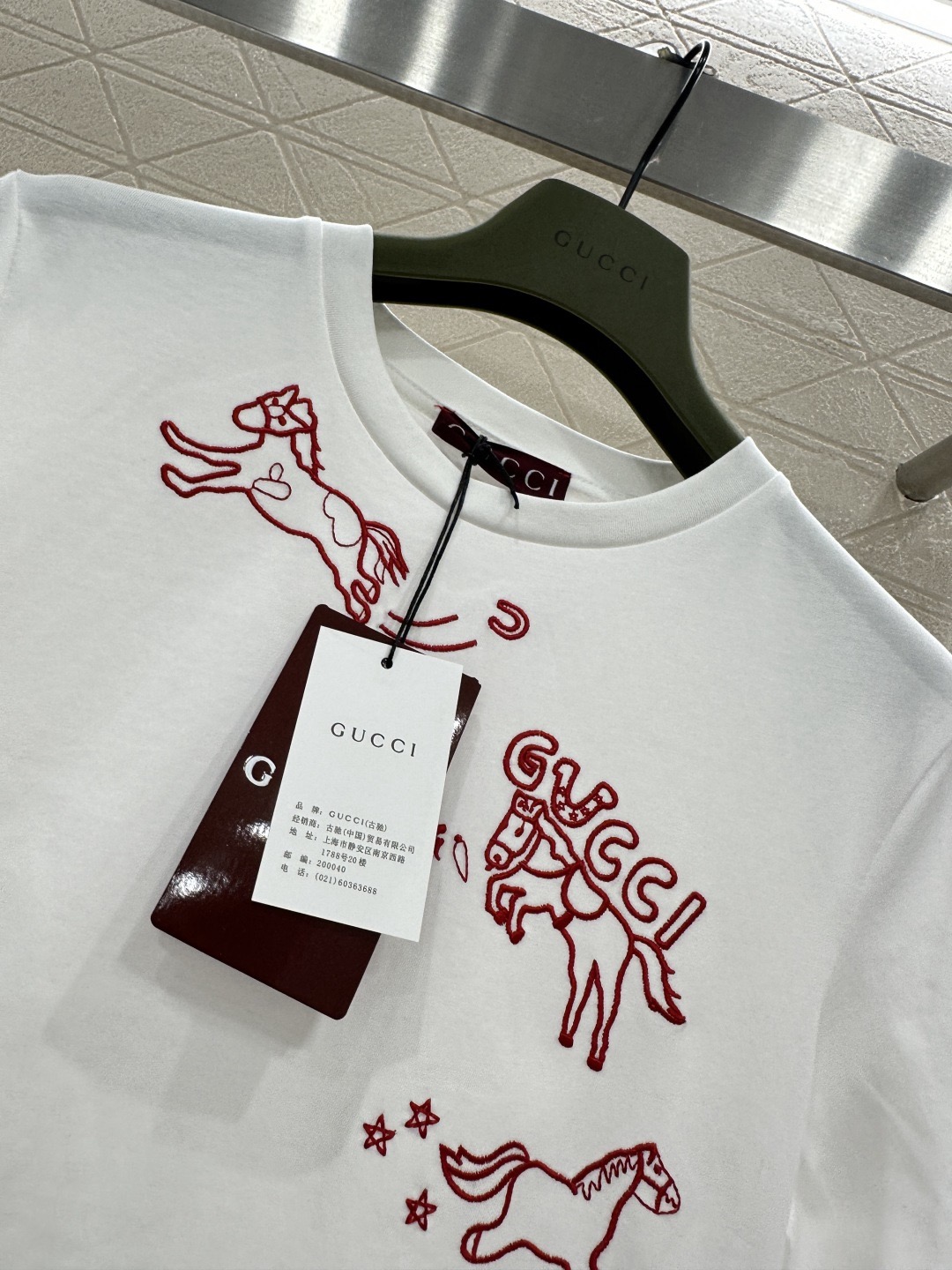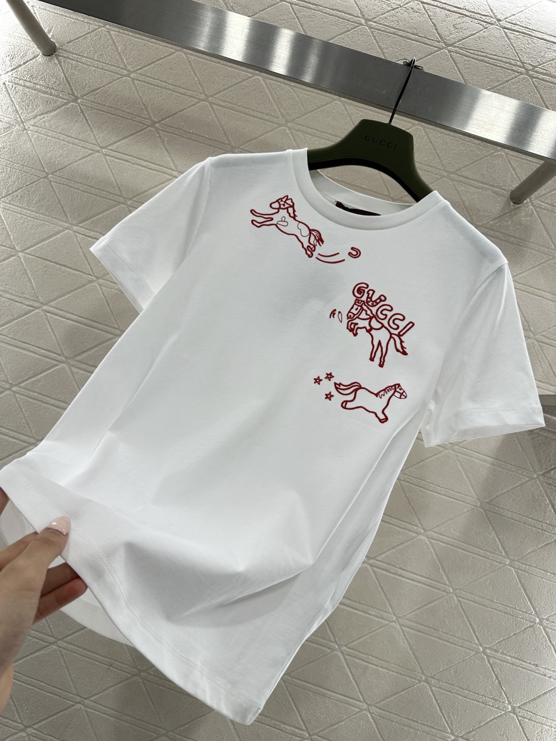 Details: New Year-themed T-shirt with embroidered horse and double G pattern, breathable silk-cotton, suitable for single or layered wear.