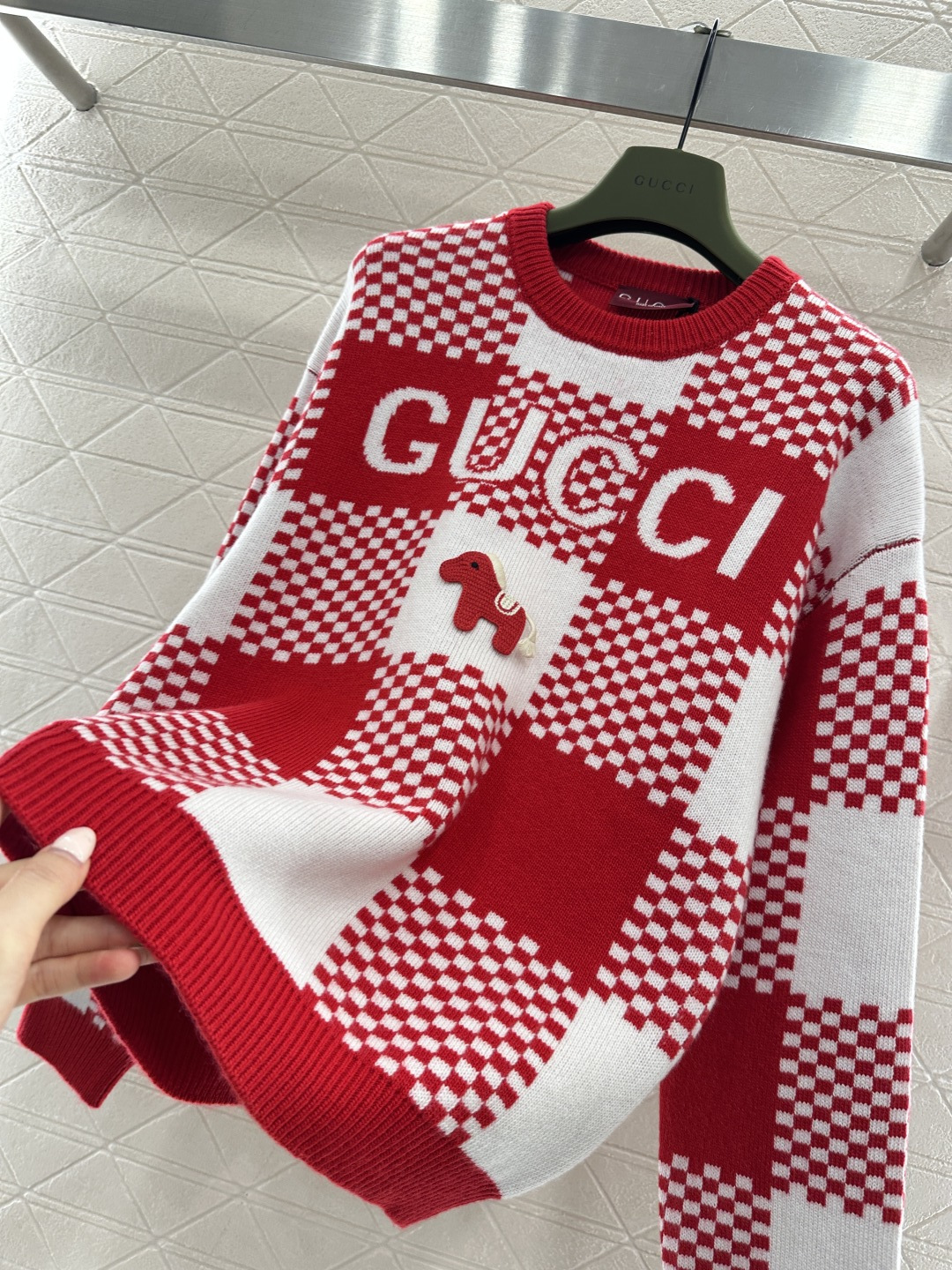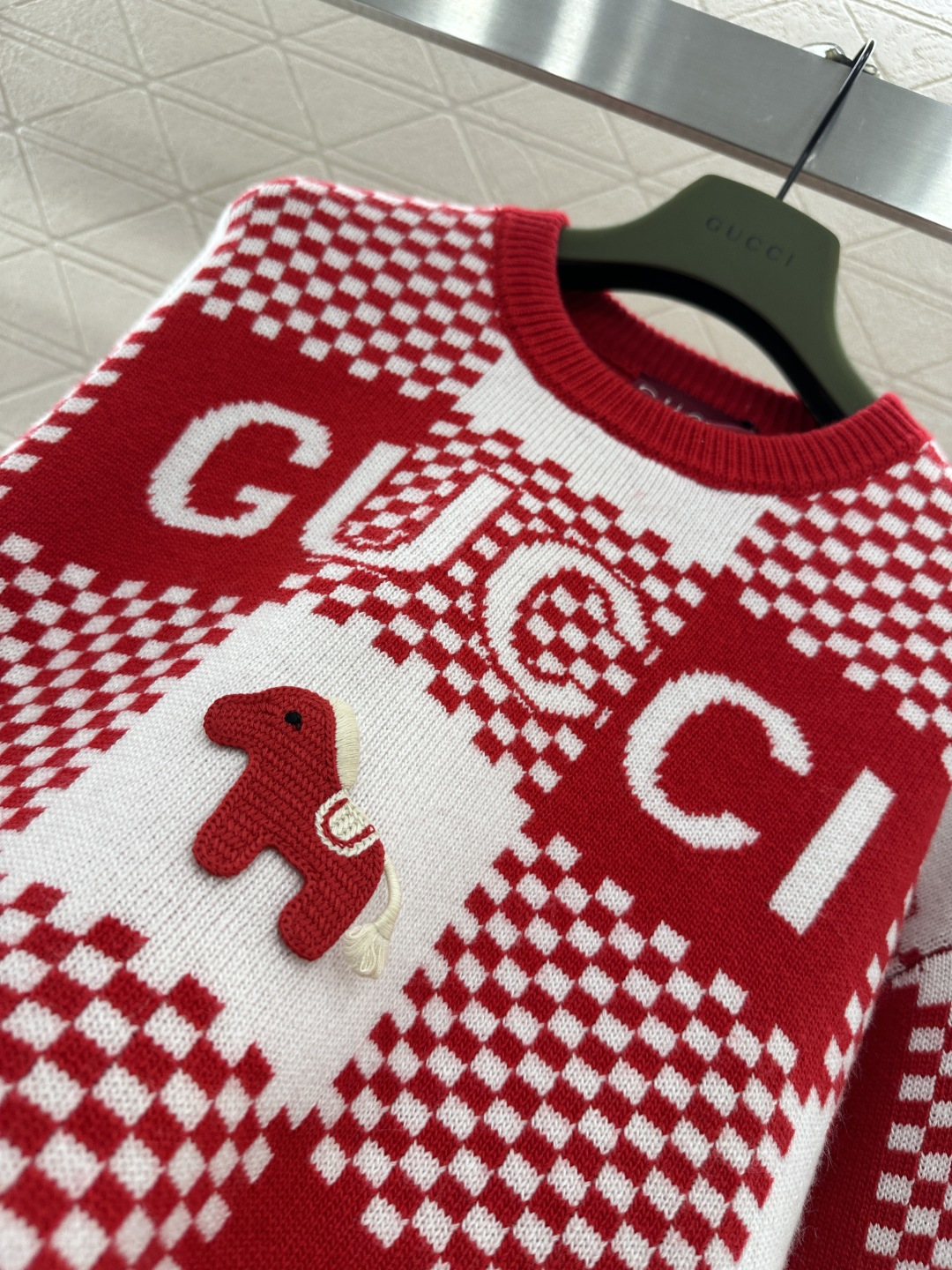Details: New Year knitted sweater with embroidered pony, check pattern, soft wool, loose fit.