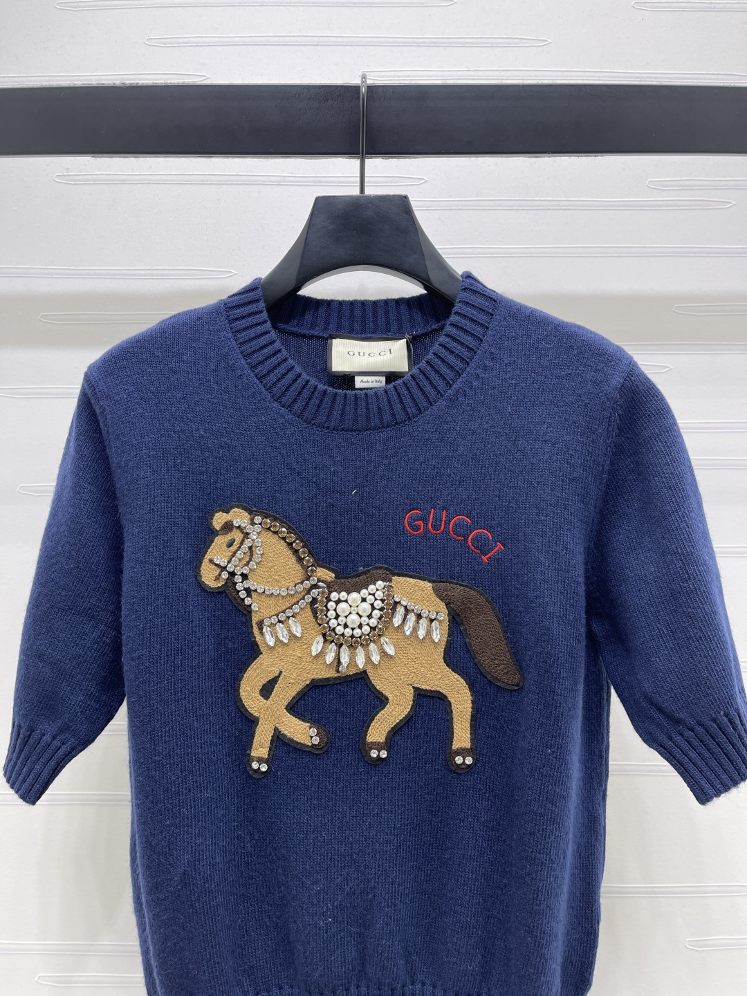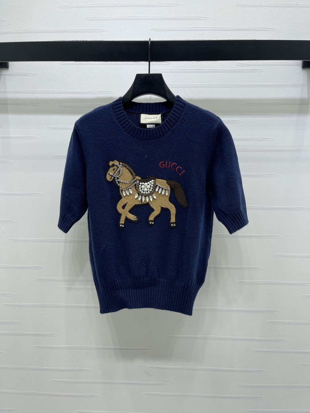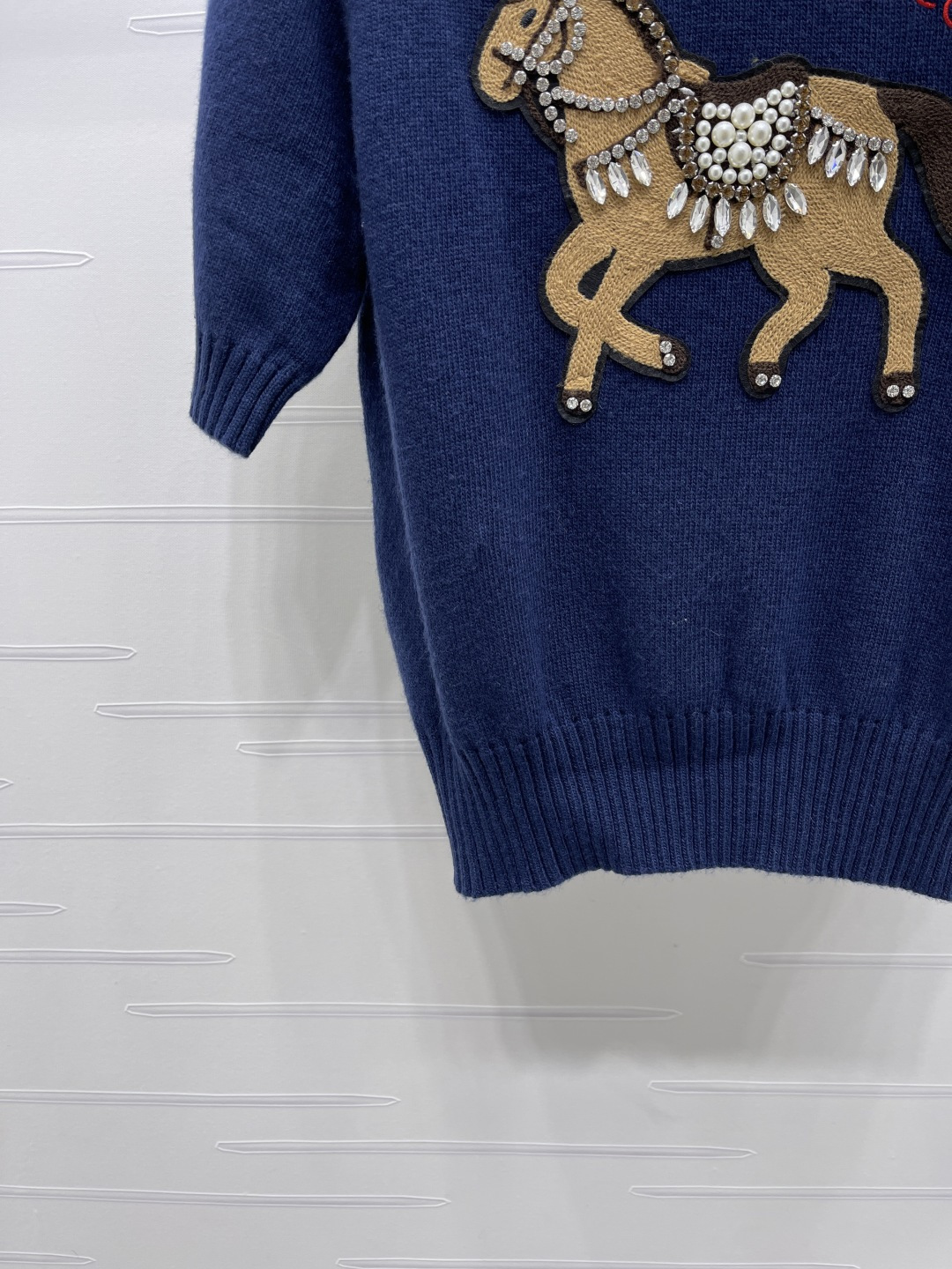Details: Early spring Premium knit short-sleeve sweater with embroidered horse, soft and breathable, versatile styling.