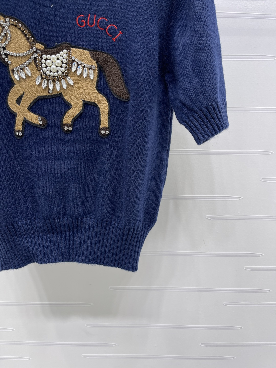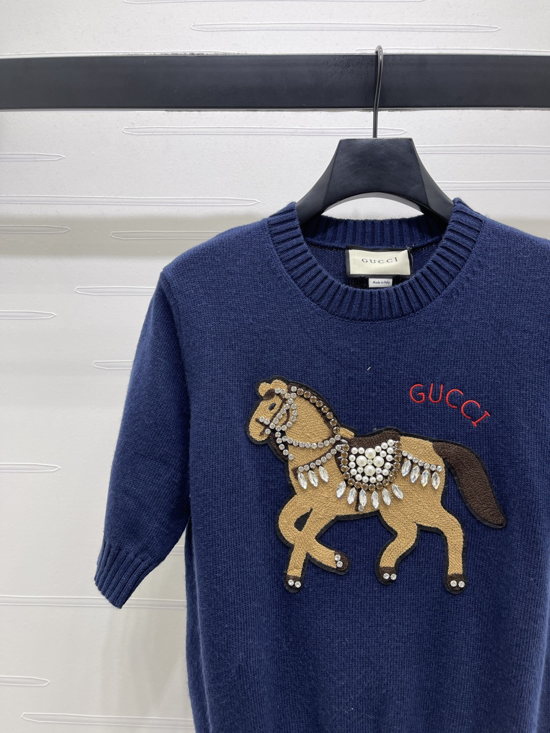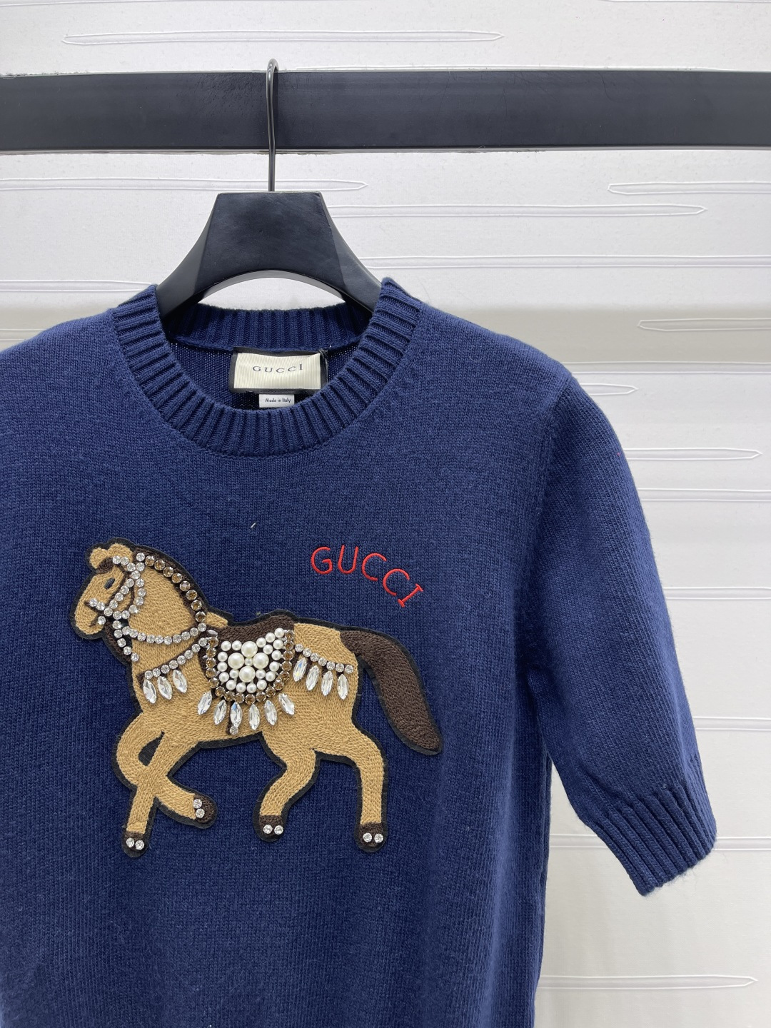Details: Early spring Premium knit short-sleeve sweater with embroidered horse, soft and breathable, versatile styling.