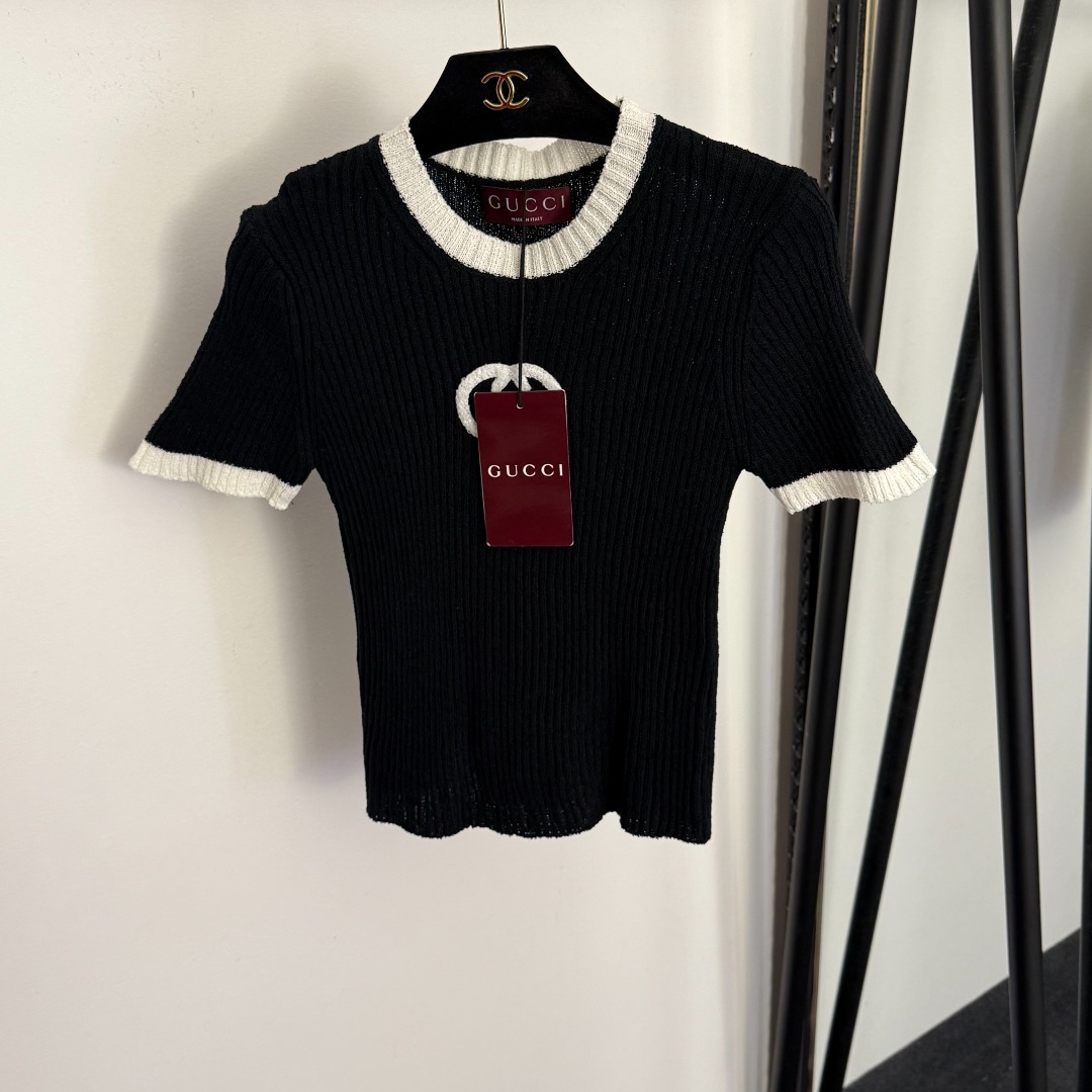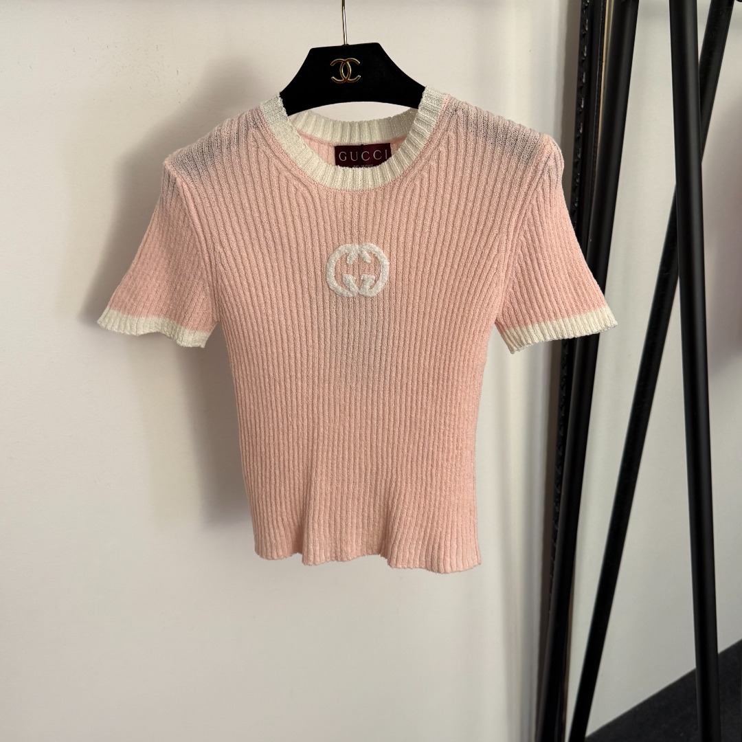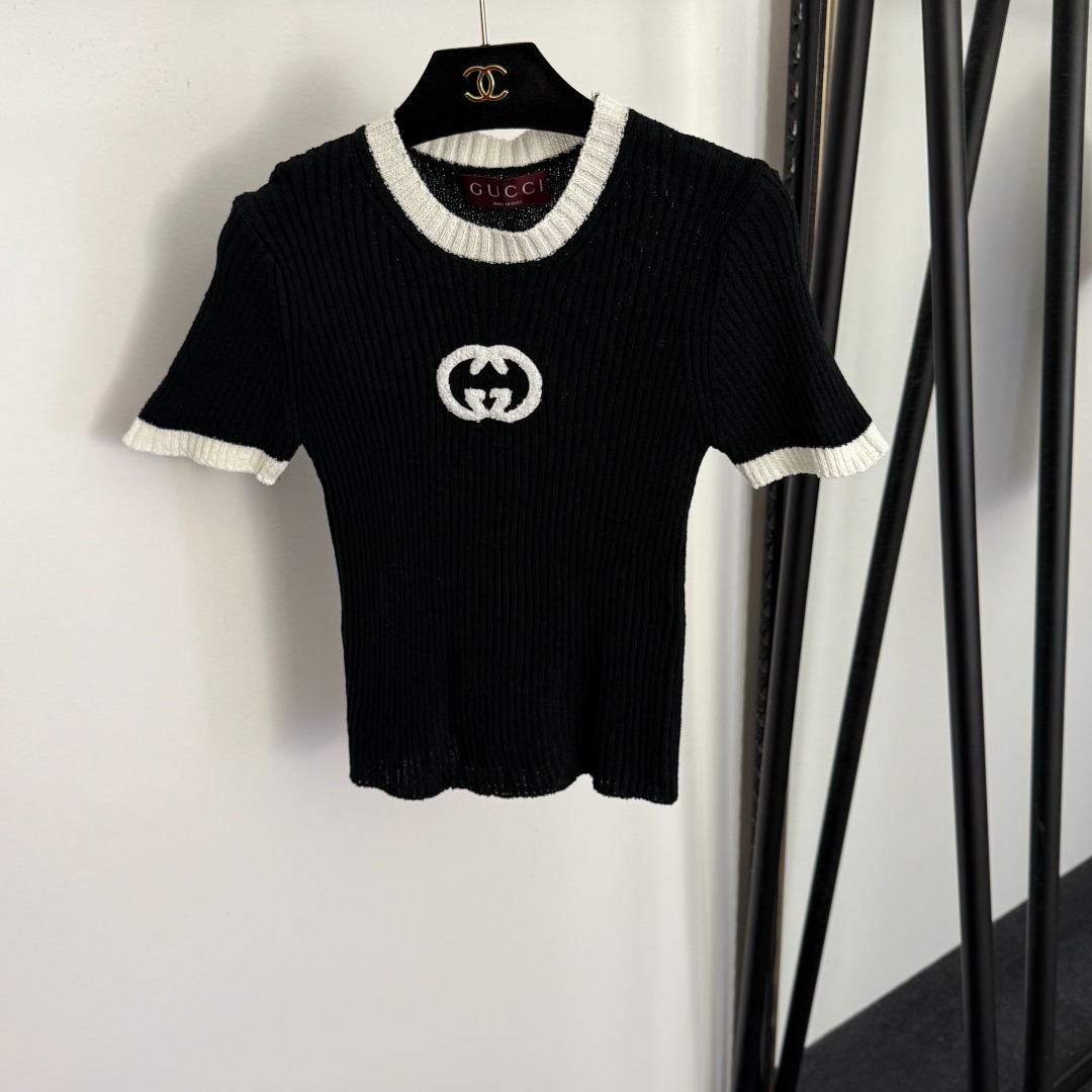 Details: New slim - fit short - sleeved knitted top with GG embroidery, available in multiple colors, premium custom, fine workmanship