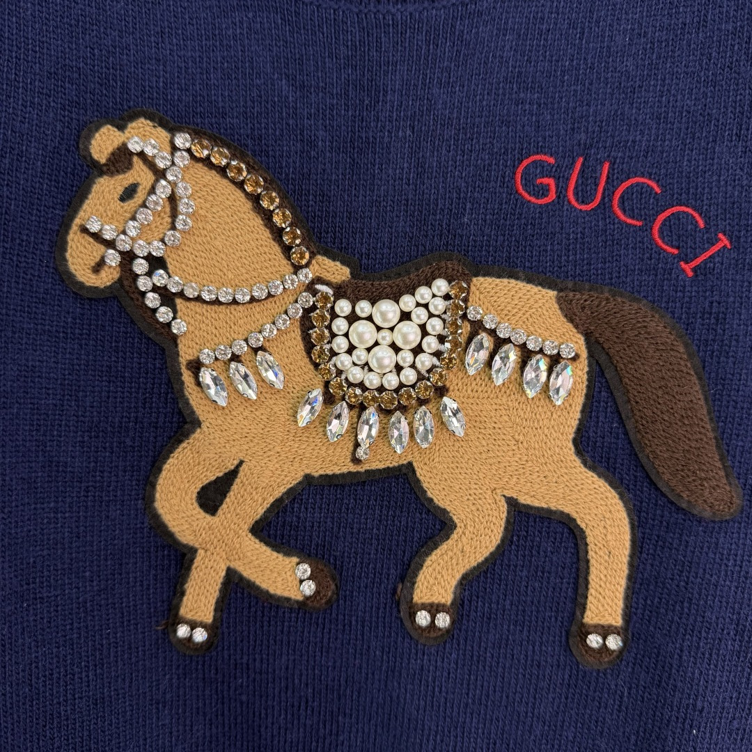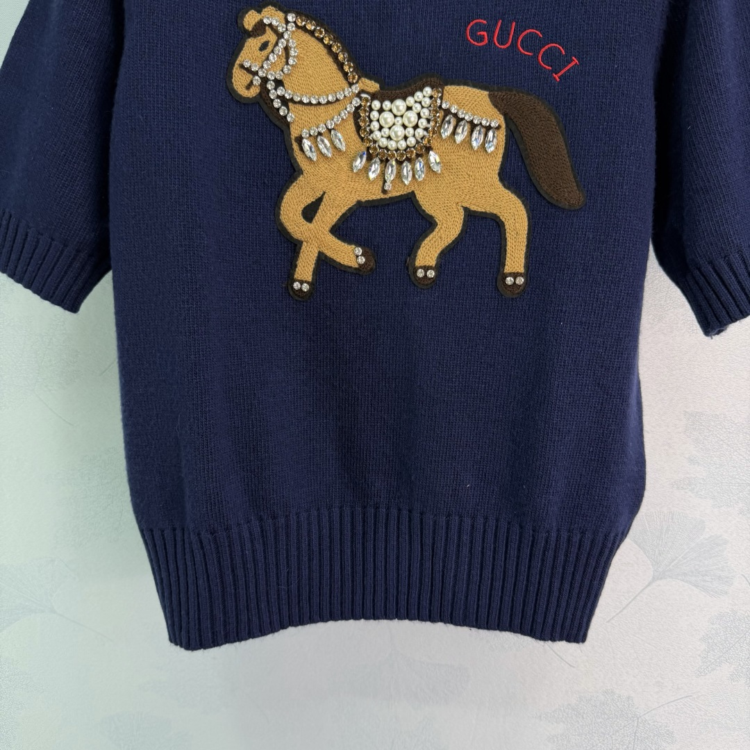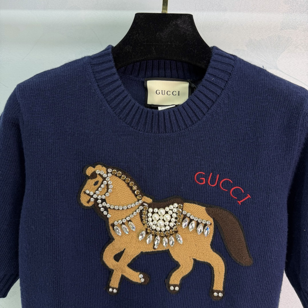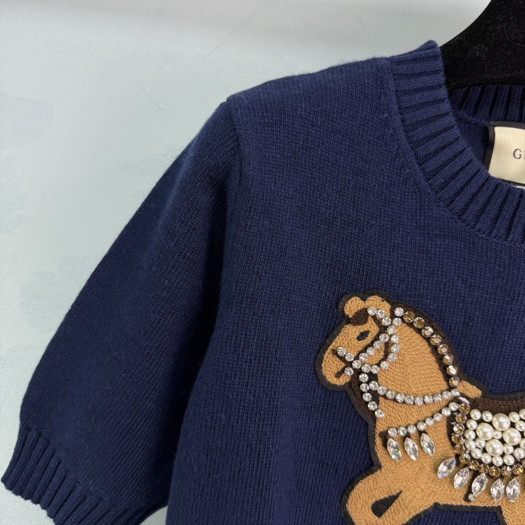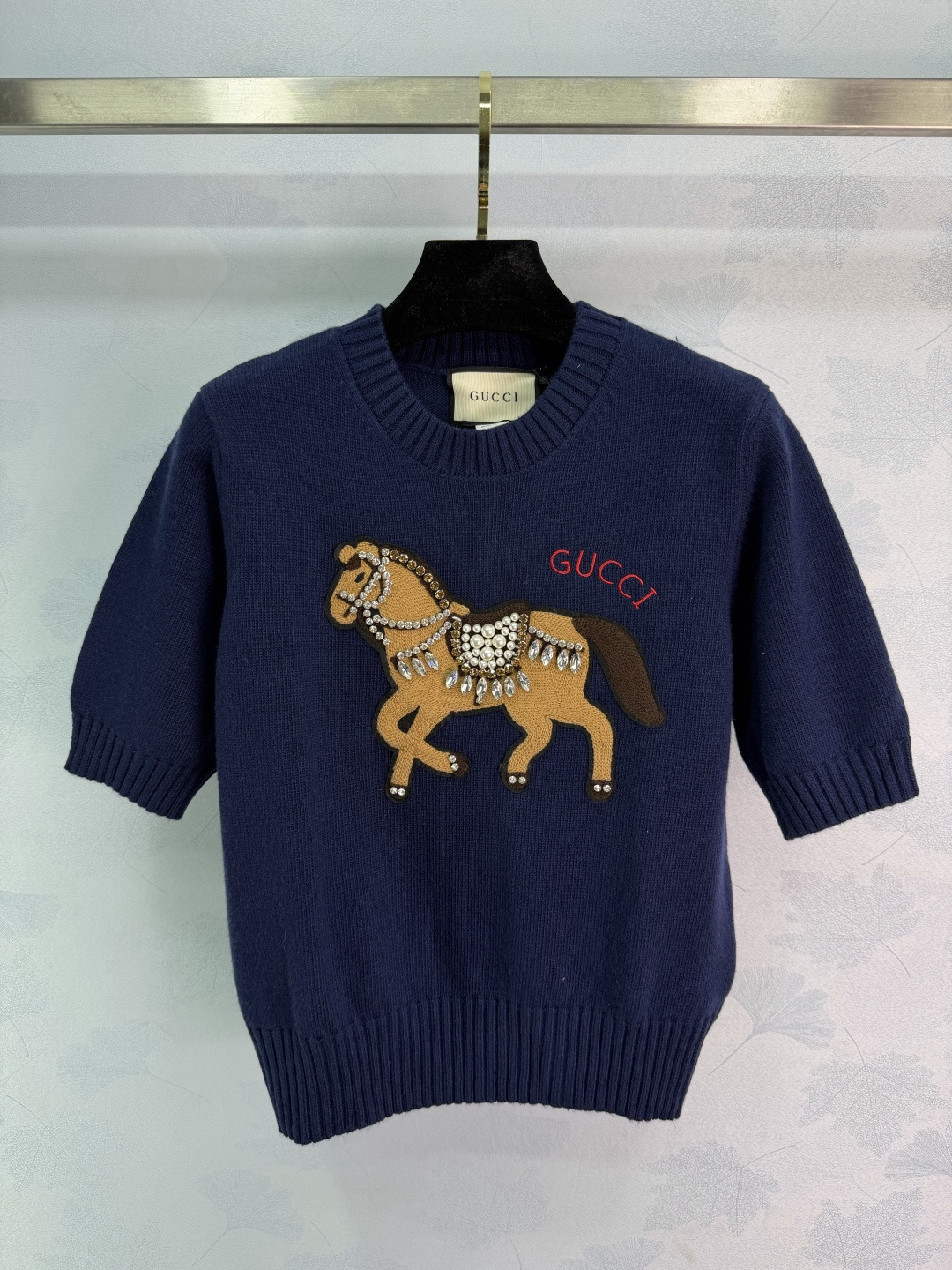 Details: Early spring dark blue knit short sleeve with eye-catching horse pattern, high-quality fabric, soft and comfortable, casual yet stylish.