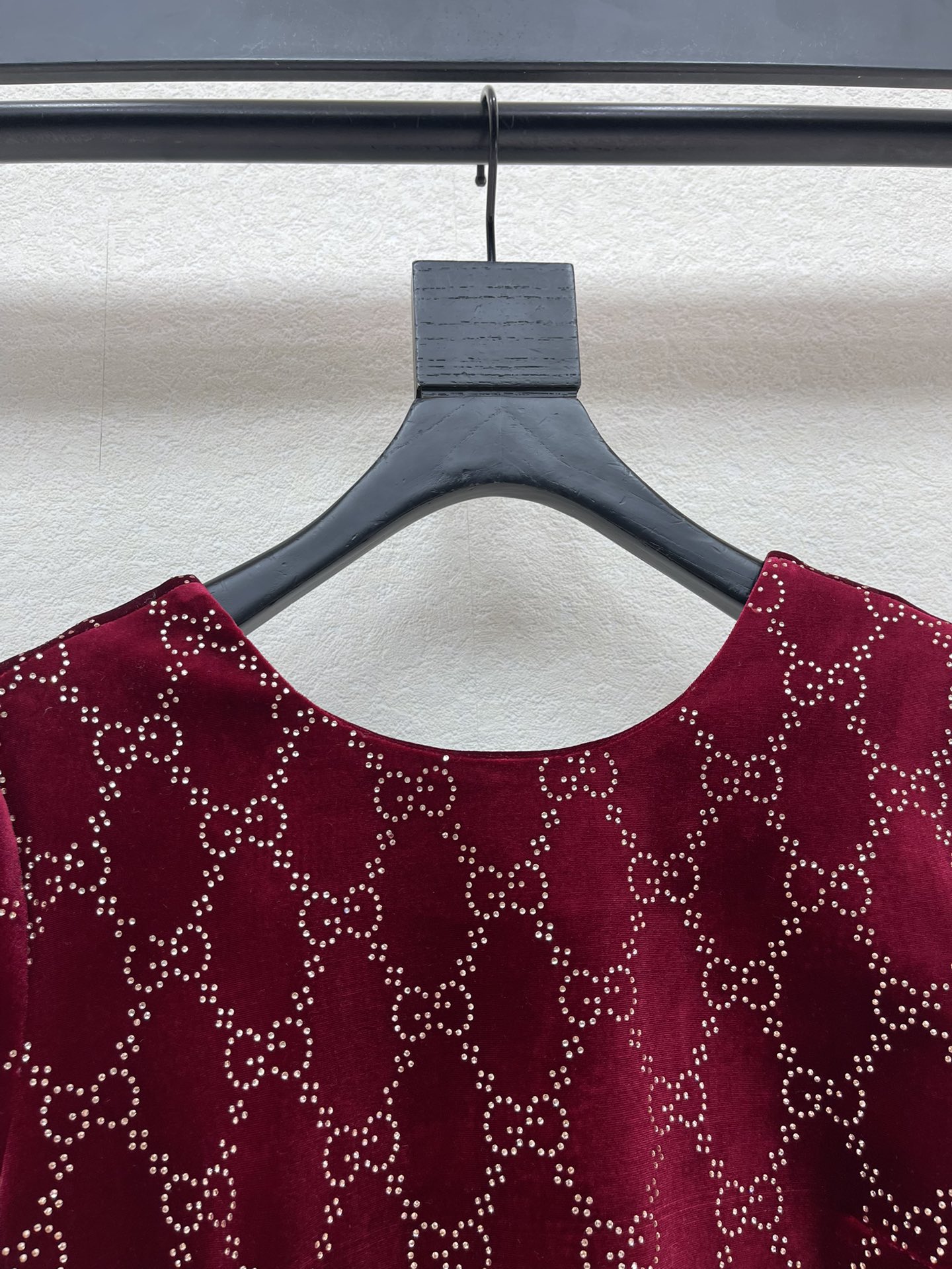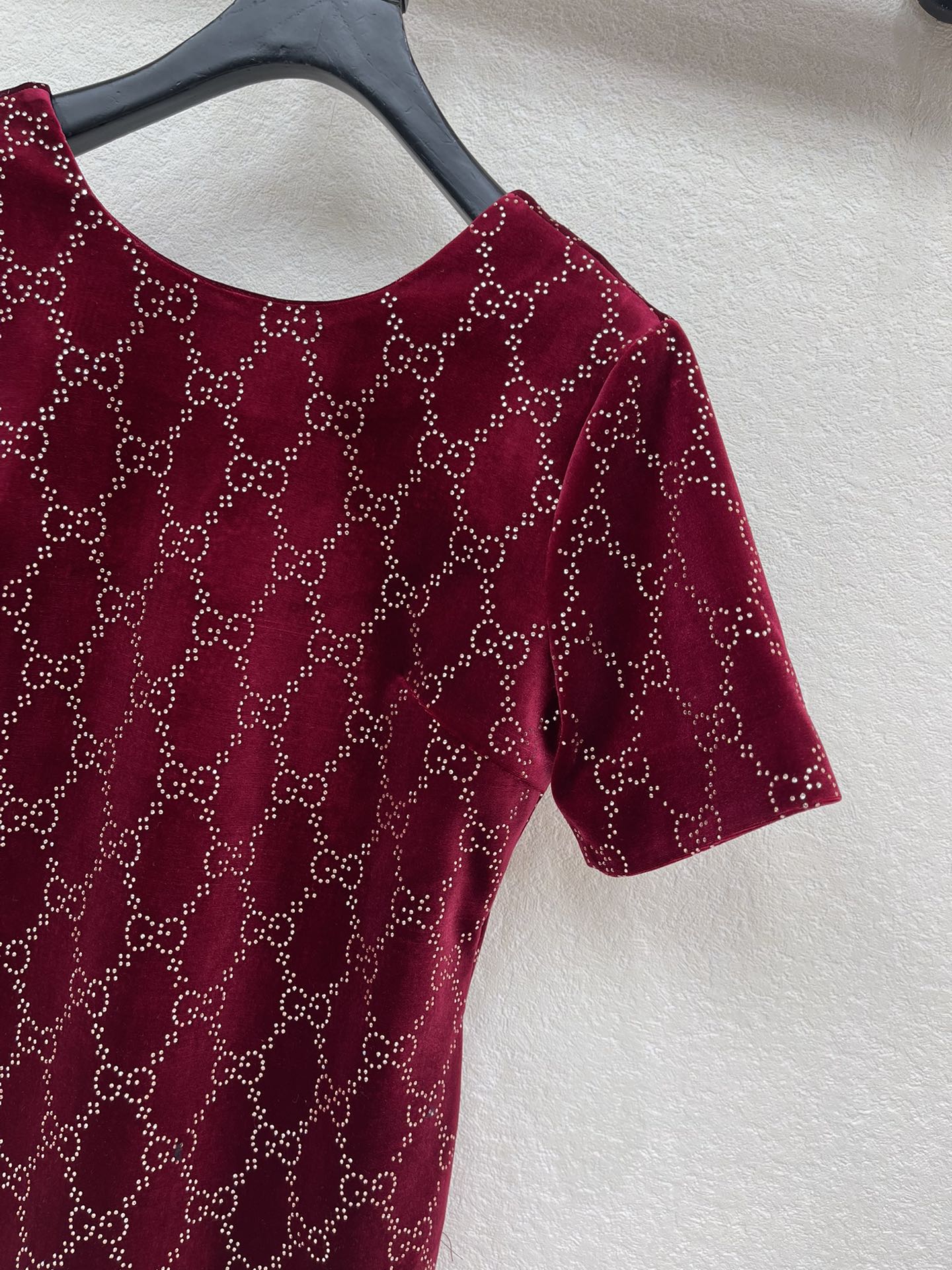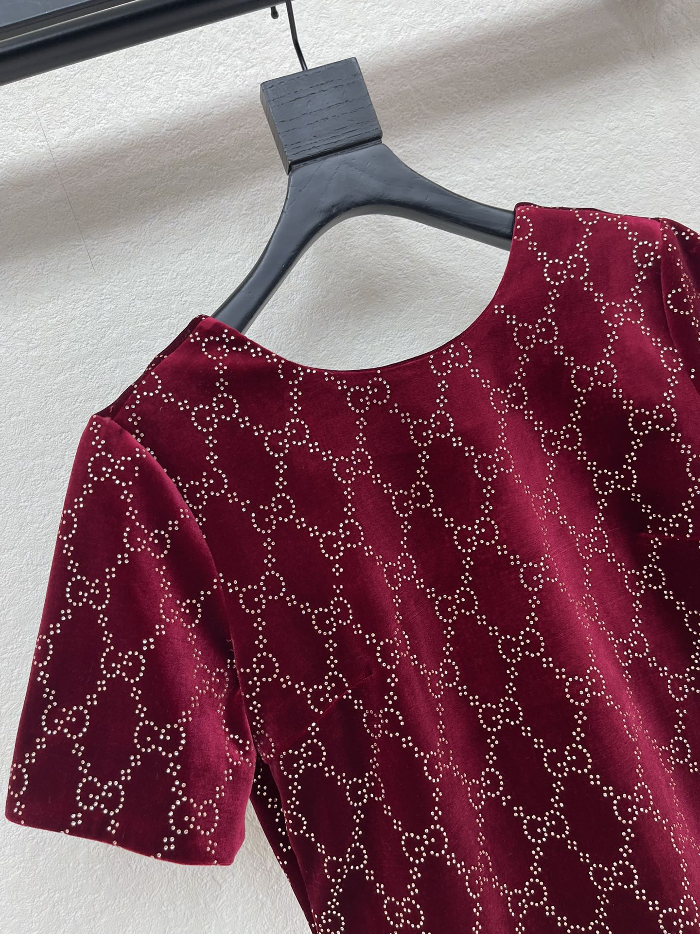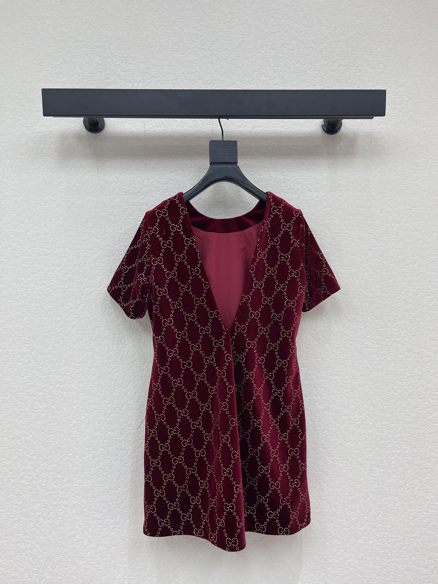 Details: Early spring velvet dress with double G and diamonds, round collar, deep V back, elegant for various occasions.