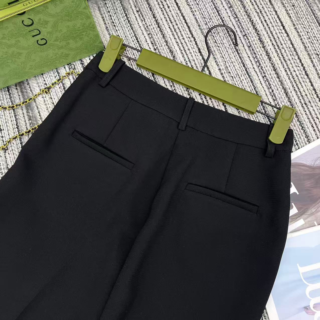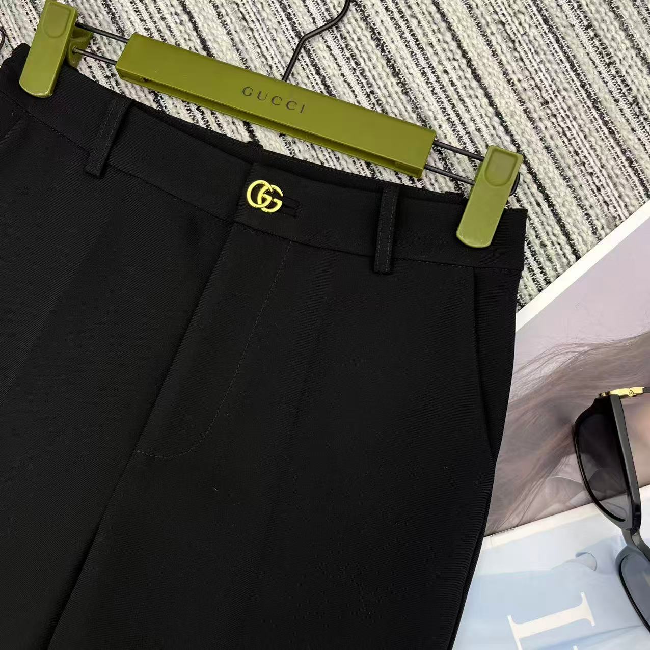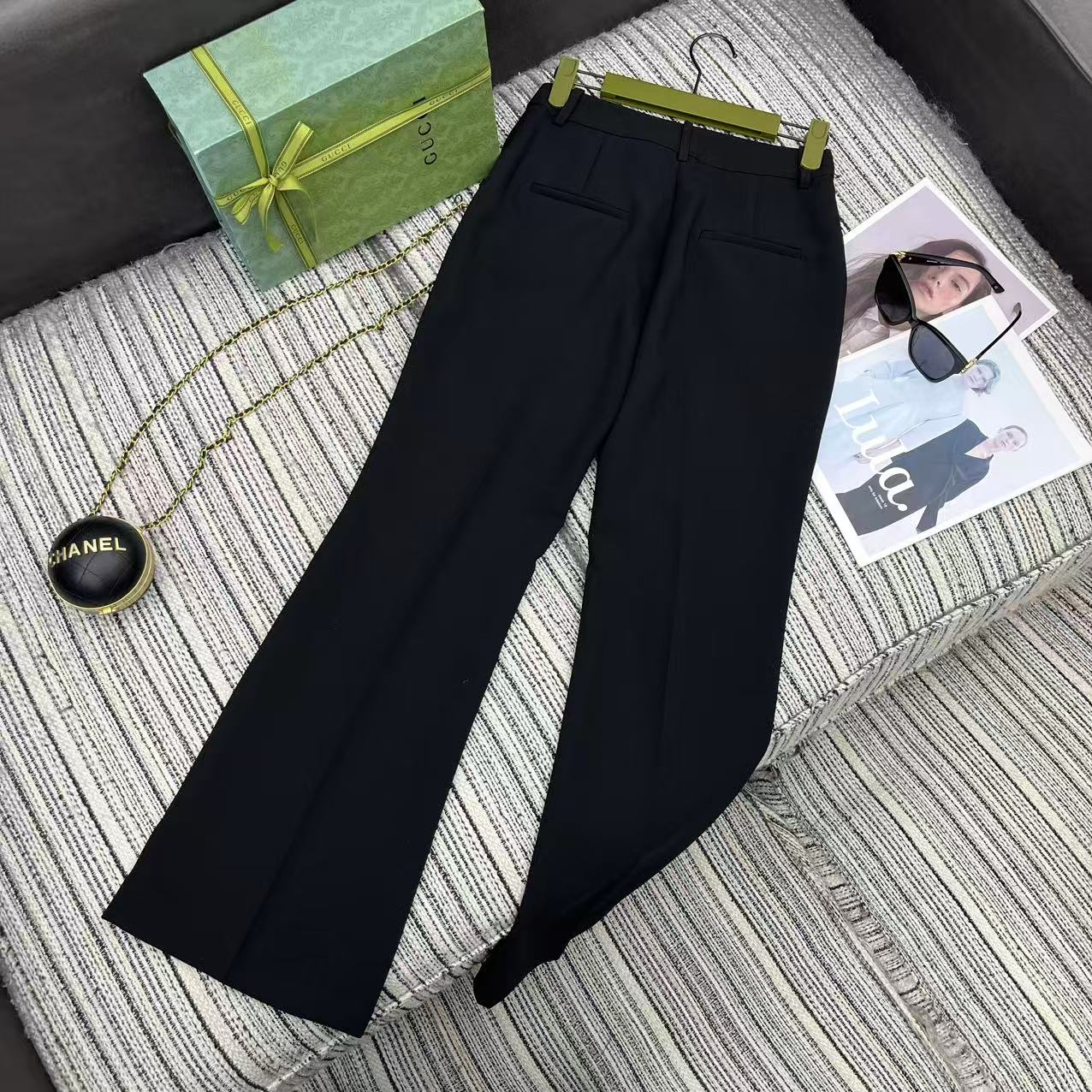 Details: Spring Collection: New Flared Suit Trousers with Metal Double G Buttons, Offering a Great Fit in S, M, L sizes. Custom-tailored with Fine Workmanship, Maintaining 1:1 Original Quality.