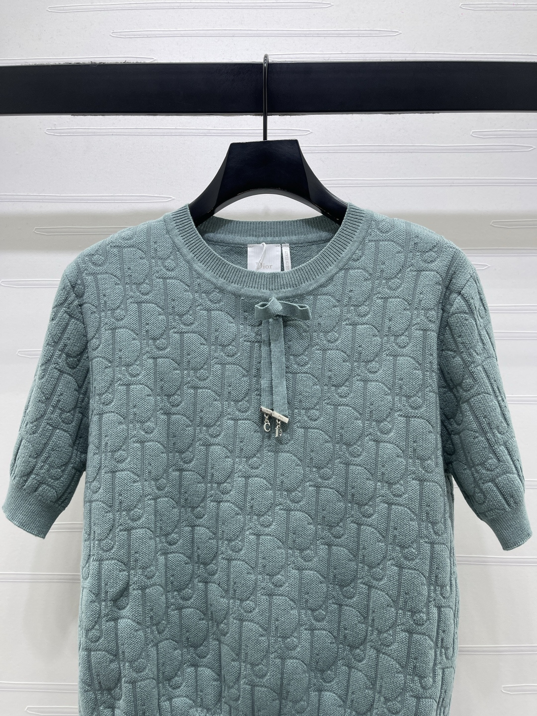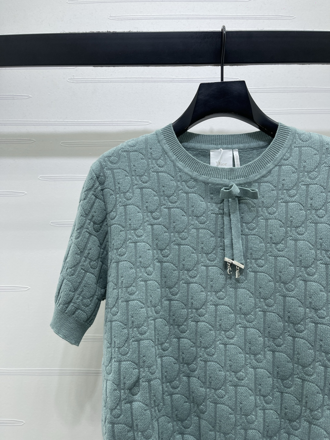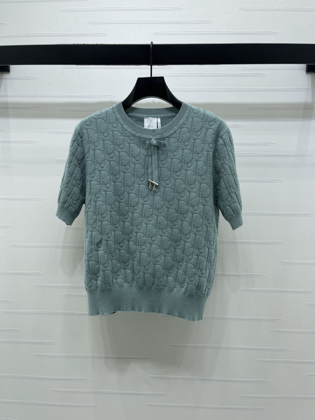 Details: Spring knitted short-sleeved top with jacquard pattern, bowtie, and three colors. High-end custom, fine workmanship
