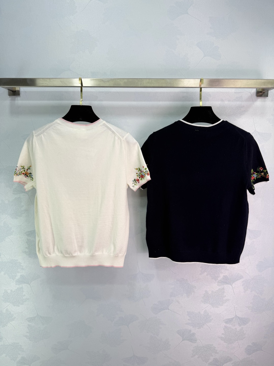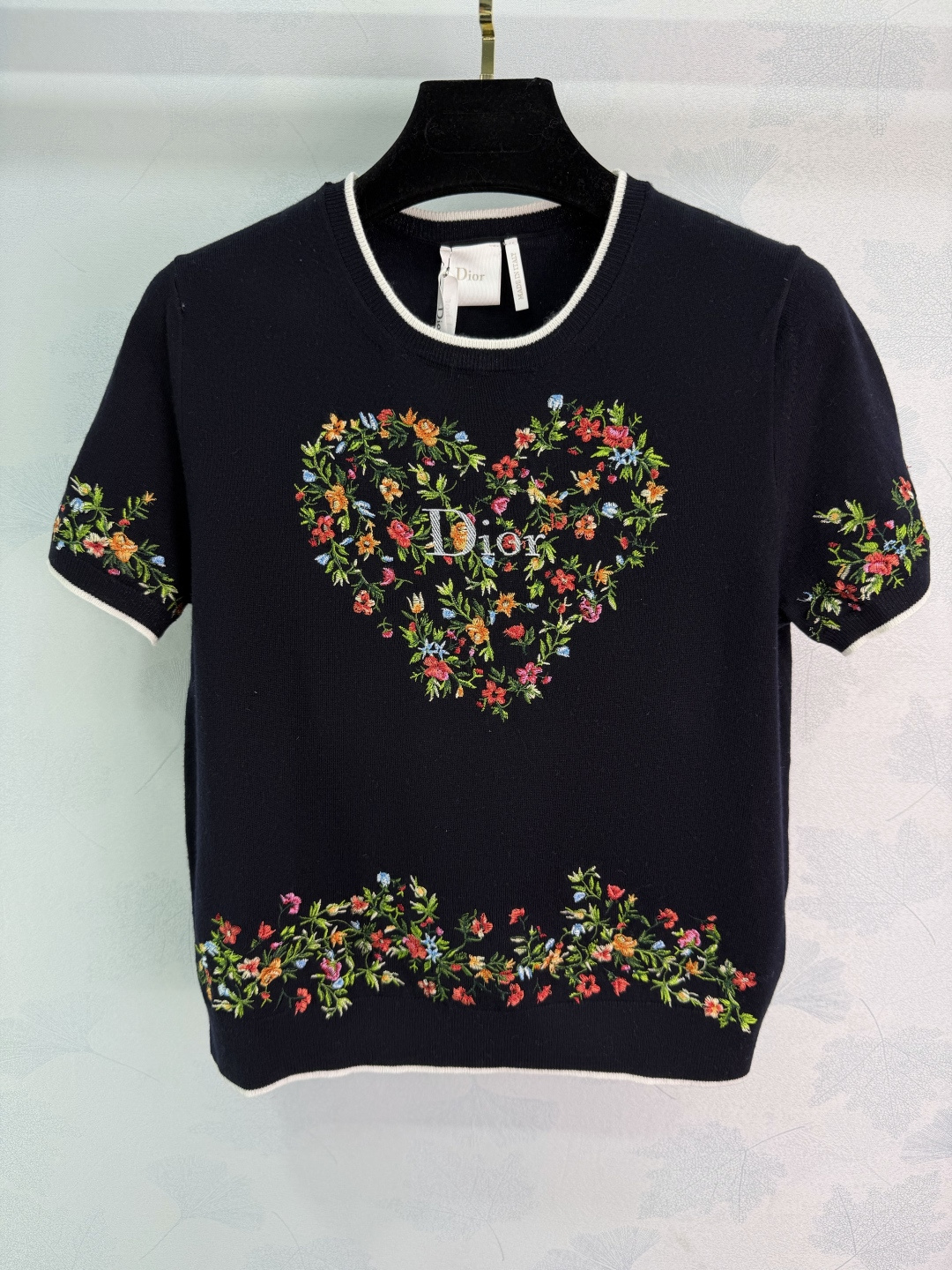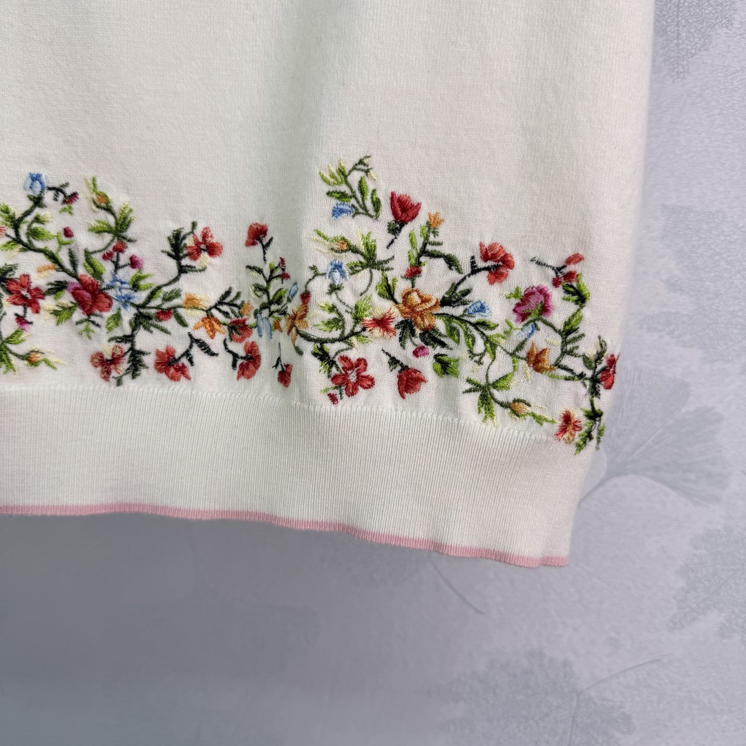 Details: Early spring short-sleeved knitwear, wool material, soft and warm, heart-shaped floral embroidery on chest, suitable for daily or formal occasions.