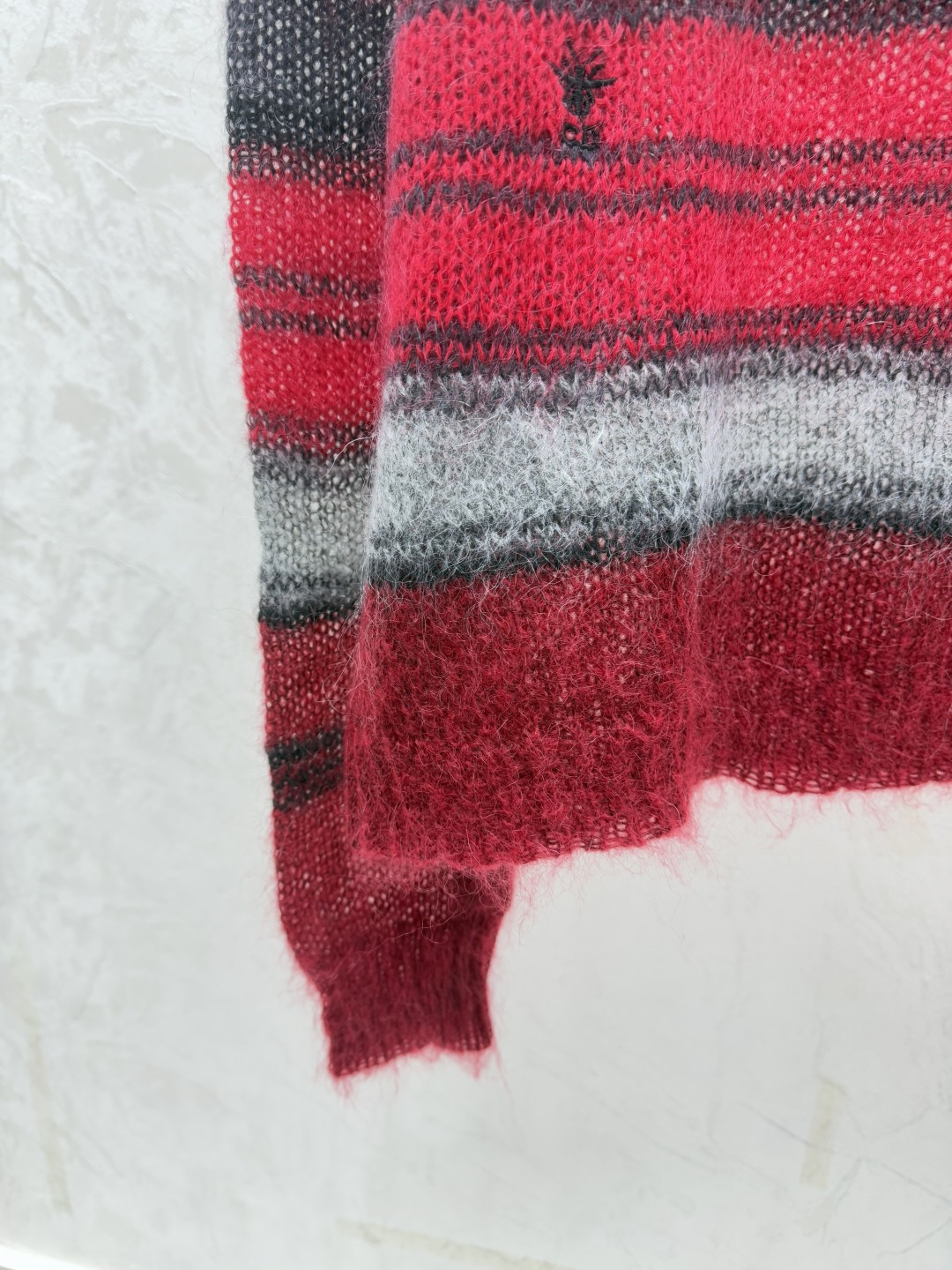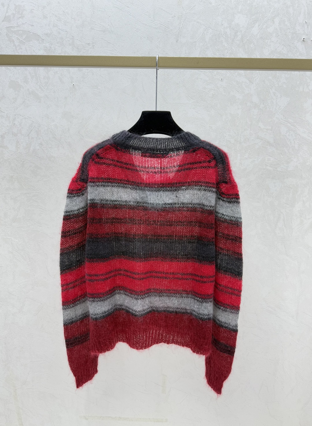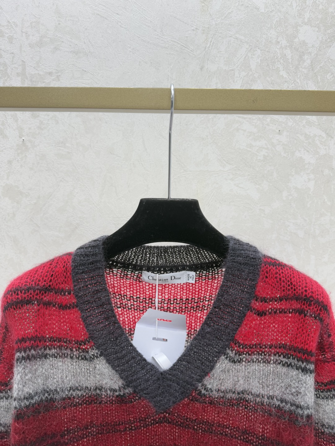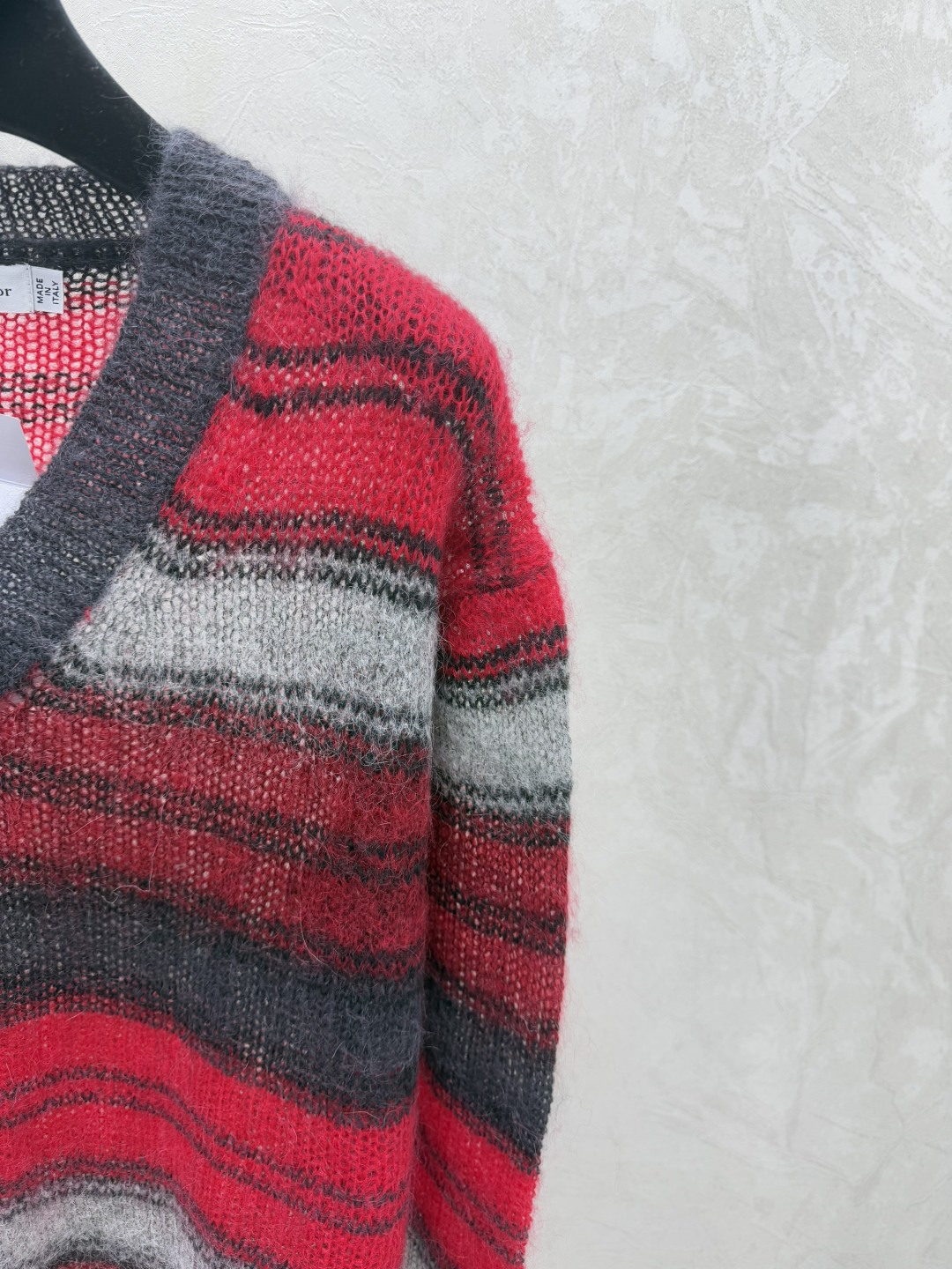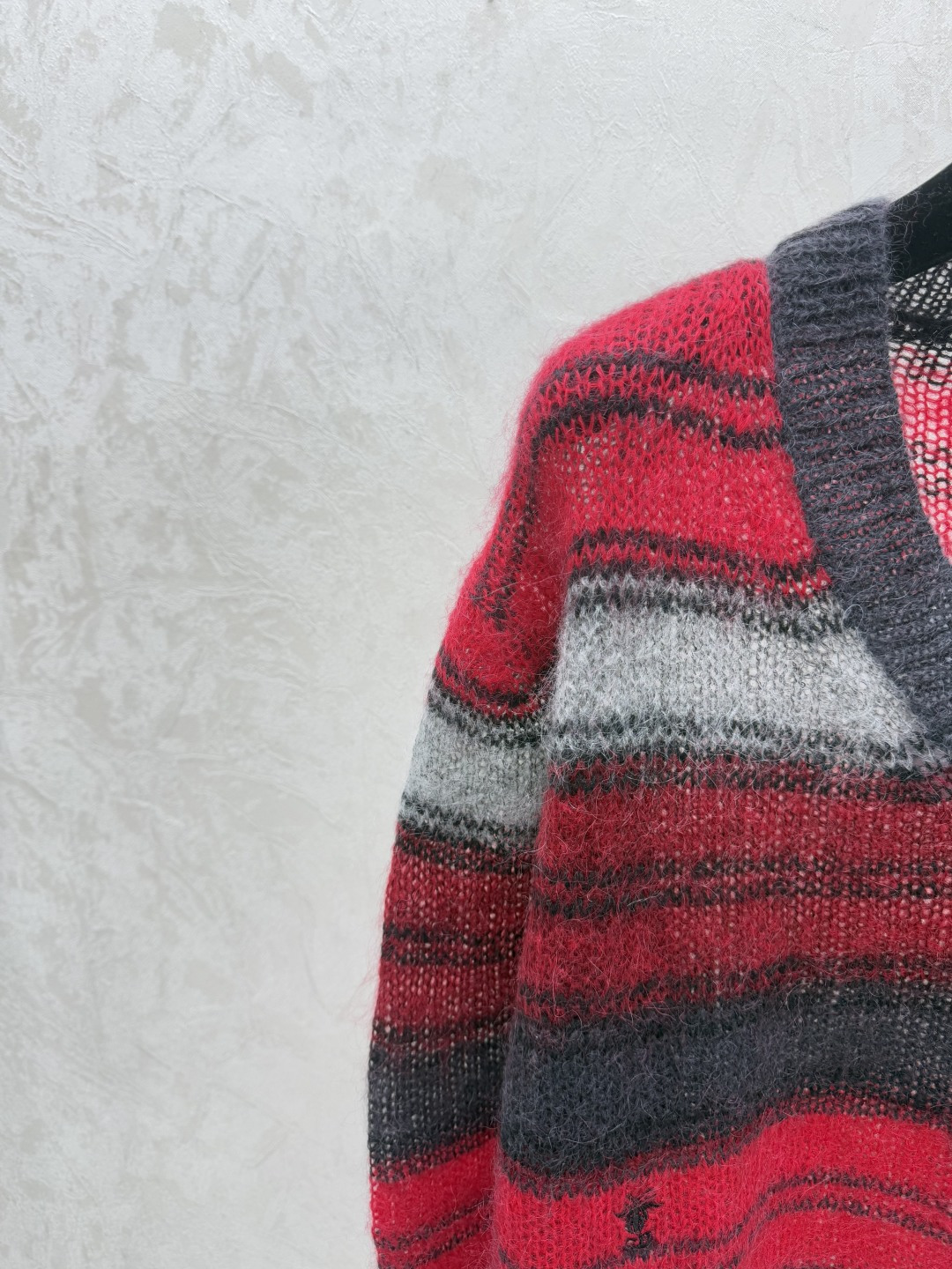 Details: Early autumn knitted long-sleeved top with V-neck and color-blocked stripes.