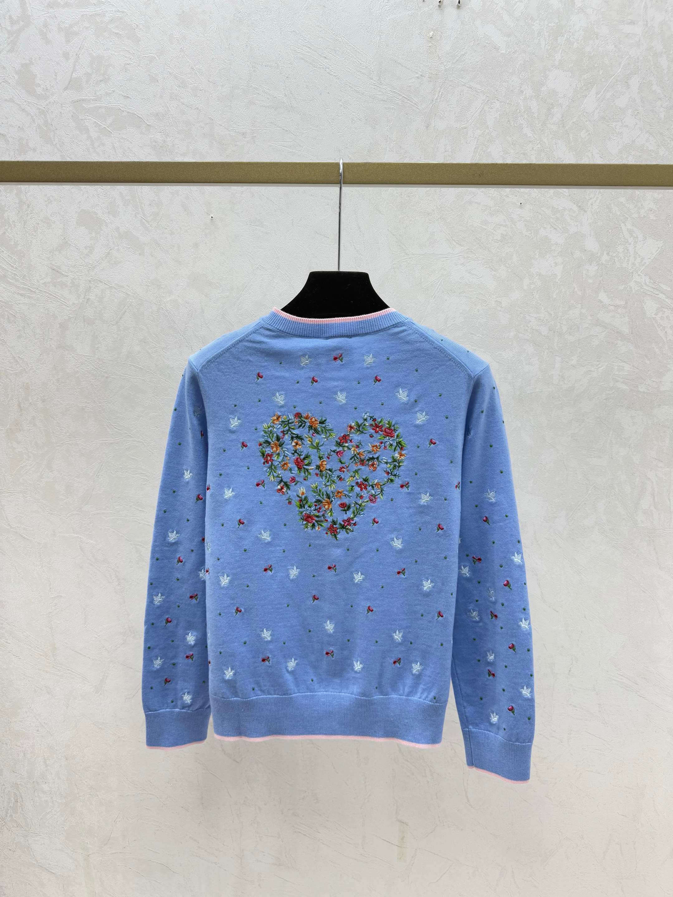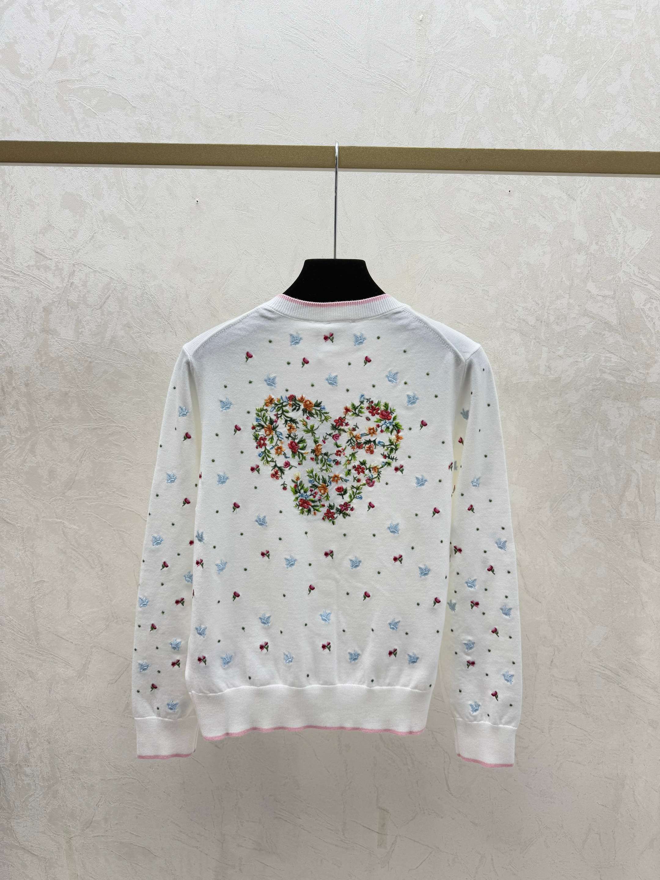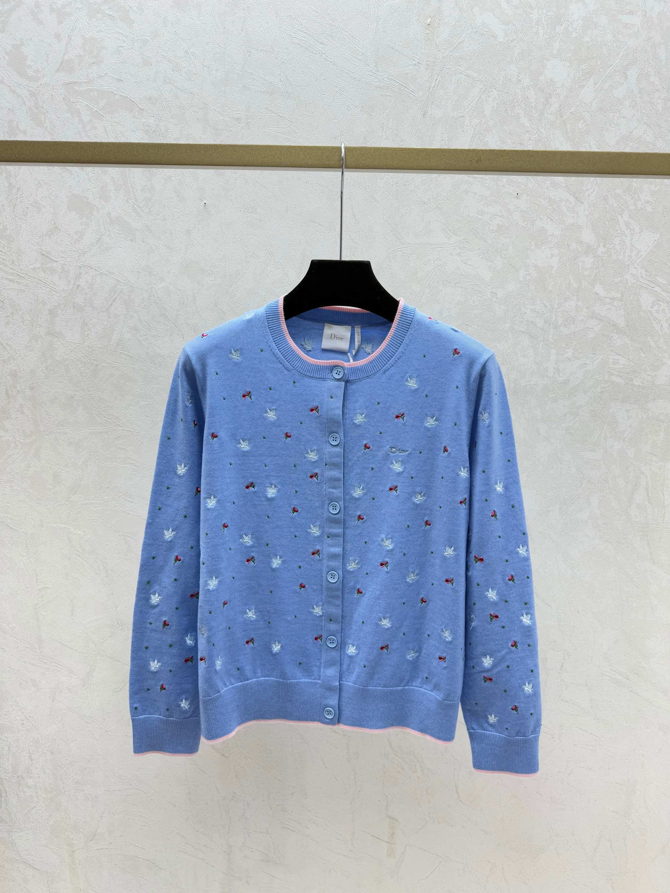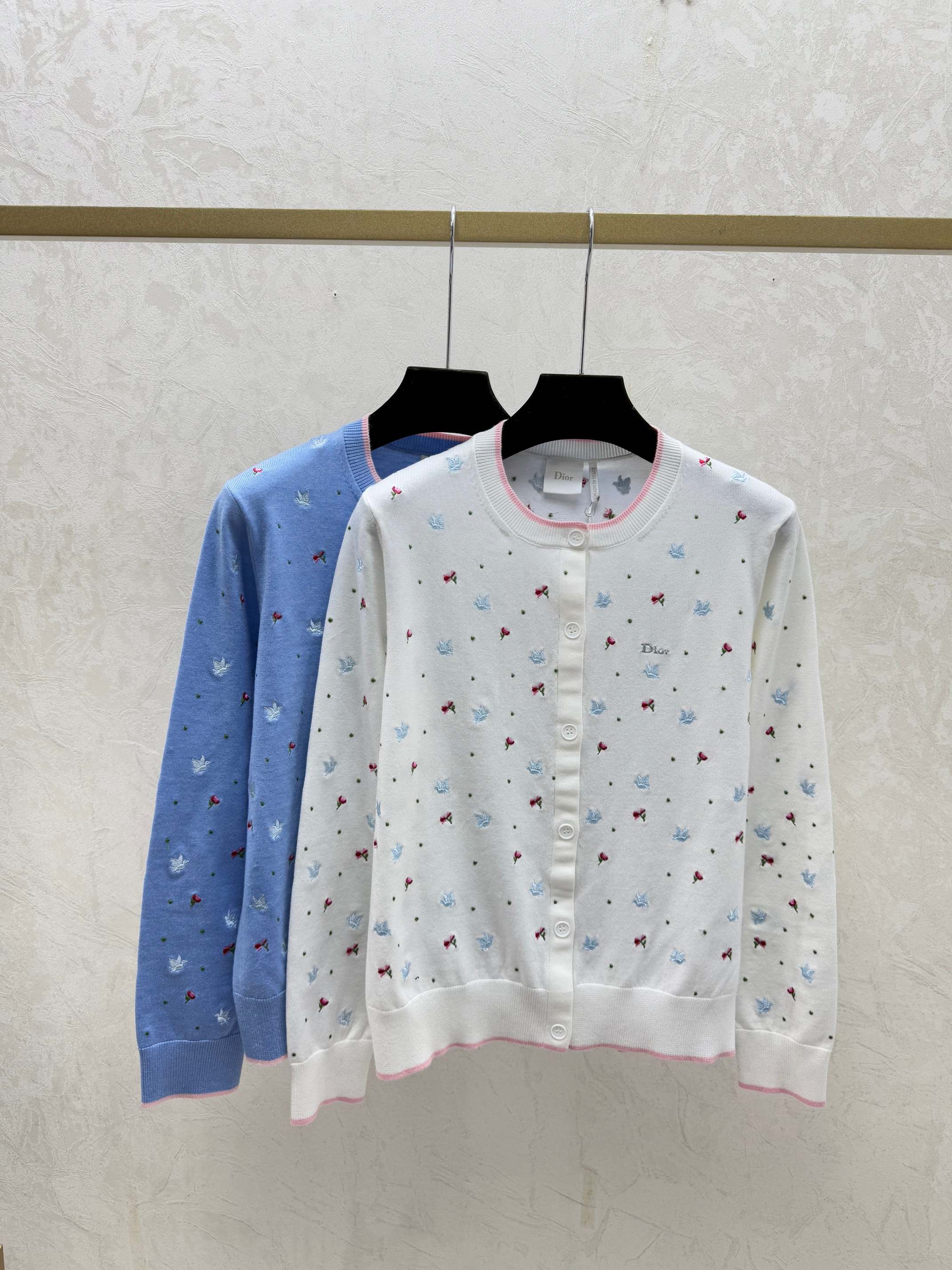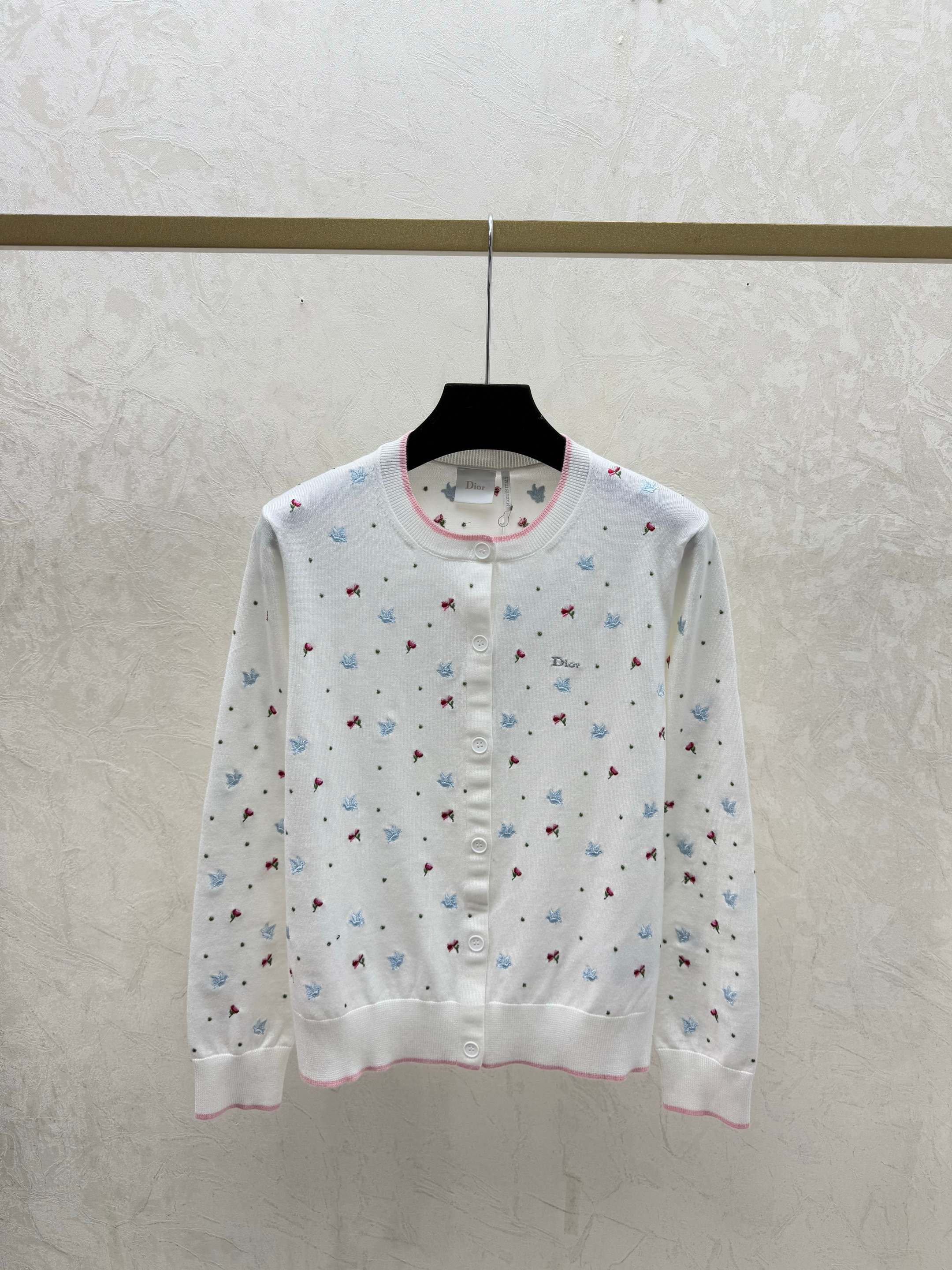 Details: Autumn new white and blue color block floral round neck knitted long sleeve cardigan, available in sizes 36, 38, 40.
