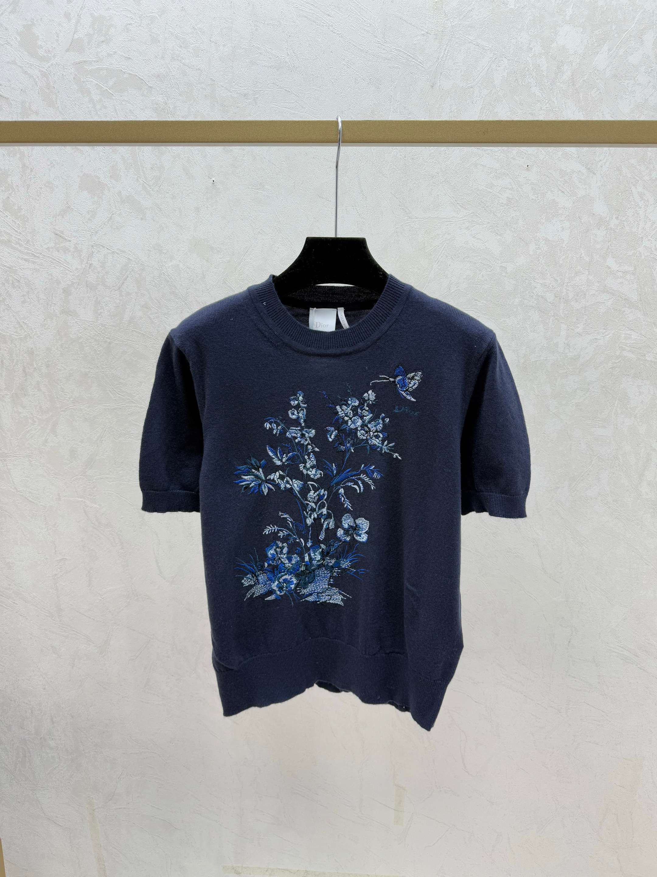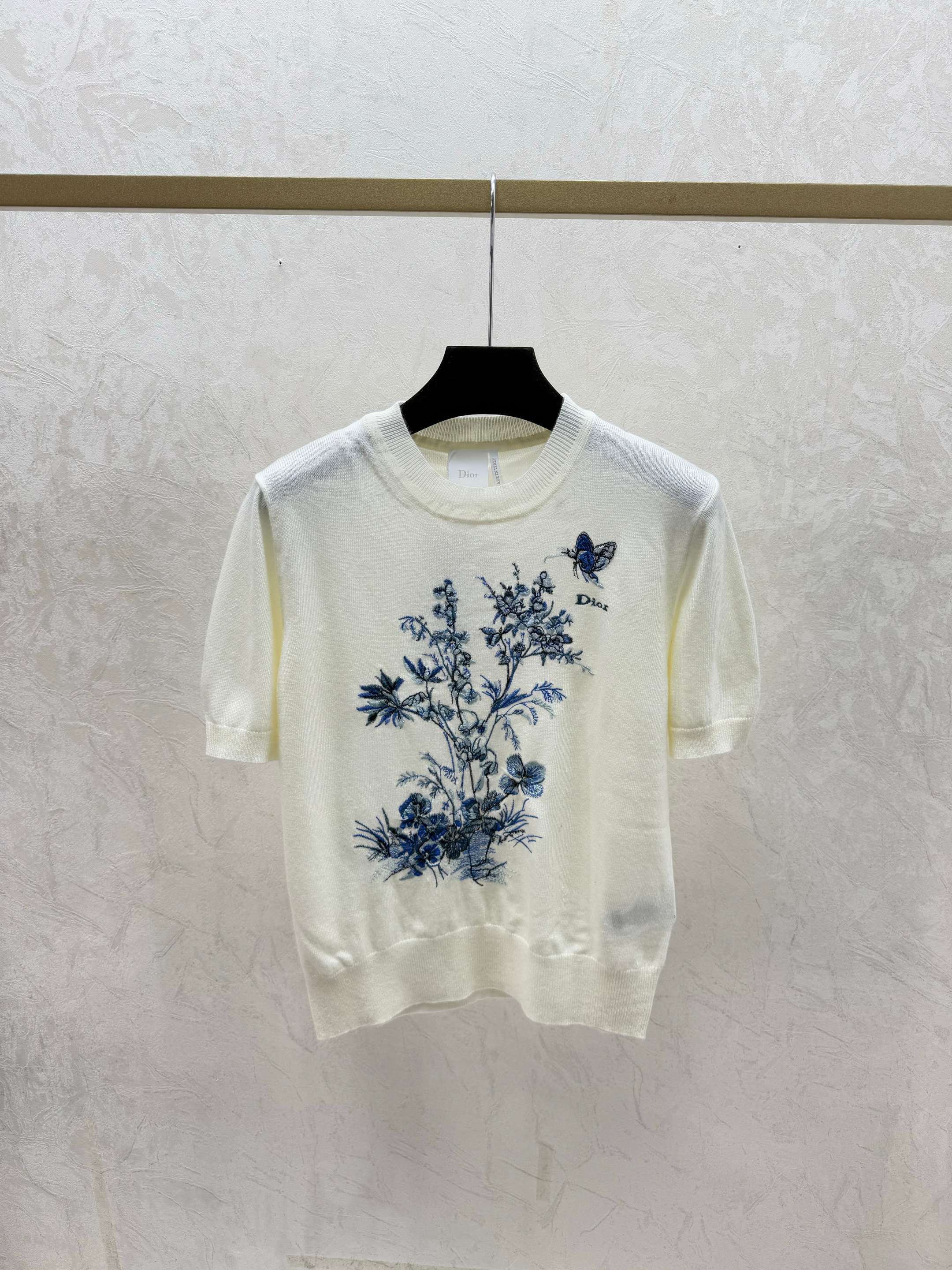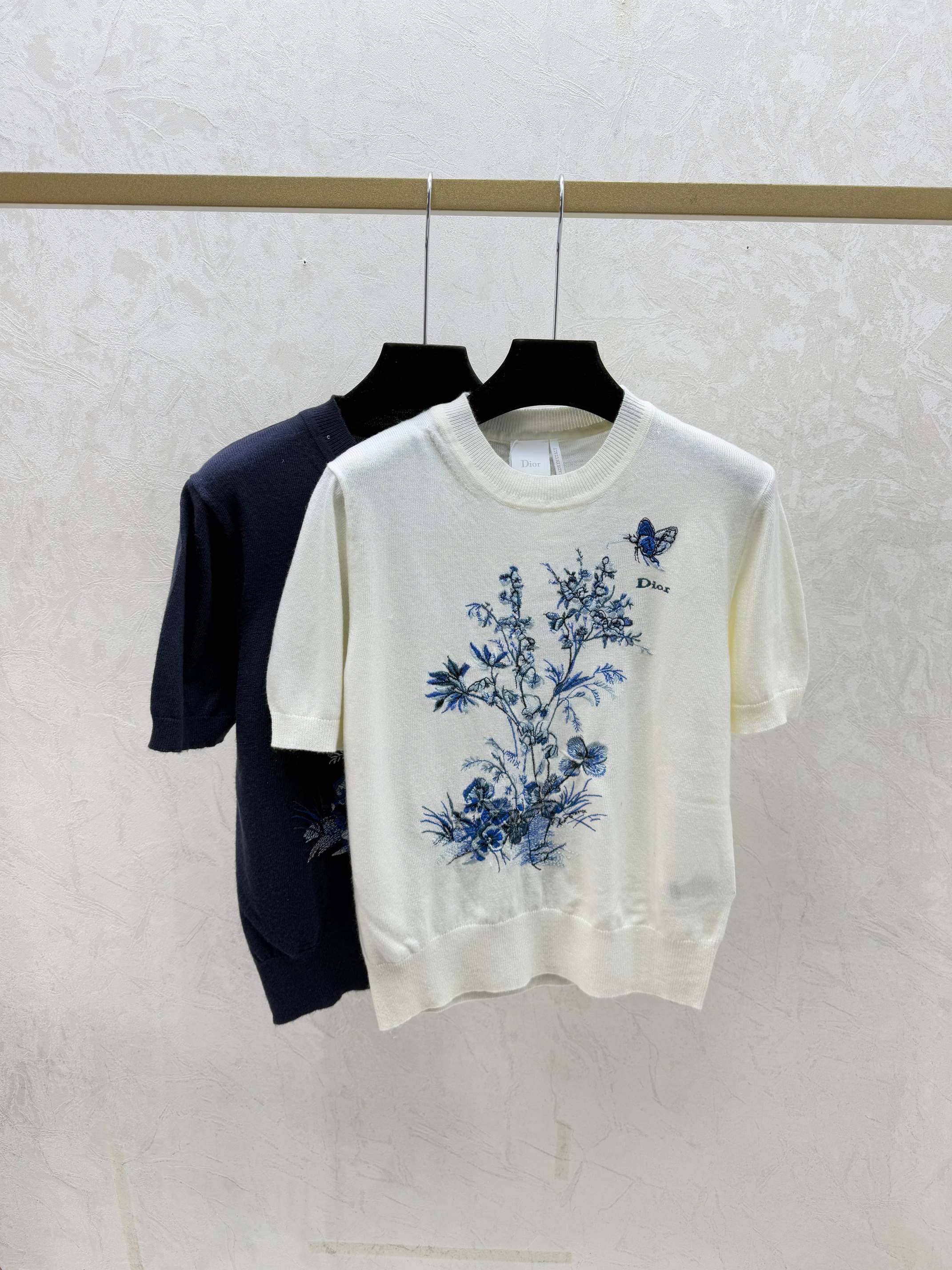 Details: Early spring new style color-blocked butterfly flower round-neck knitted short-sleeved top in white and royal blue, sizes 36, 38, 40.