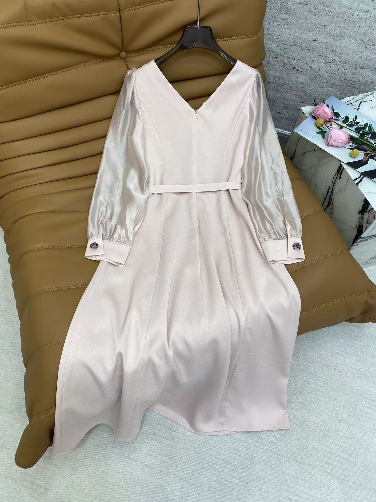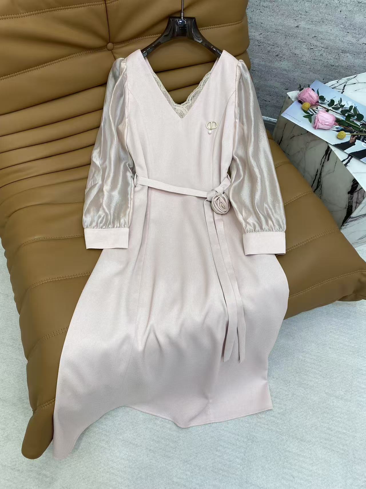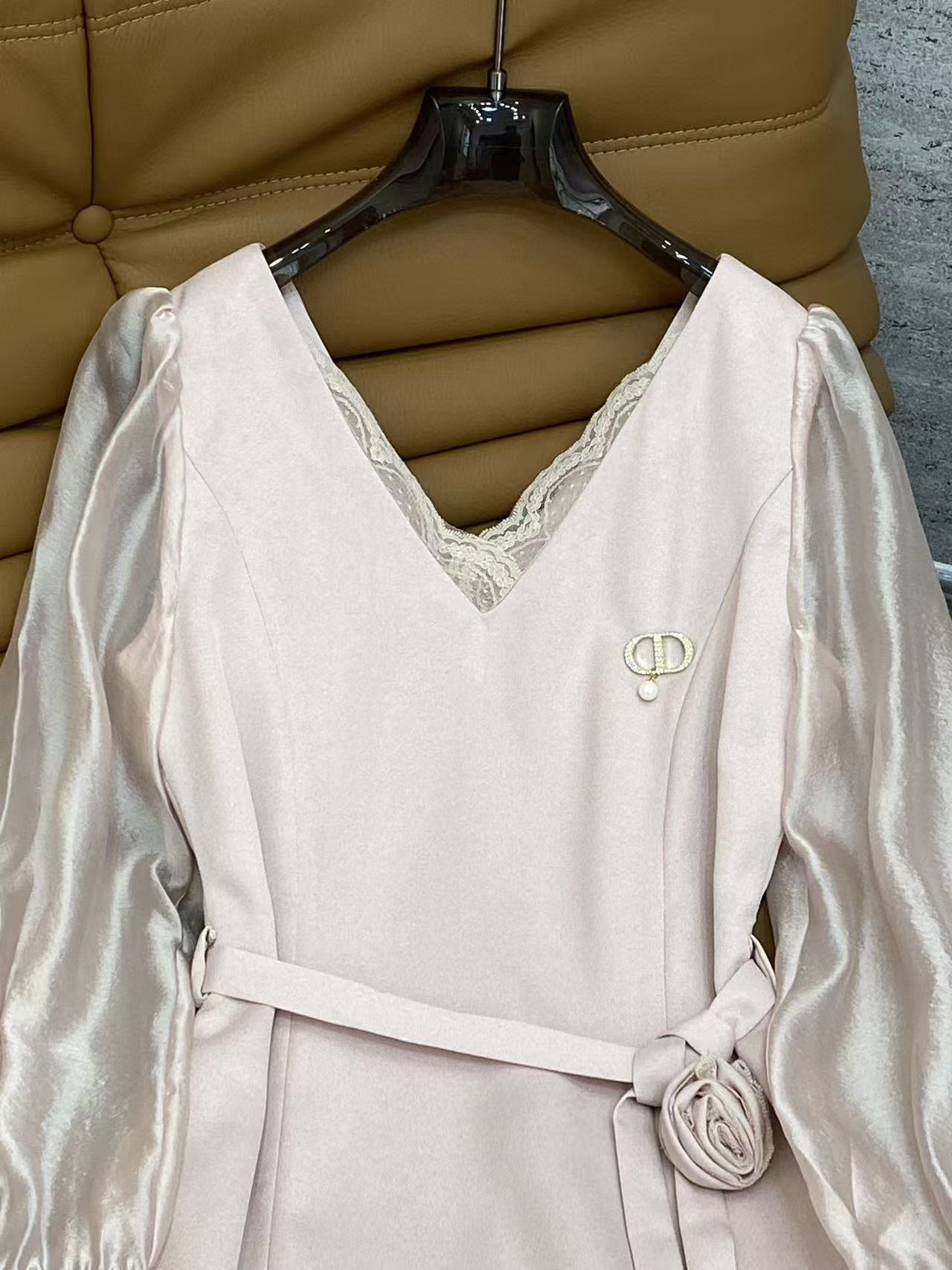 Details: Spring Satin Dress, V-neck with Lace, Mesh Puff Sleeves, Waist Tie, 4 Colors, 4 Sizes
