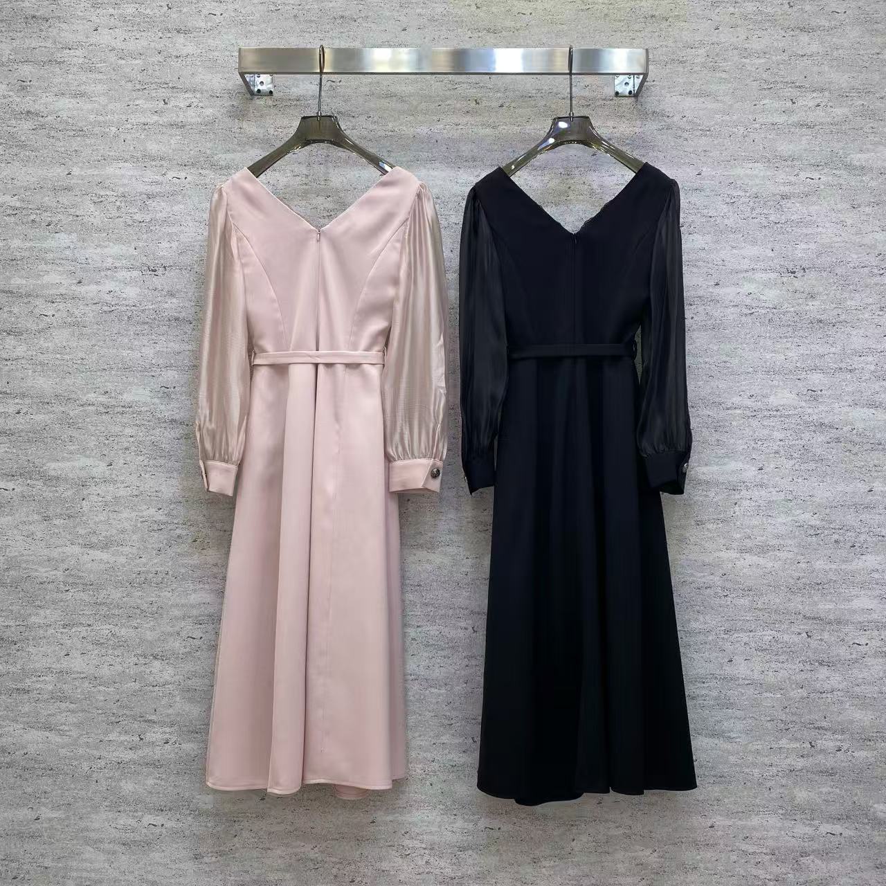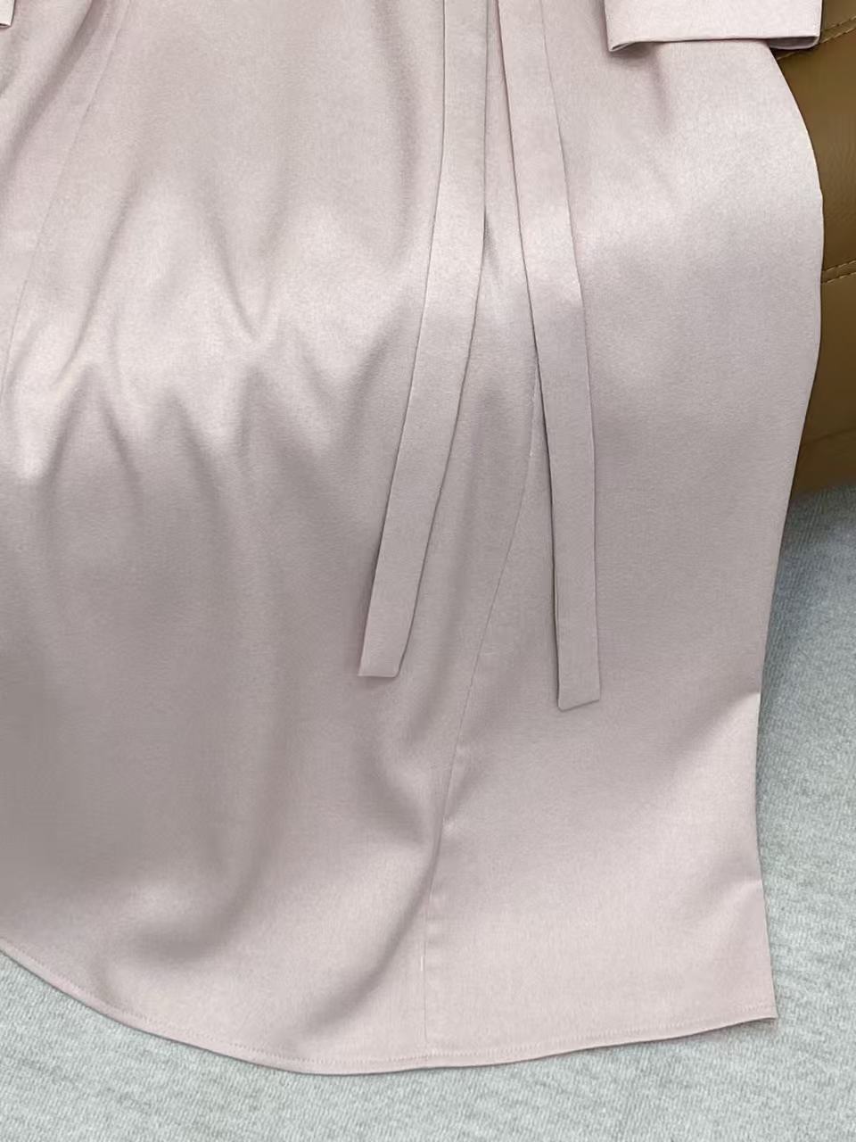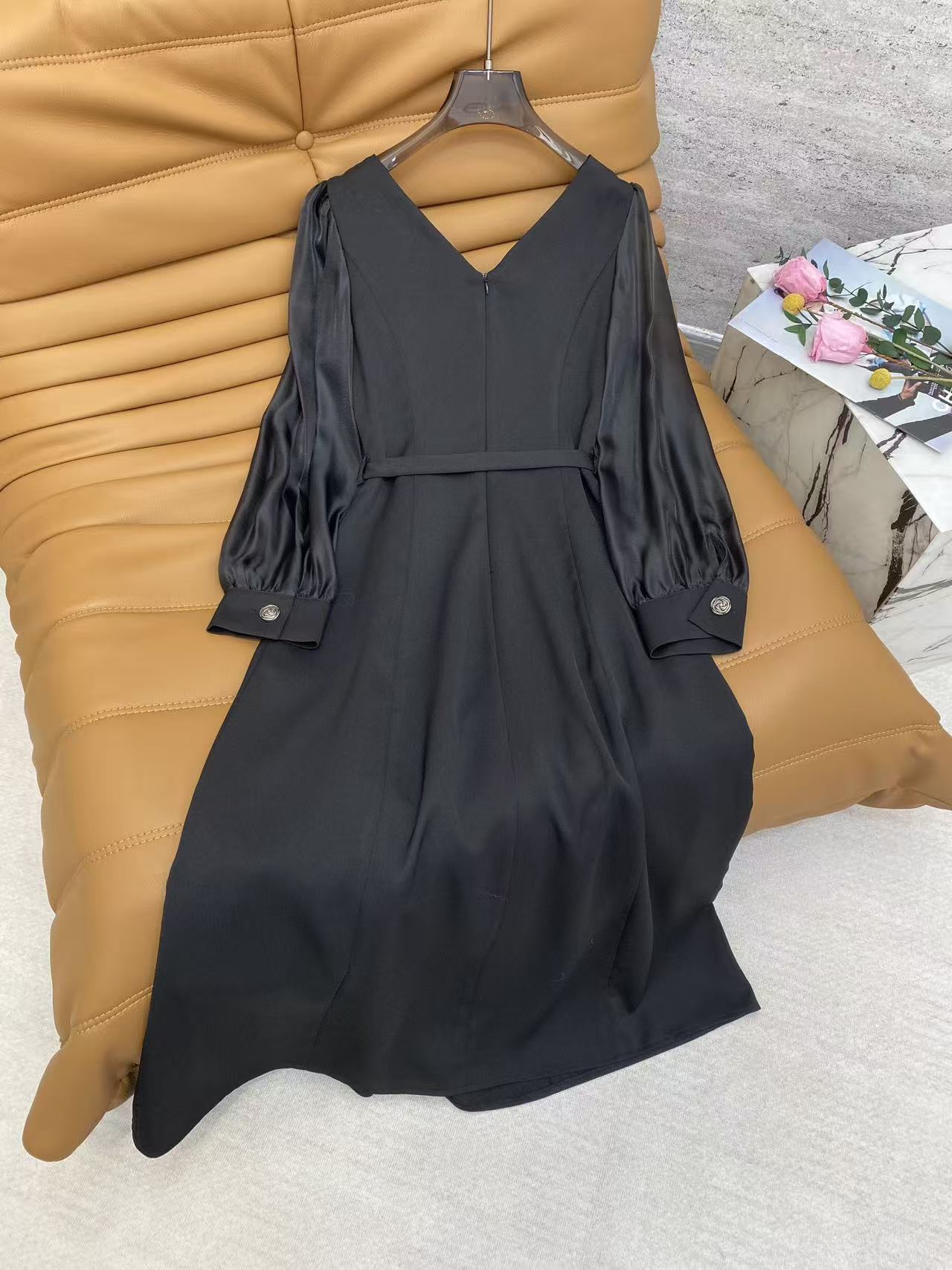 Details: Spring Satin Dress, V-neck with Lace, Mesh Puff Sleeves, Waist Tie, 4 Colors, 4 Sizes