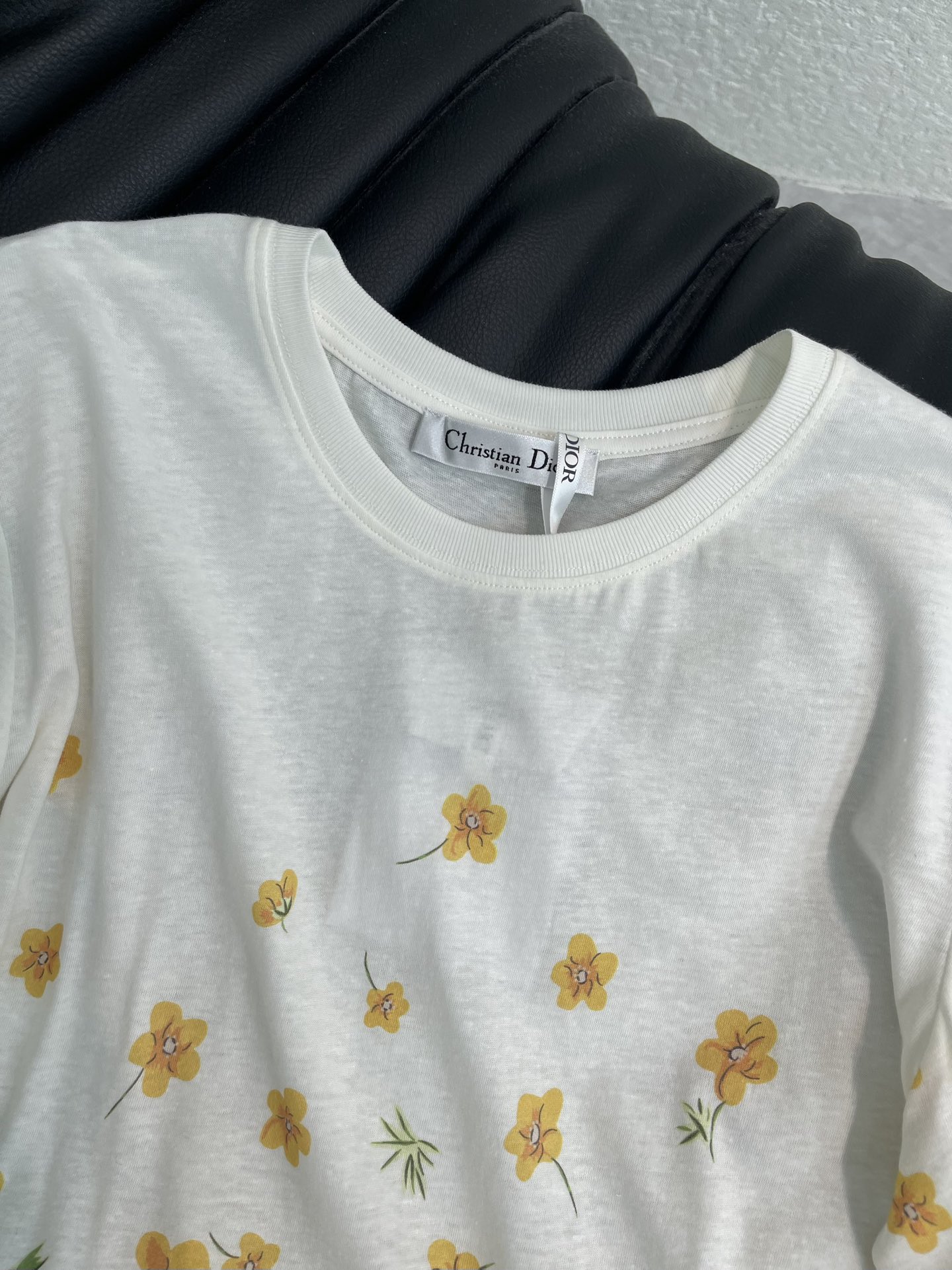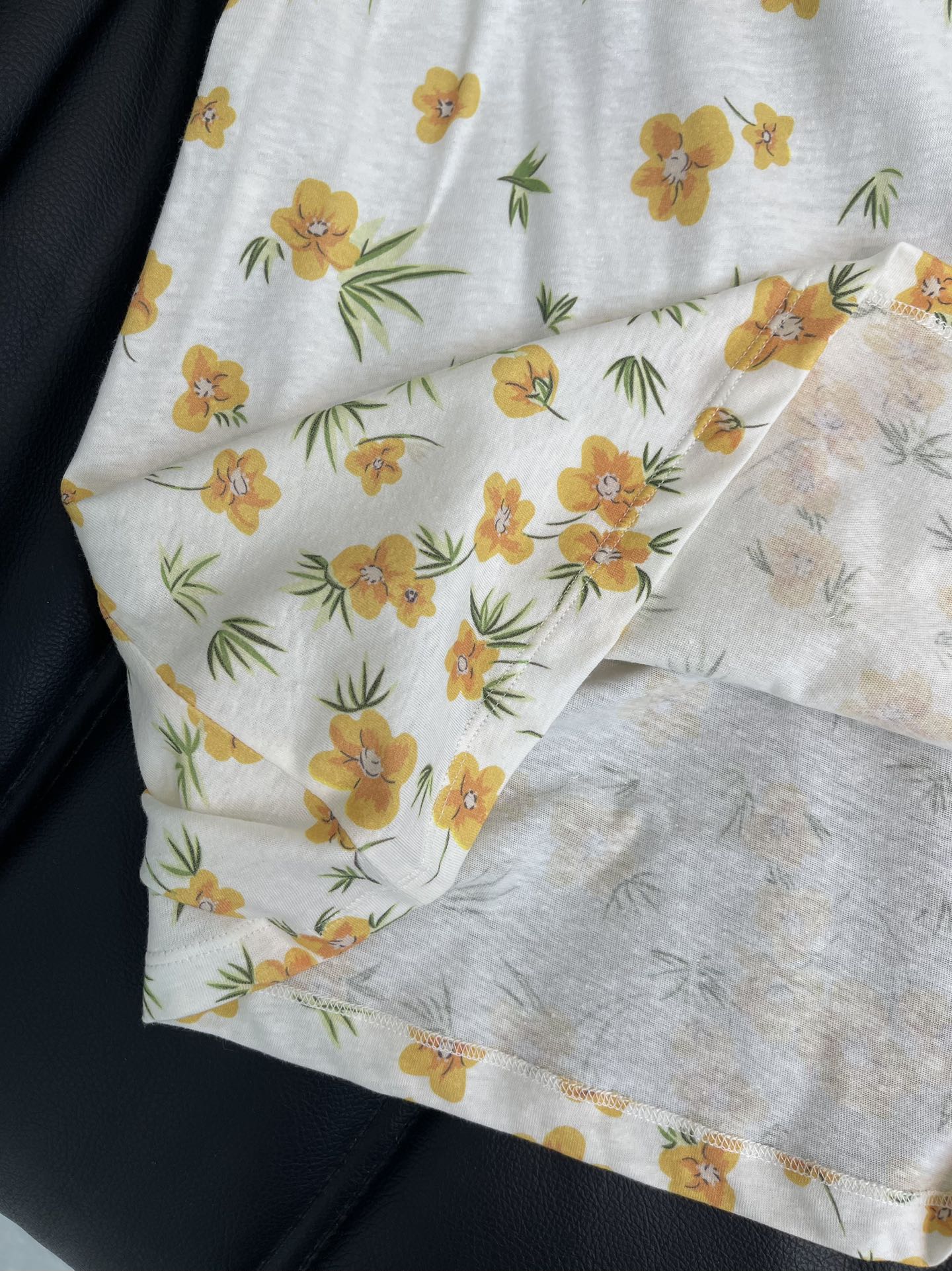 Details: Spring-Summer New Yellow Flower and Green Leaf All-Over Print Short-Sleeve T-Shirt, Cotton Fabric, High Density, Stylish Sporty, High Quality, SML Sizes.