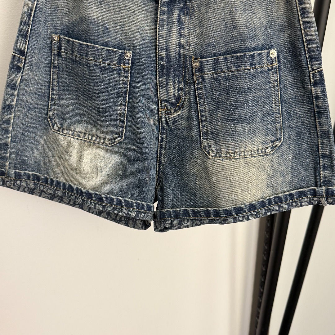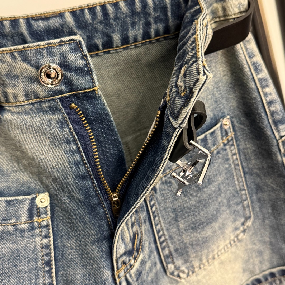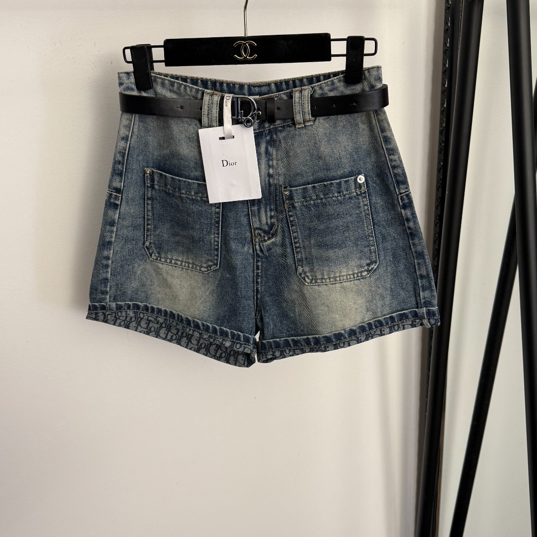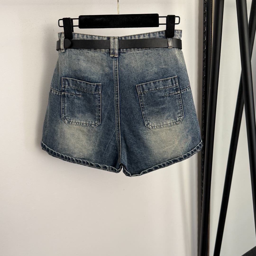 Details: New blue denim shorts with monogram rolled cuffs, includes a belt, size medium. Custom-made with fine stitching, ensuring high-quality finish.