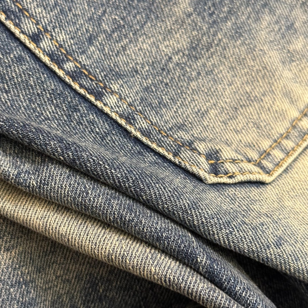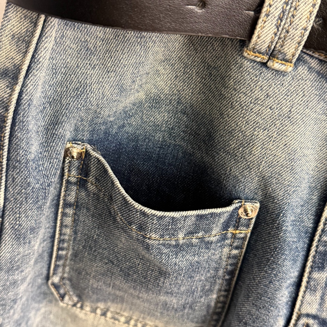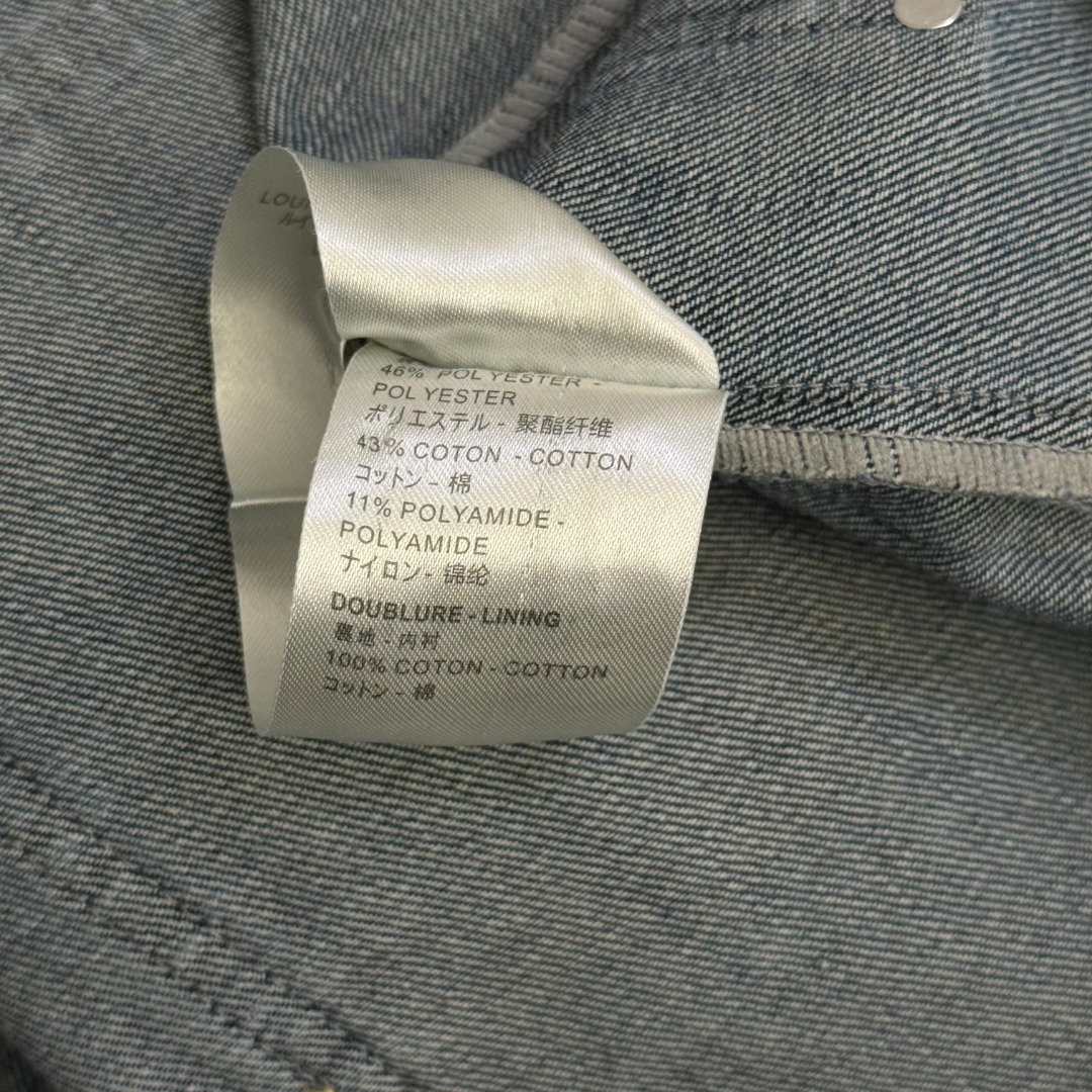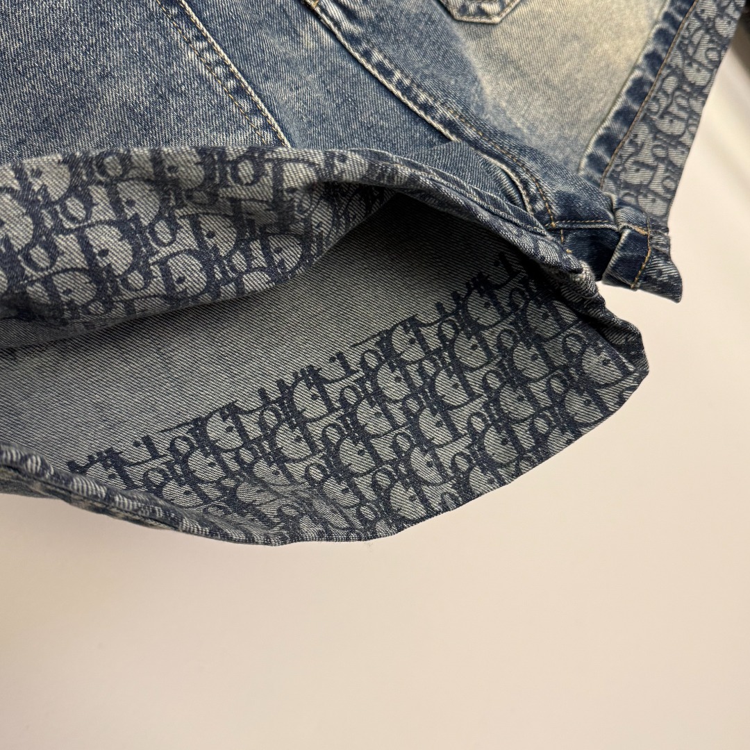 Details: New blue denim shorts with monogram rolled cuffs, includes a belt, size medium. Custom-made with fine stitching, ensuring high-quality finish.