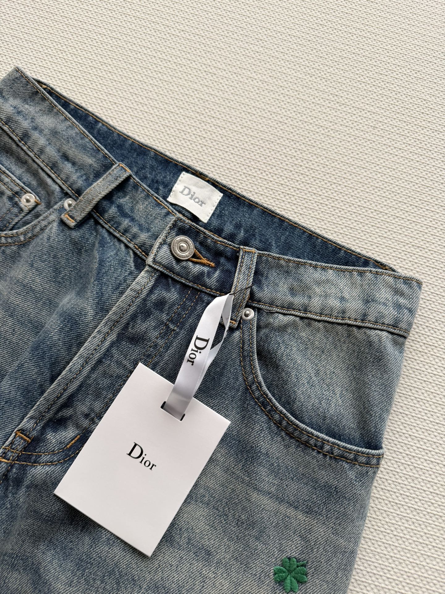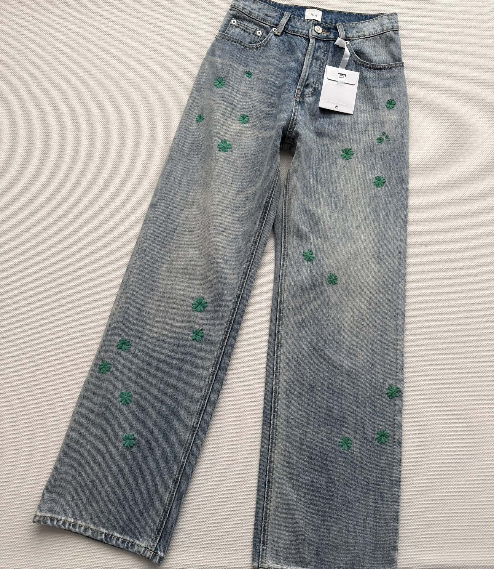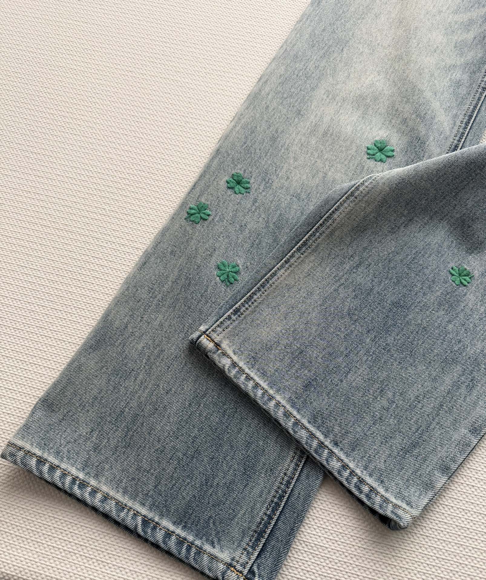 Details: High-waisted straight-leg jeans adorned with green clover embroidery, symbolizing freshness and luck. The flattering high-waist design is both comfortable and leg-lengthening, suitable for daily wear or leisure activities.