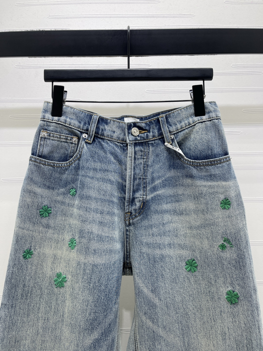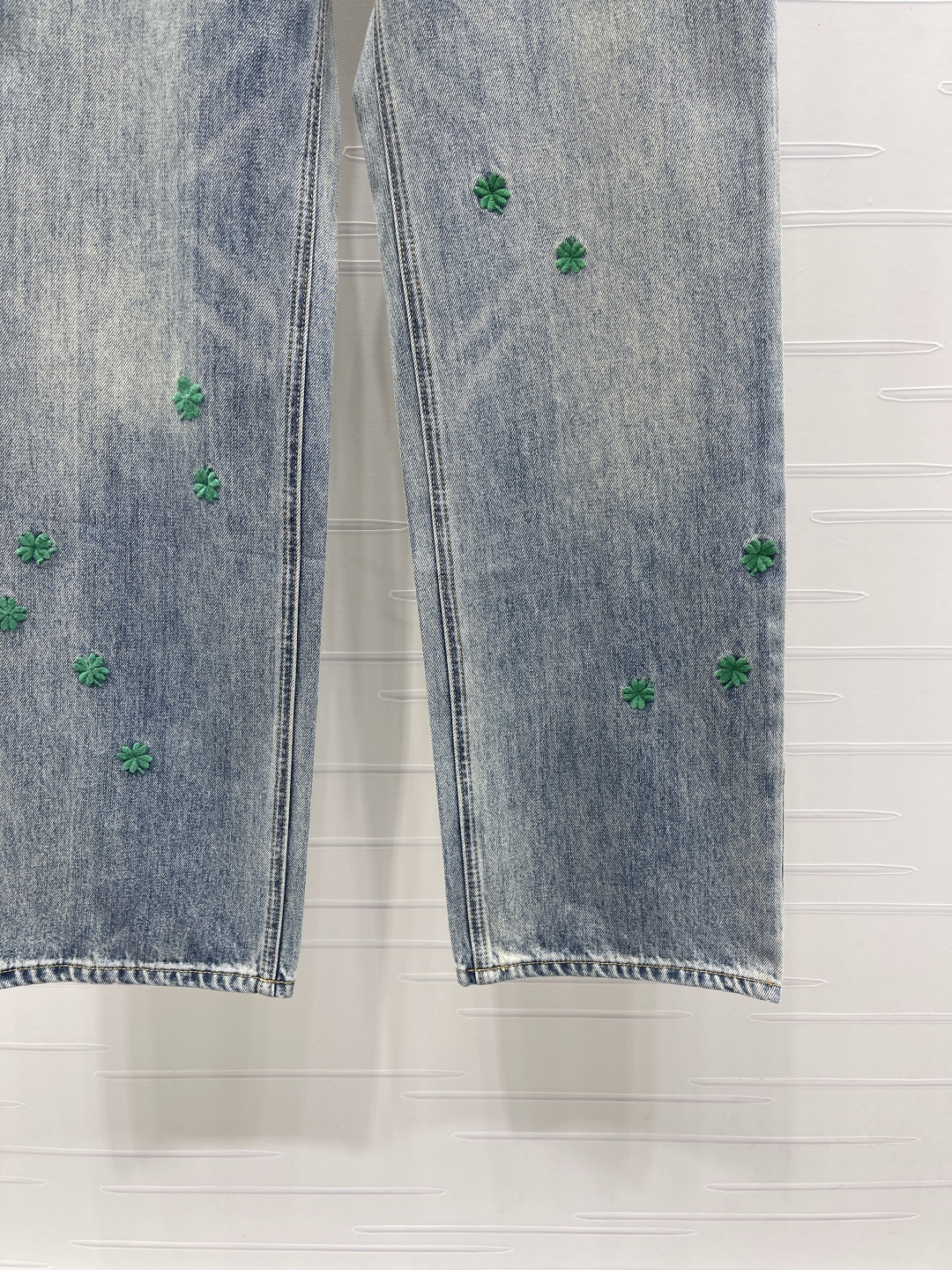 Details: Early Spring New: Four - Leaf Clover Embroidered Denim Jeans, High - Quality Cotton, Vintage Wash, Lucky Charm Design, High - Waisted Straight Fit, Custom - Made, Fine Craftsmanship, Authentic Quality