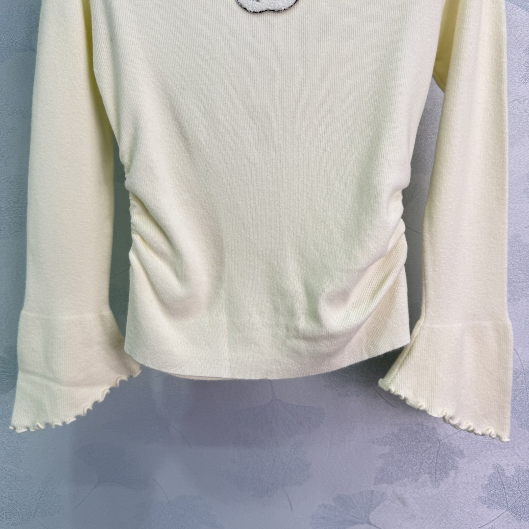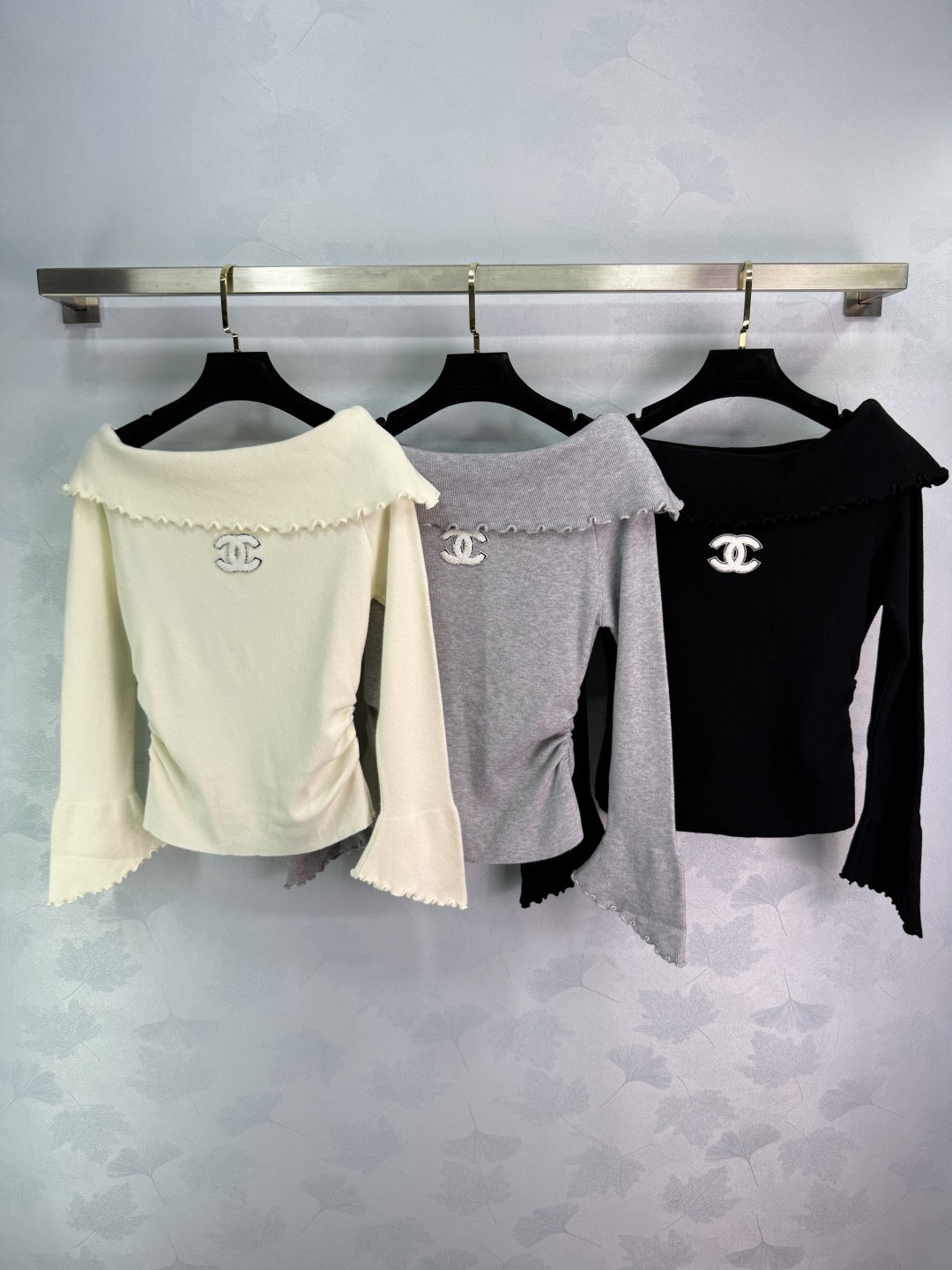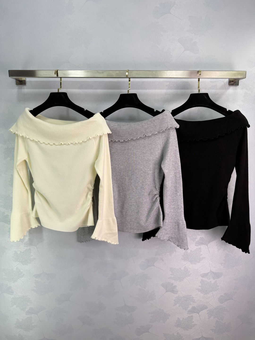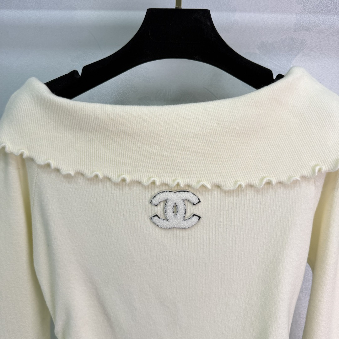 Details: Off-shoulder knit sweater with ruffled trim, small logo embroidery, flared sleeves, soft fabric, and slim fit, presenting a luxurious and stylish look, available in three colors and SML sizes.
