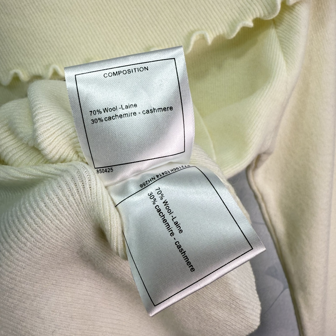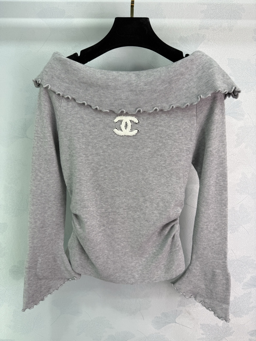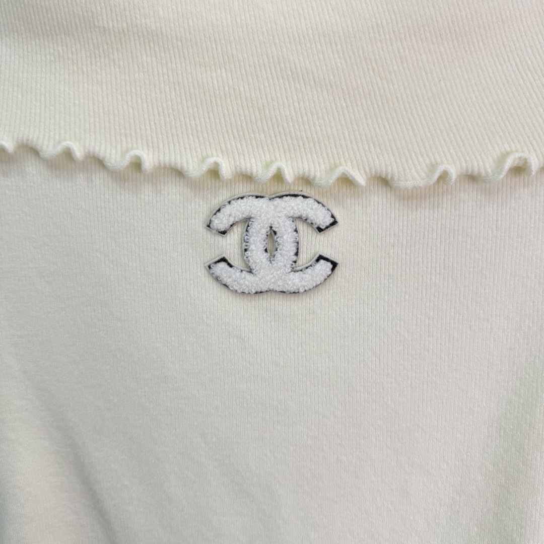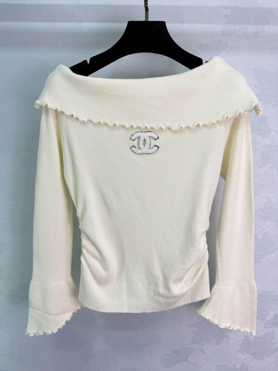 Details: Off-shoulder knit sweater with ruffled trim, small logo embroidery, flared sleeves, soft fabric, and slim fit, presenting a luxurious and stylish look, available in three colors and SML sizes.
