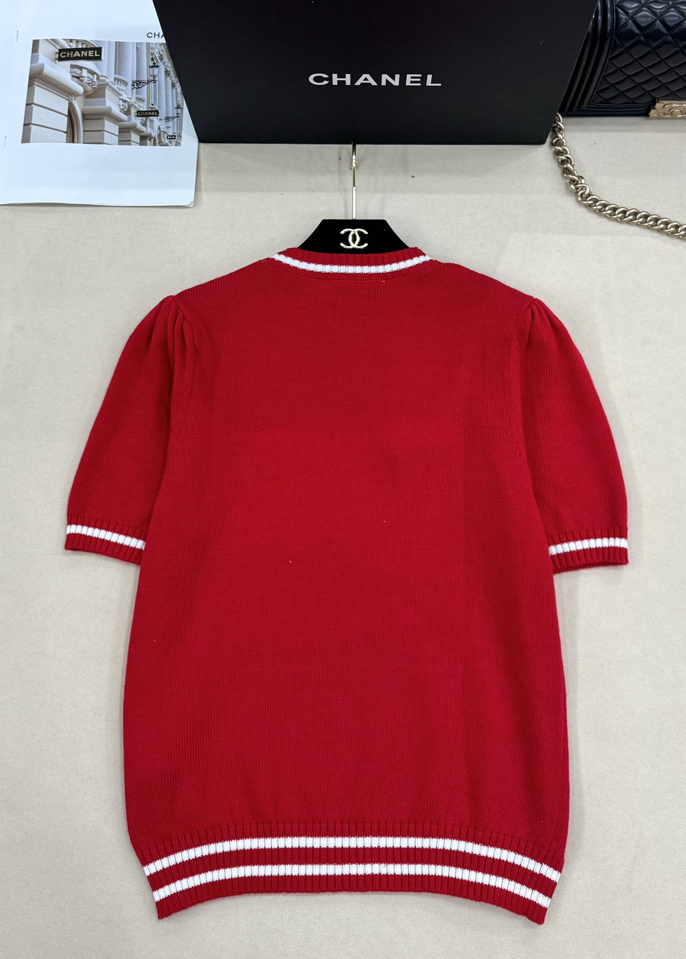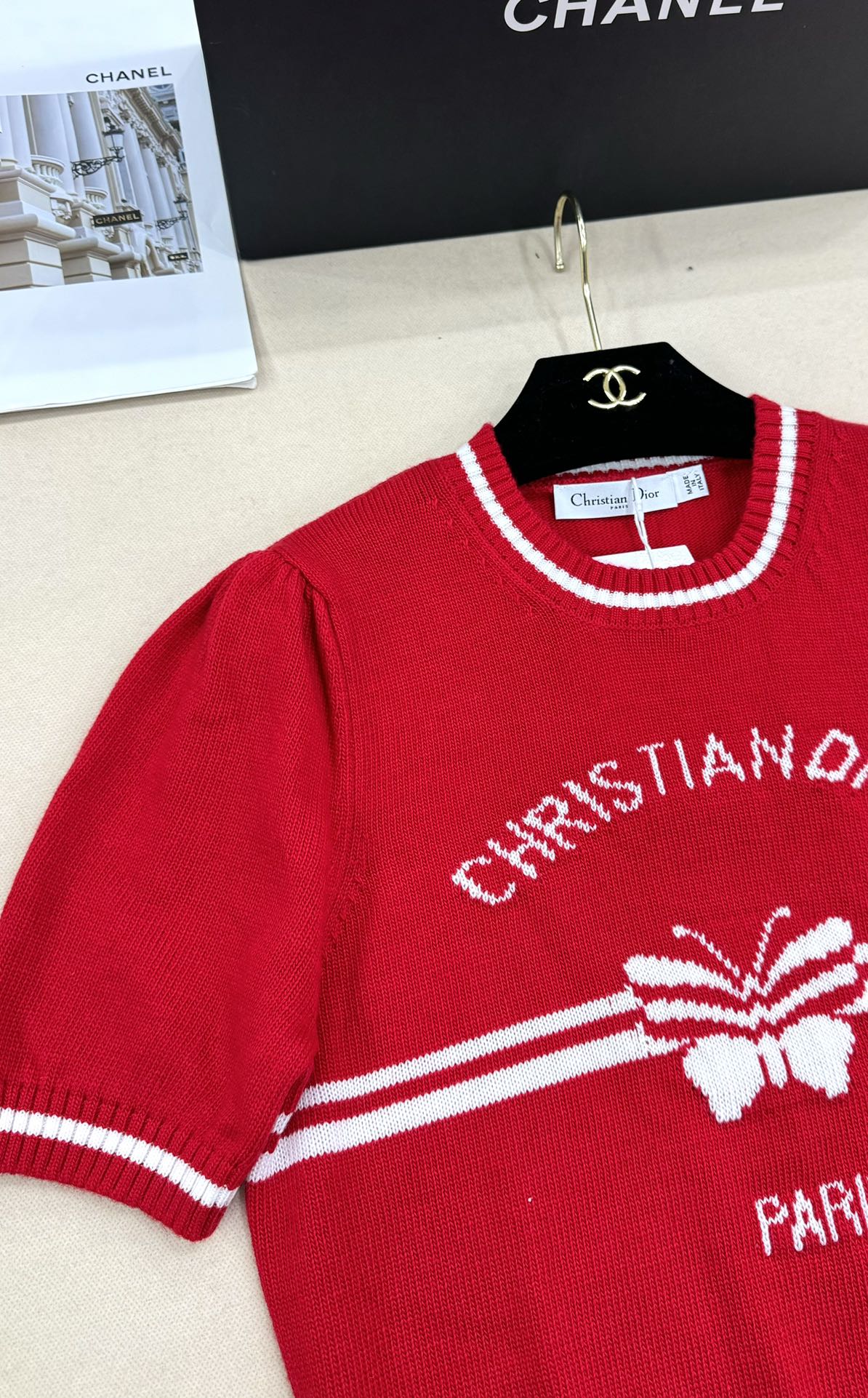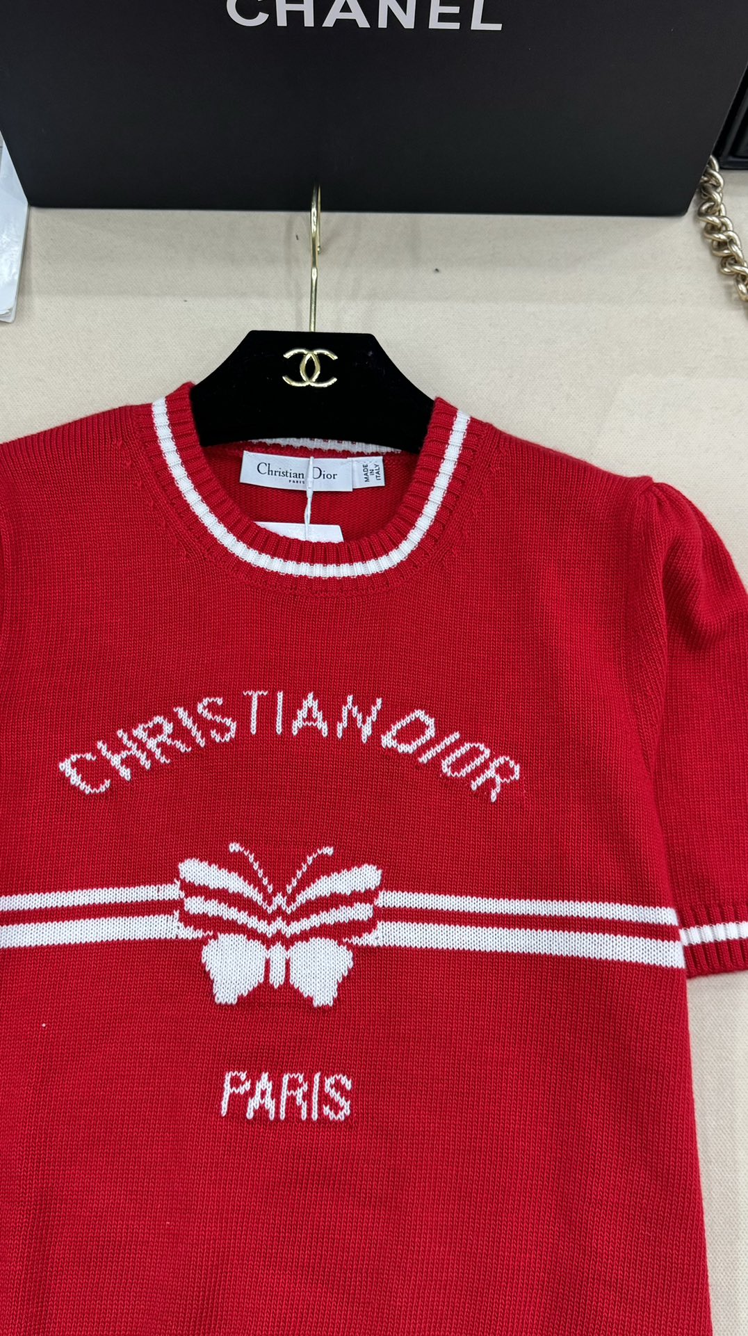 Details: New knit round-neck short sleeve with CHRISTIAN letters and butterfly embroidery, vibrant red, sizes S-L. High-end customization, exquisite craftsmanship