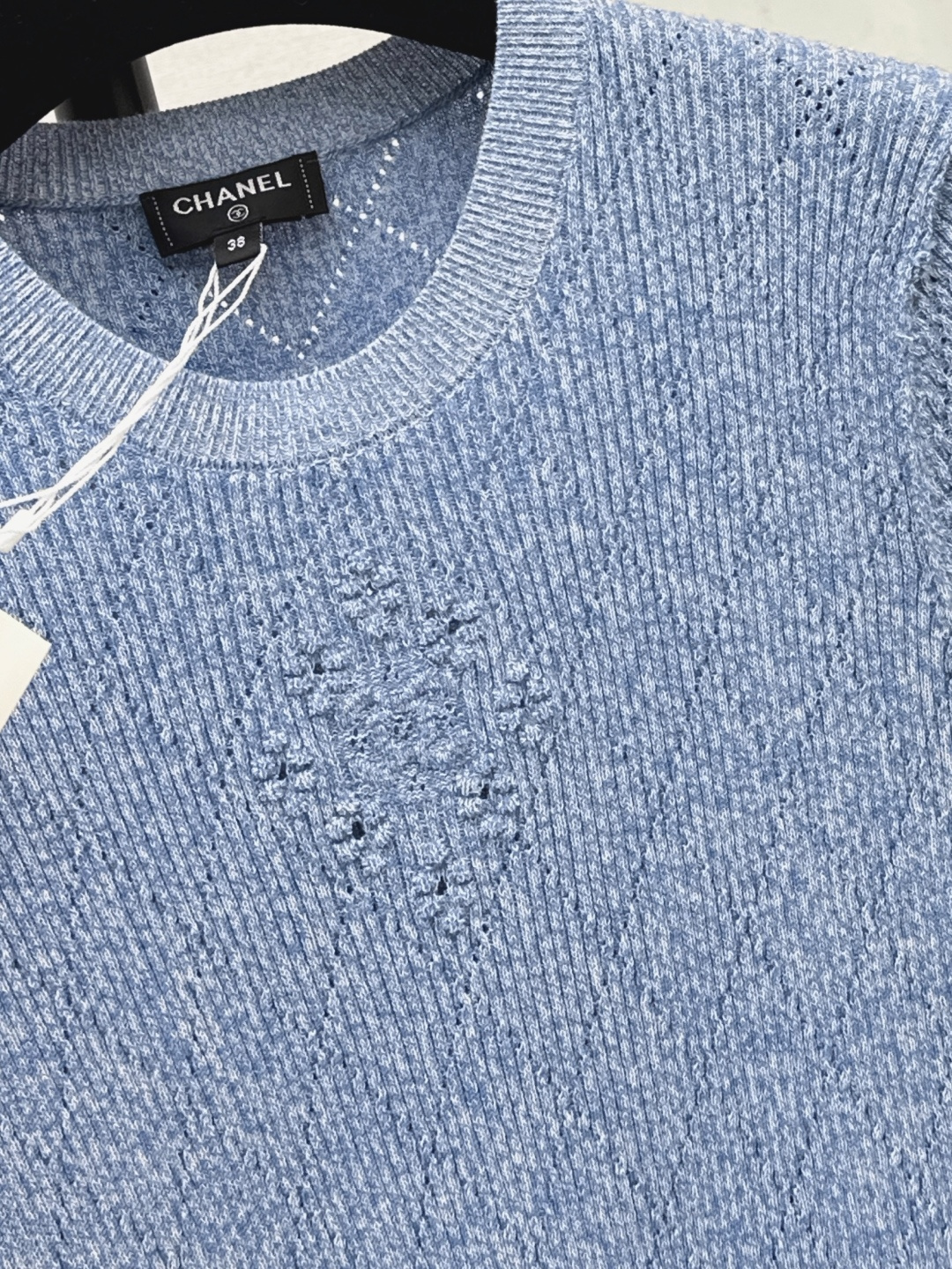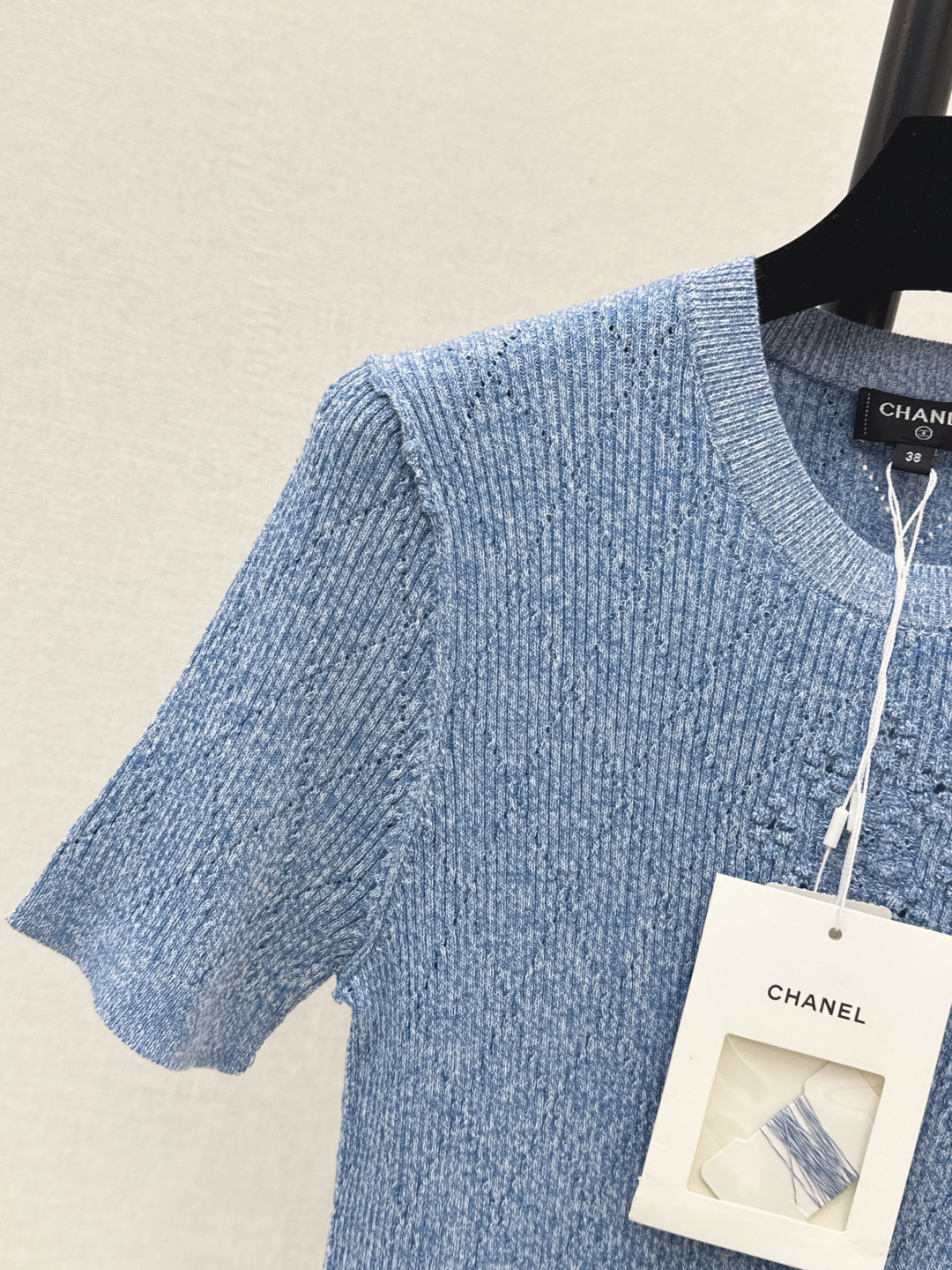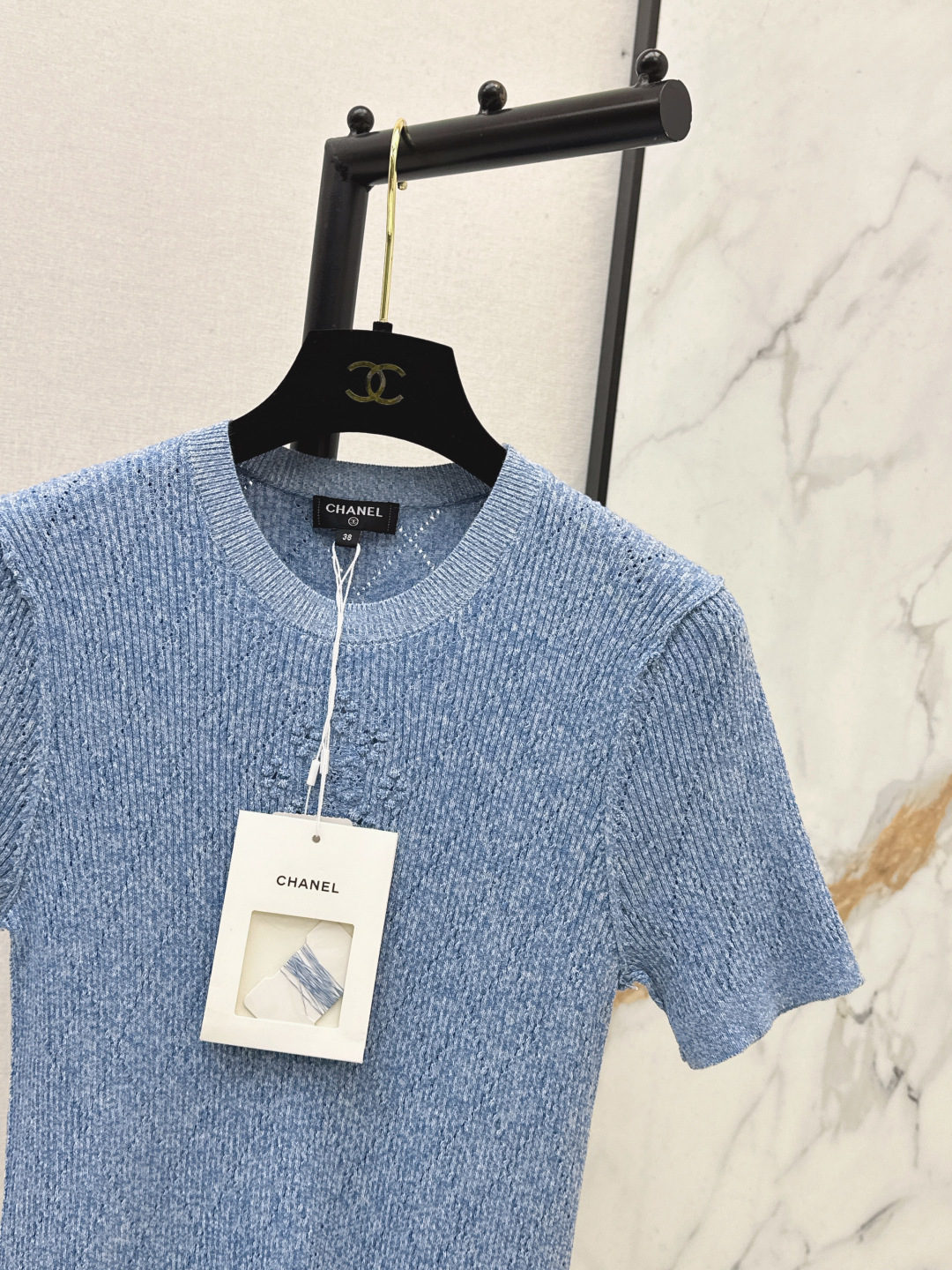 Details: Knitted short-sleeved top for early spring, featuring a lattice design and flower logo, both comfortable and flattering.