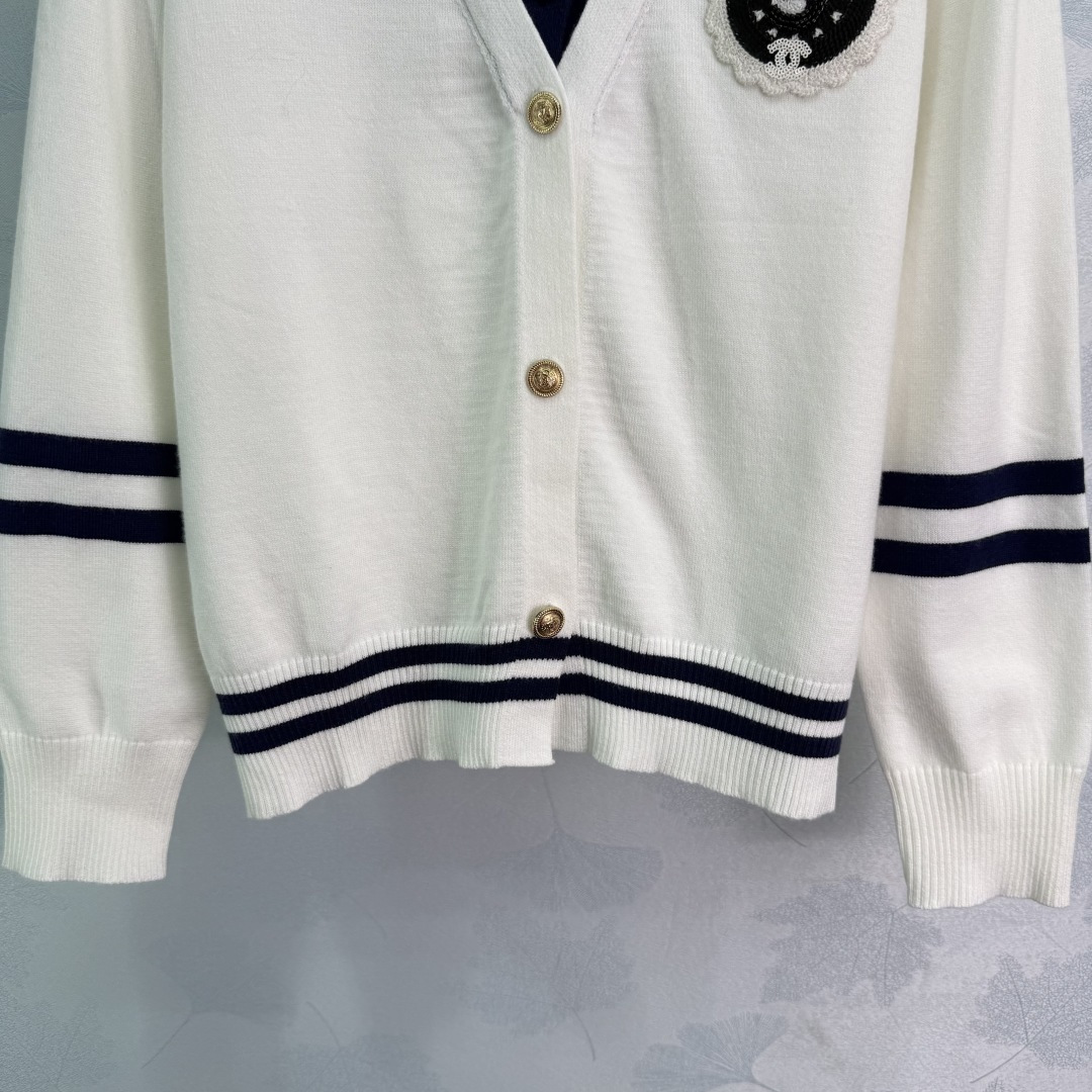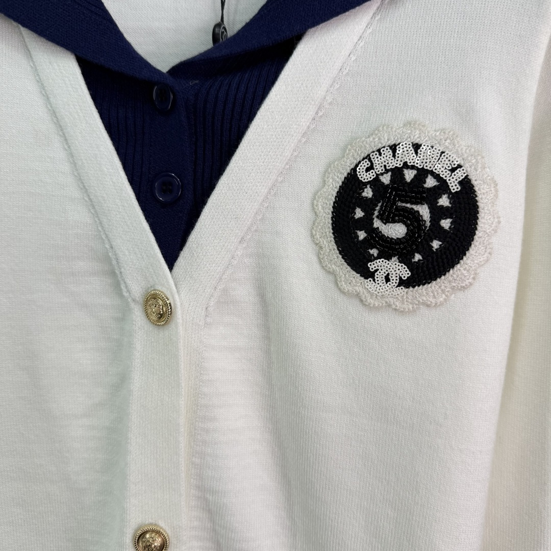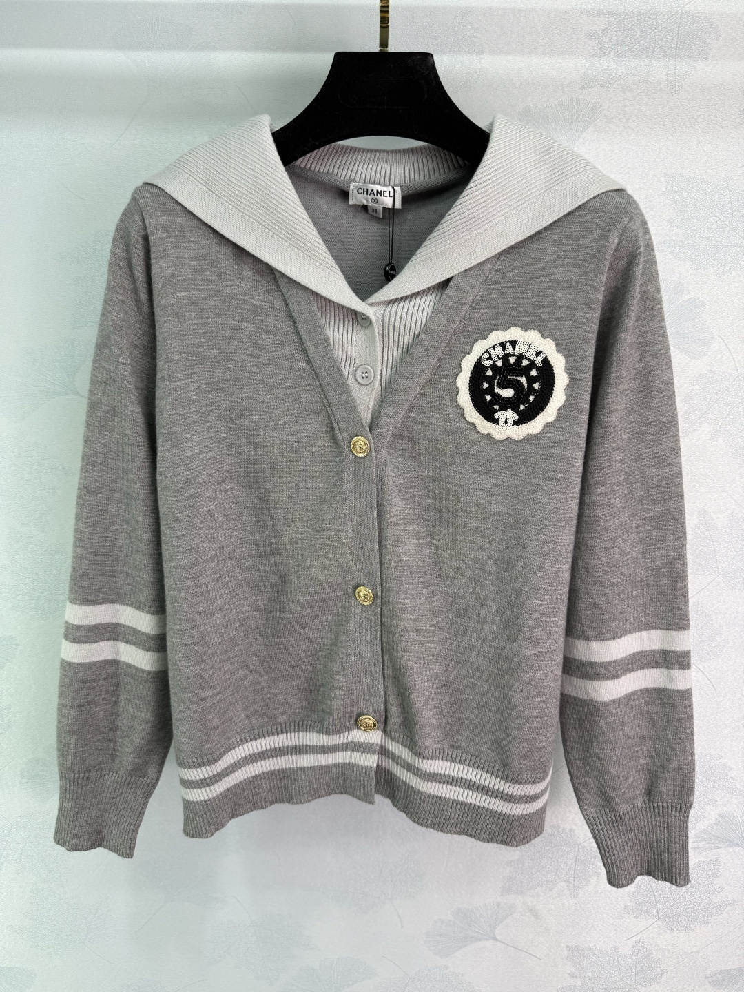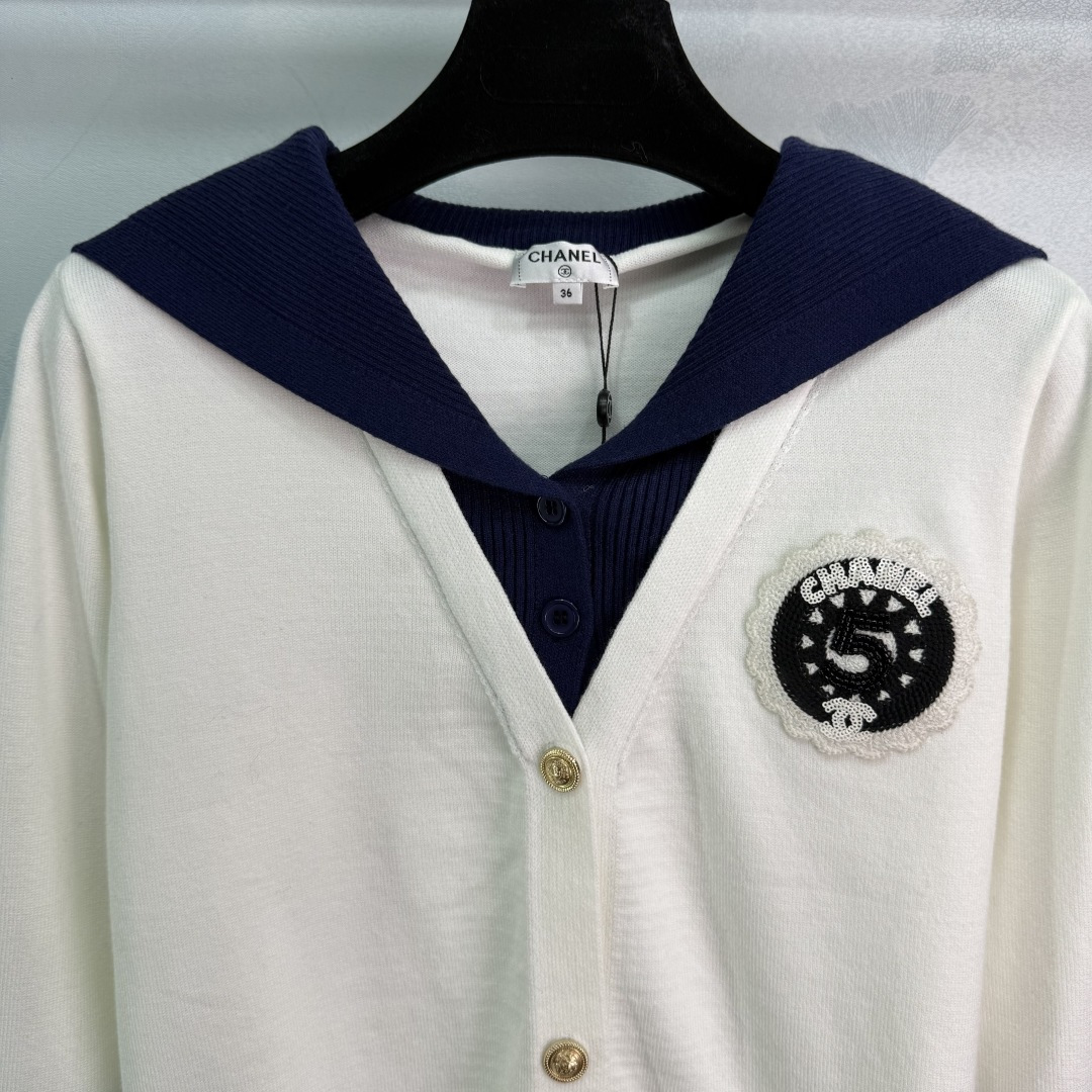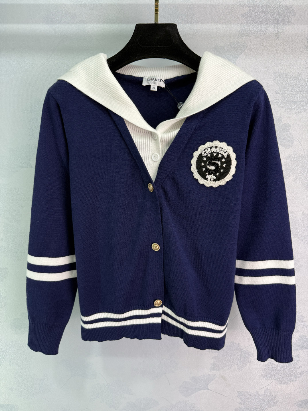 Details: Early Autumn New College Style Fake Two-Piece Knit Cardigan, Sailor Collar, Circular Embroidered Badge, Gold Buttons, Striped Cuffs