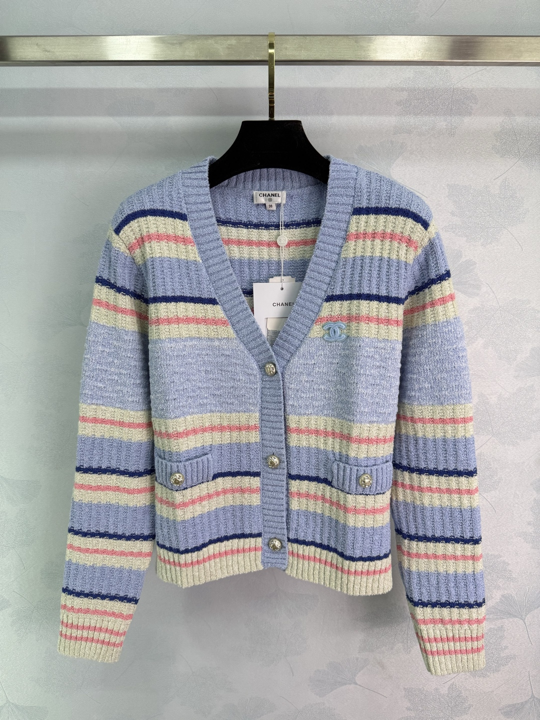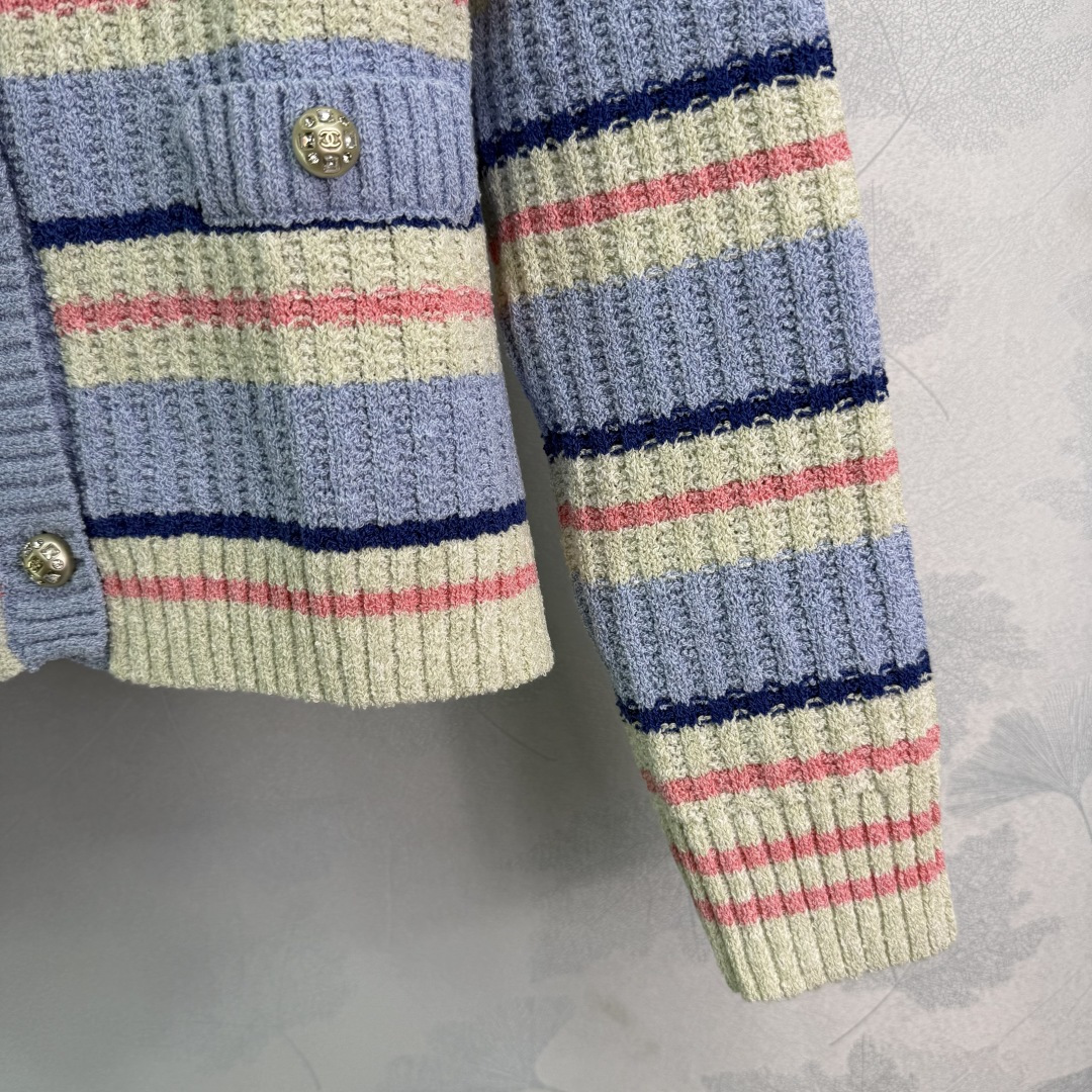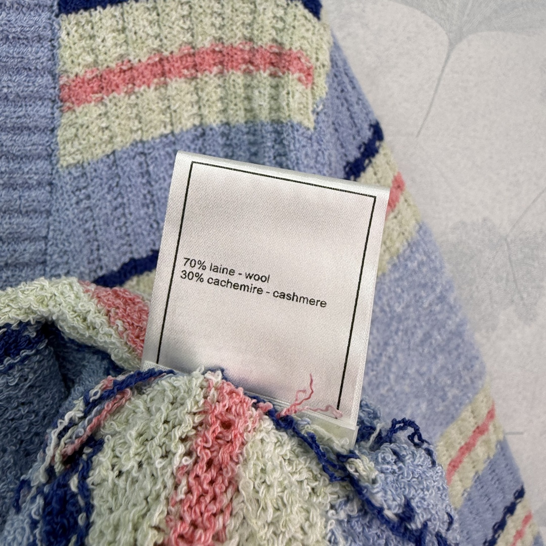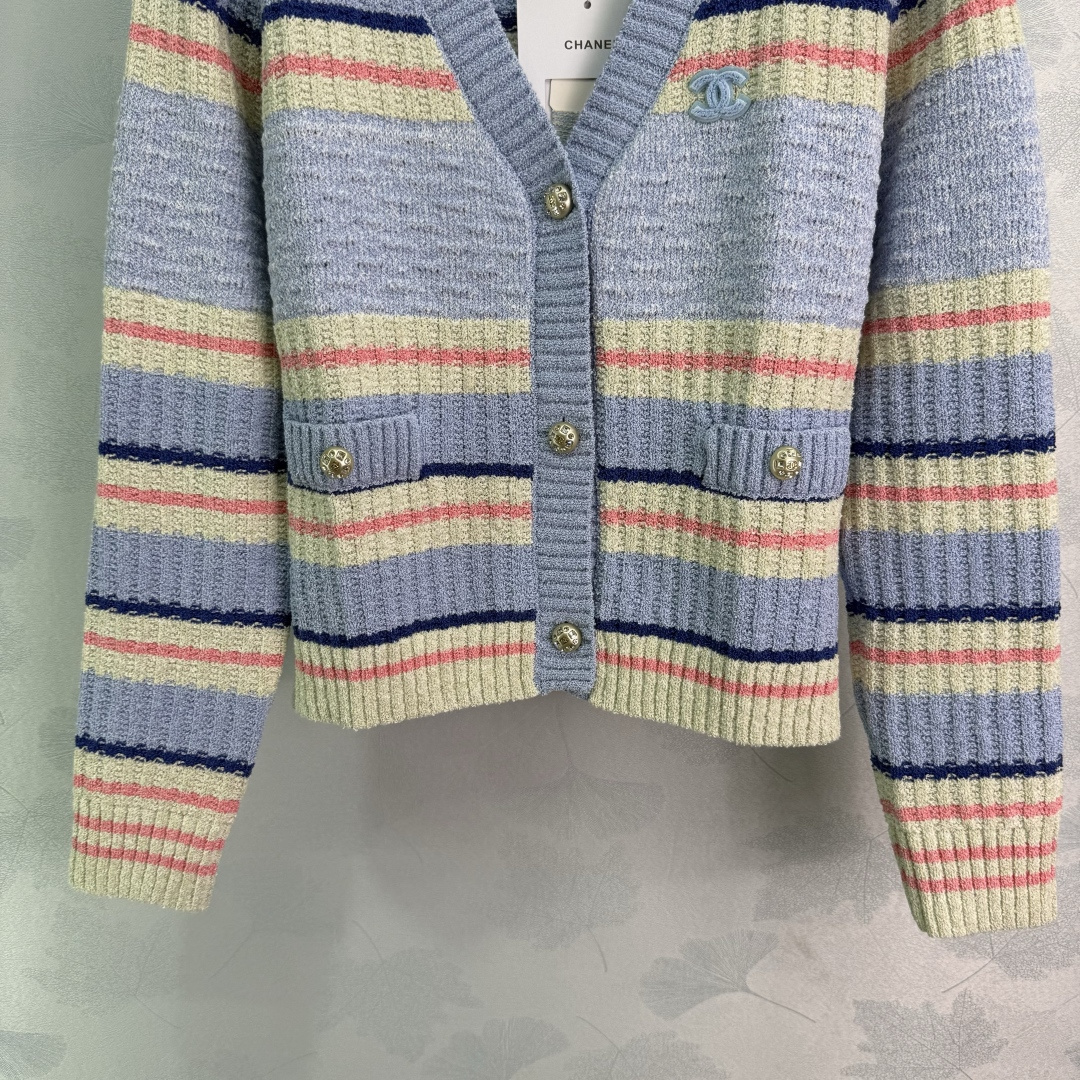 Details: Autumn/Winter Knit V-neck Cardigan with Colorful Stripes and Double C Logo, Simple and Fashionable, High-end Customization, Fine Workmanship