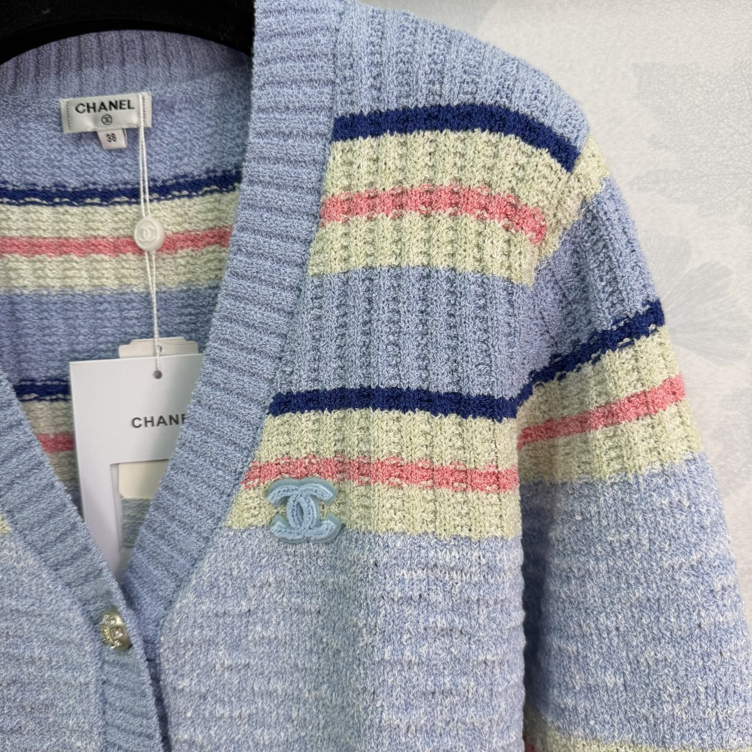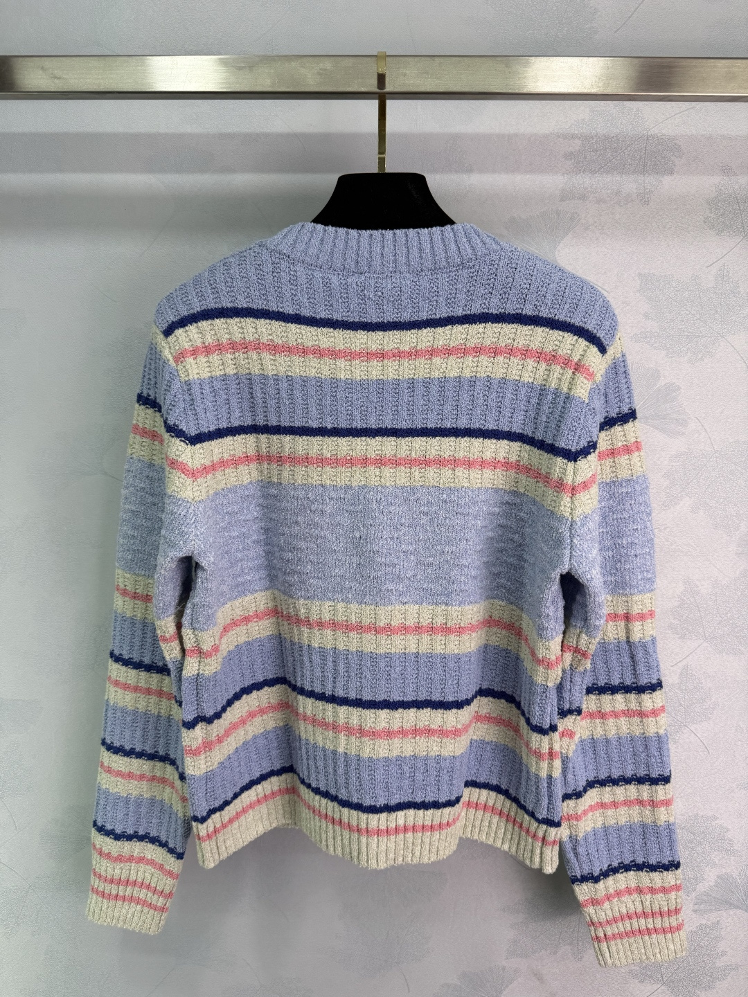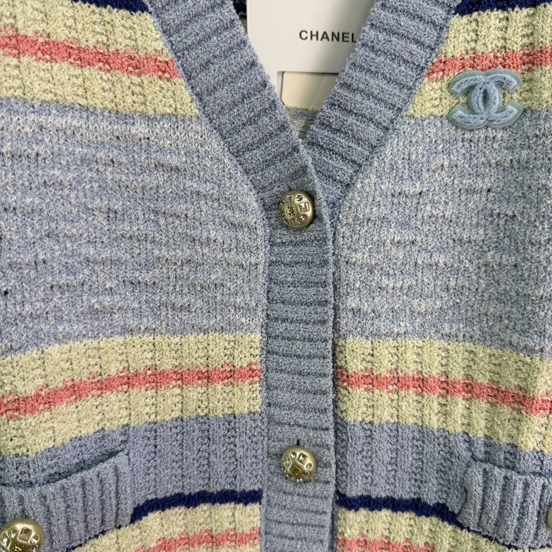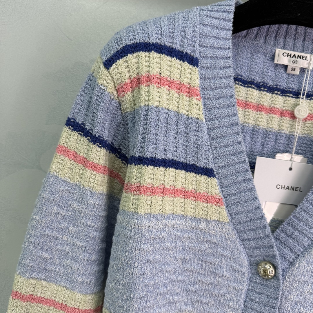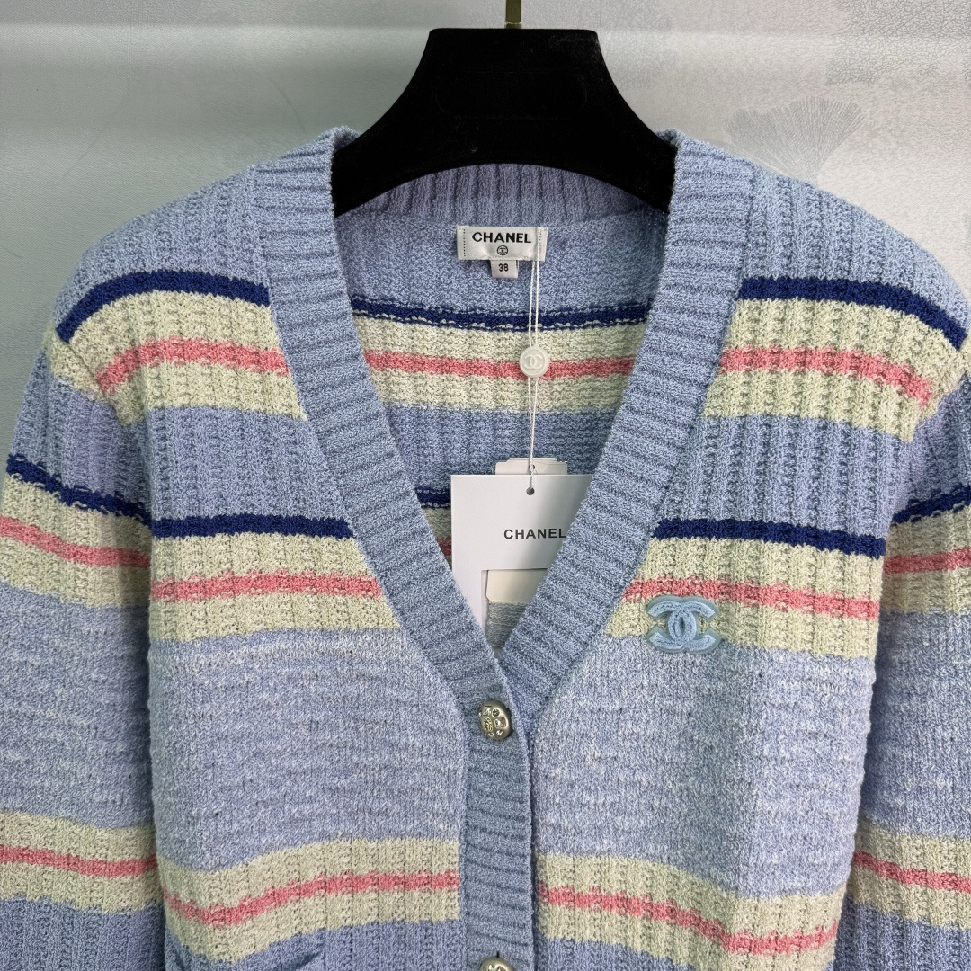 Details: Autumn/Winter Knit V-neck Cardigan with Colorful Stripes and Double C Logo, Simple and Fashionable, High-end Customization, Fine Workmanship