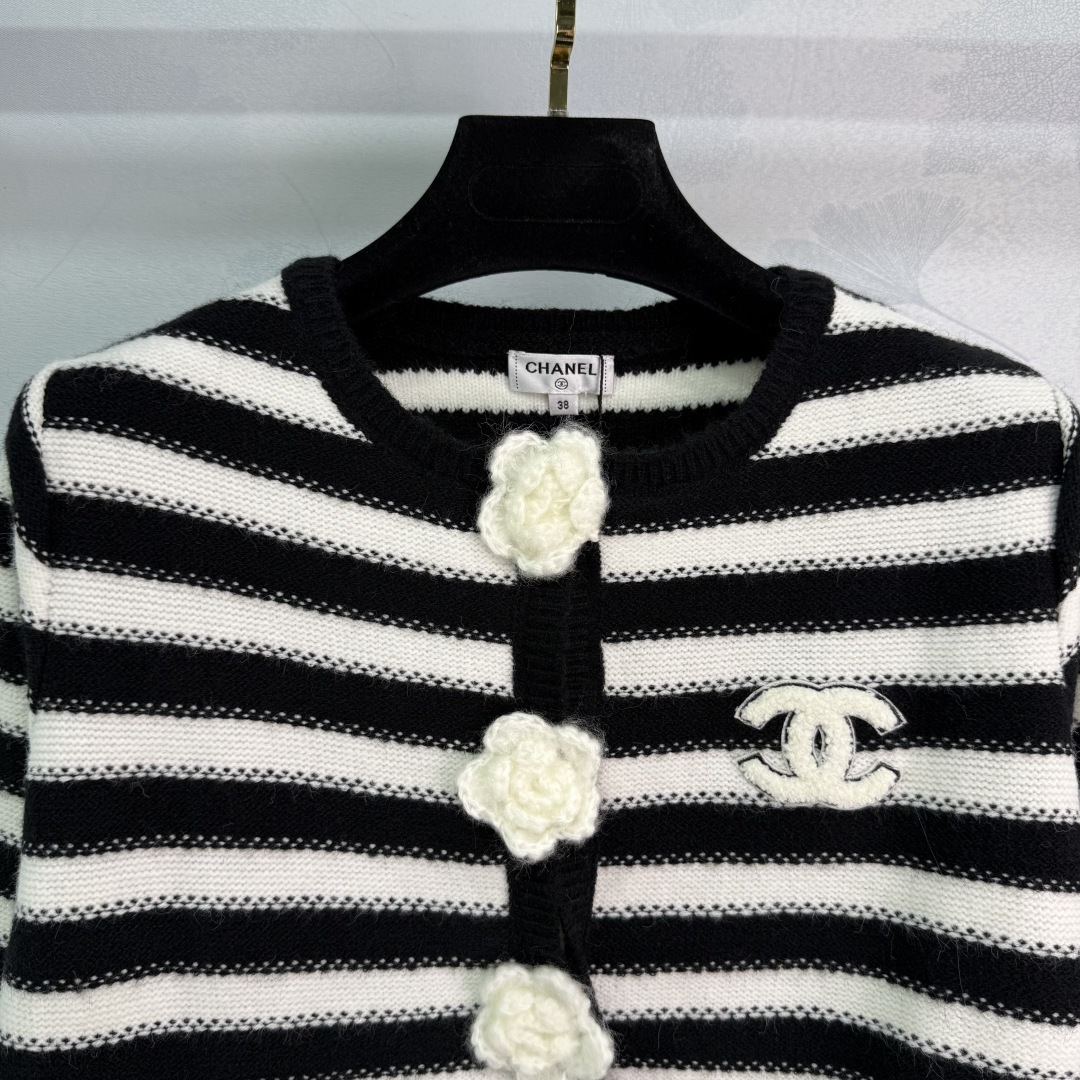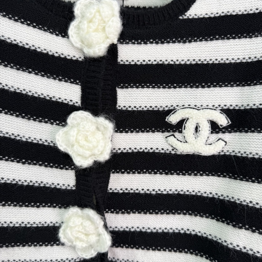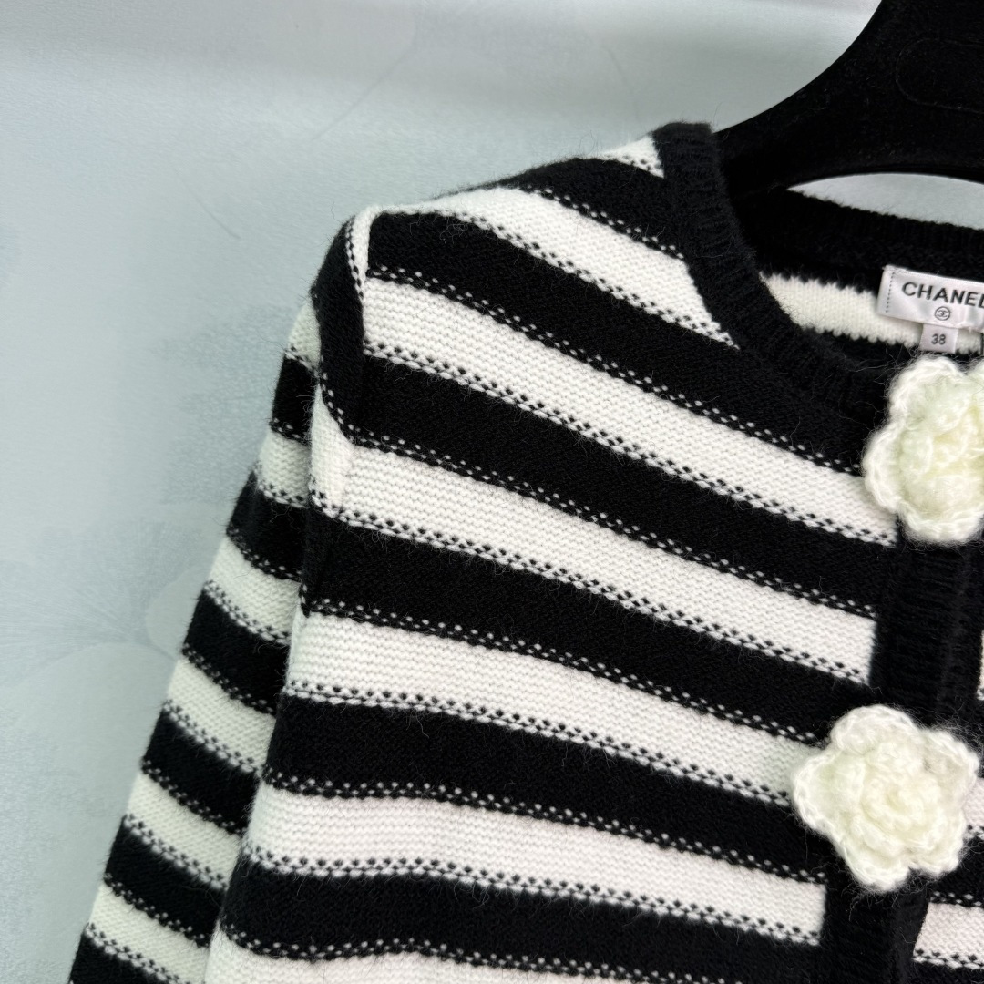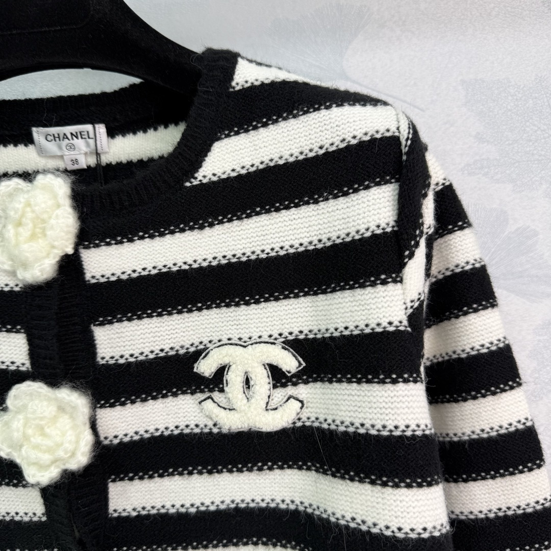 Details: Early Autumn Black and White Striped Knit Cardigan with Camellia Button and CC Logo, Suitable for All Seasons, High-end Customization, Fine Workmanship