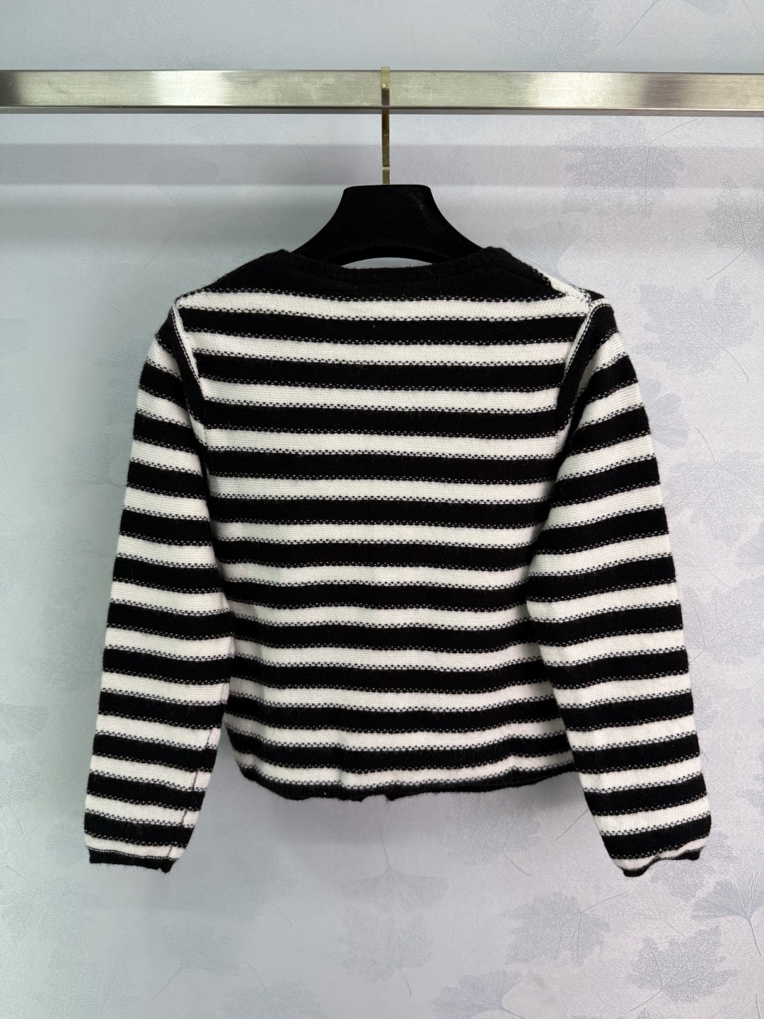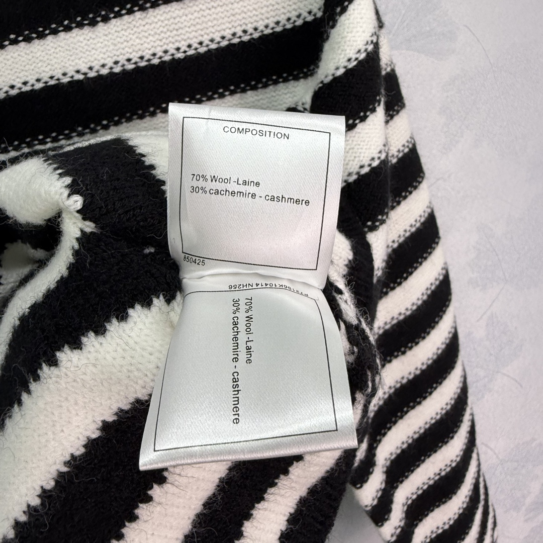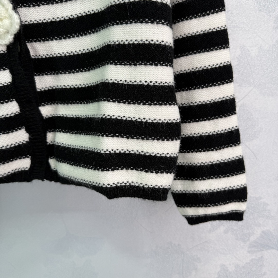Details: Early Autumn Black and White Striped Knit Cardigan with Camellia Button and CC Logo, Suitable for All Seasons, High-end Customization, Fine Workmanship