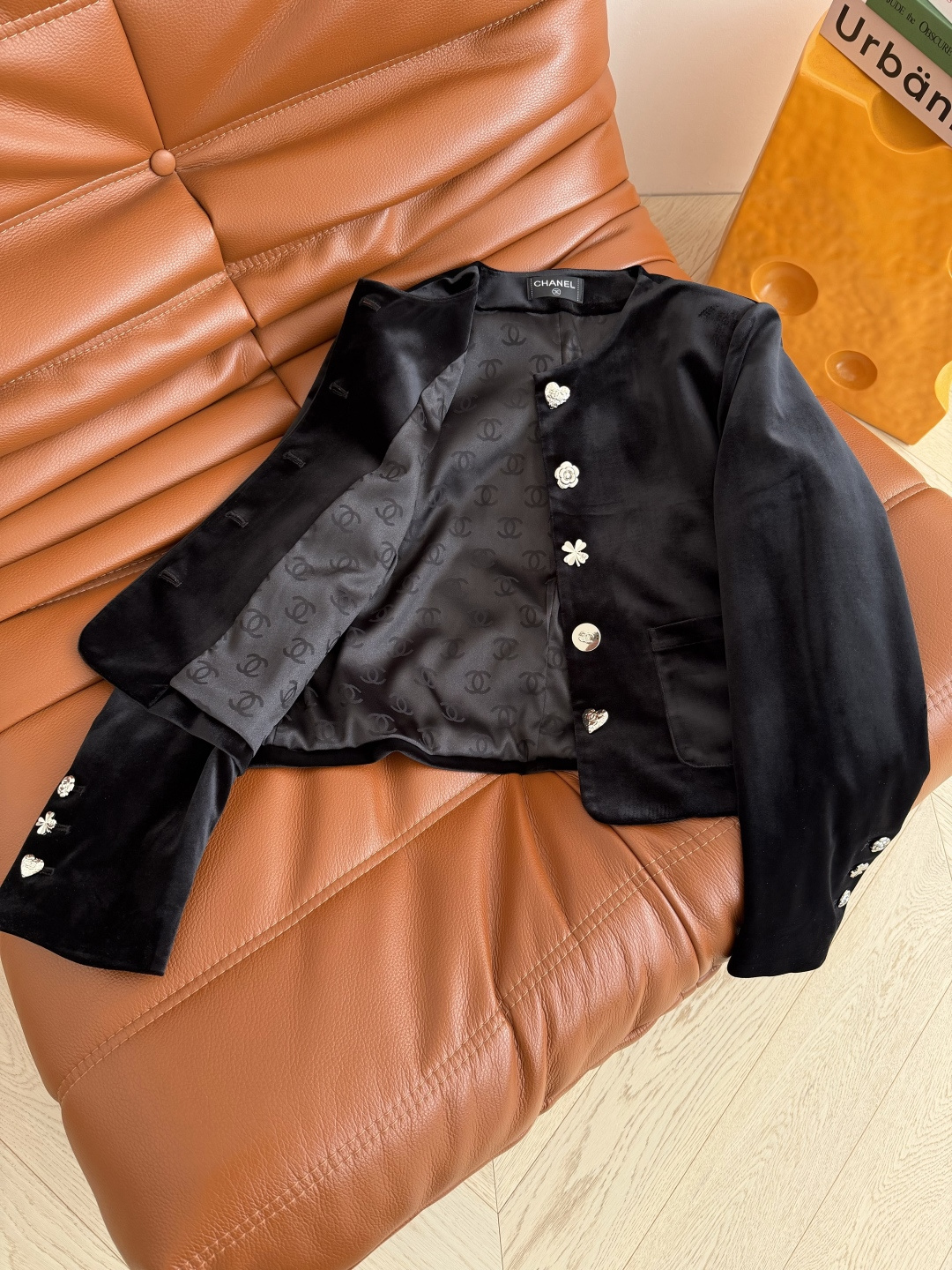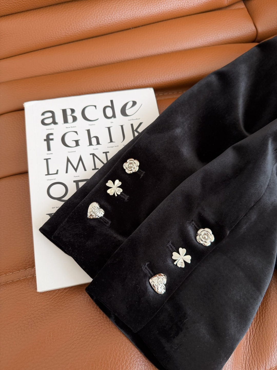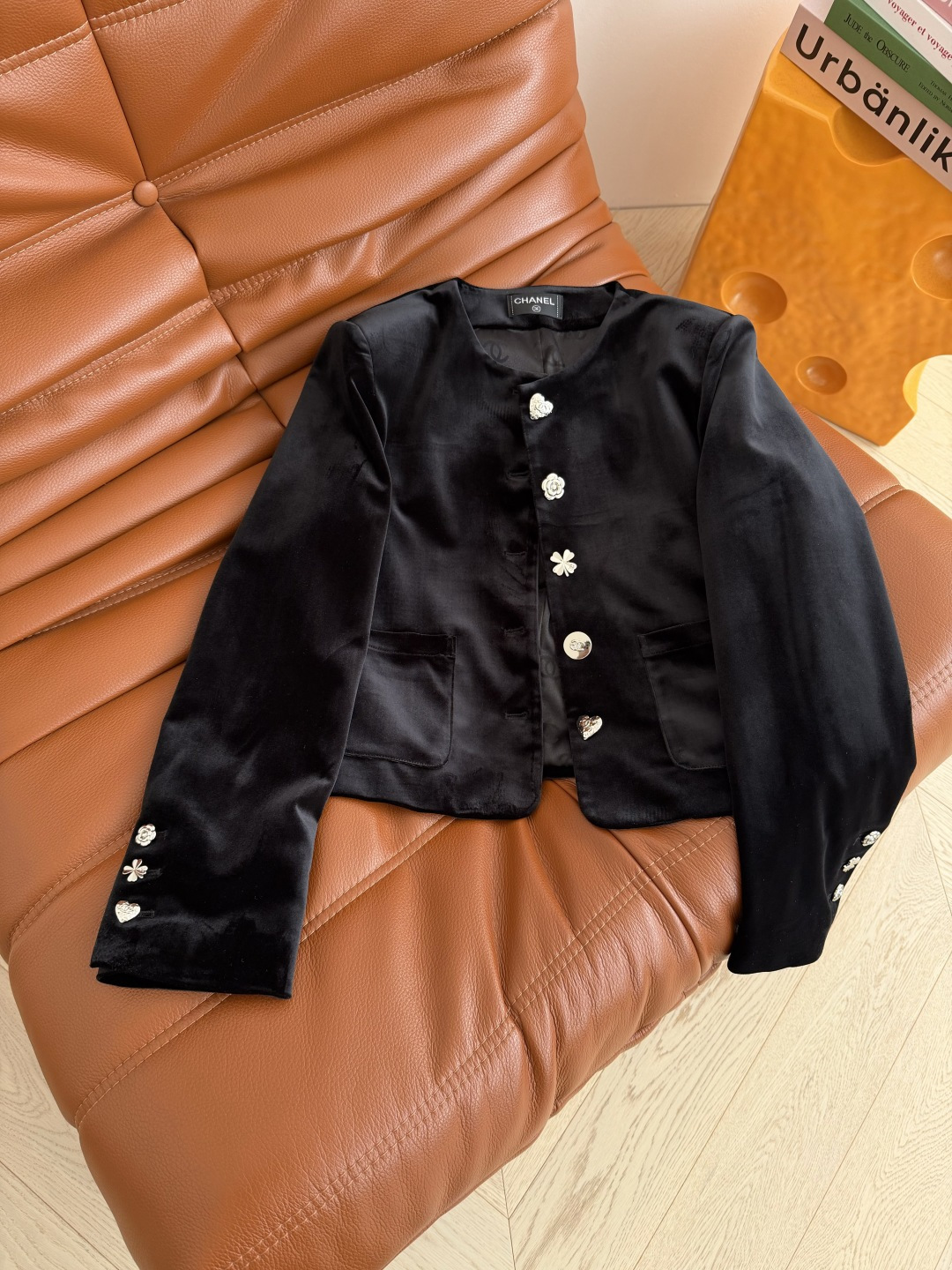 Details: Spring velvet coat with double C buttons, boxy style, suitable for all occasions.